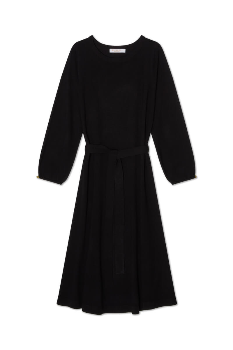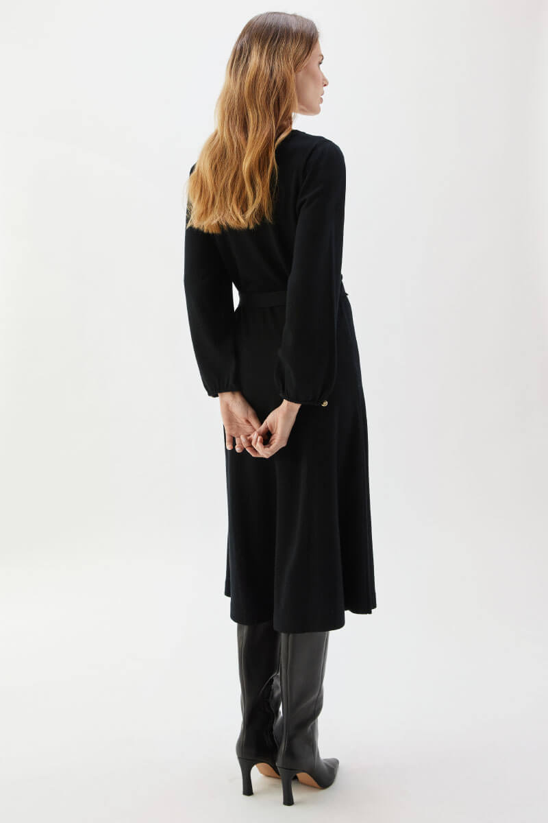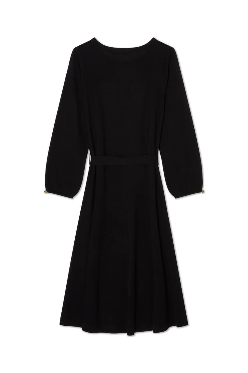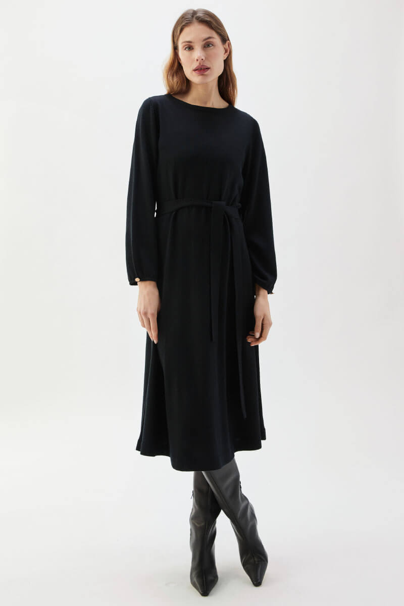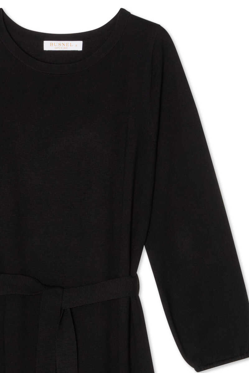 En svart stickad midiklänning med knyt i midjan och ledig passform är definitionen av avslappnad elegans. Styla med höga stövlar och kappa för en sofistikerad look, eller addera sneakers och trenchcoat för en modern och självsäker vardagsstil.Stickad klänning i mjuk merino ull med rund halsringning, ballongärmar, matchande bälte i midjan och ledig passform från Busnel.