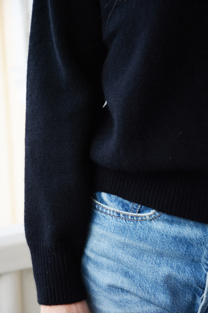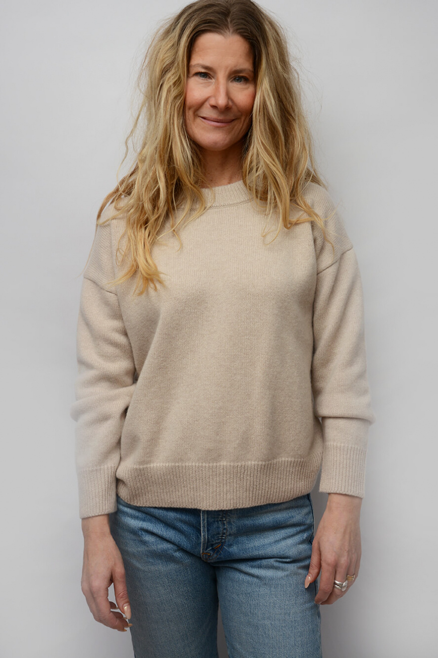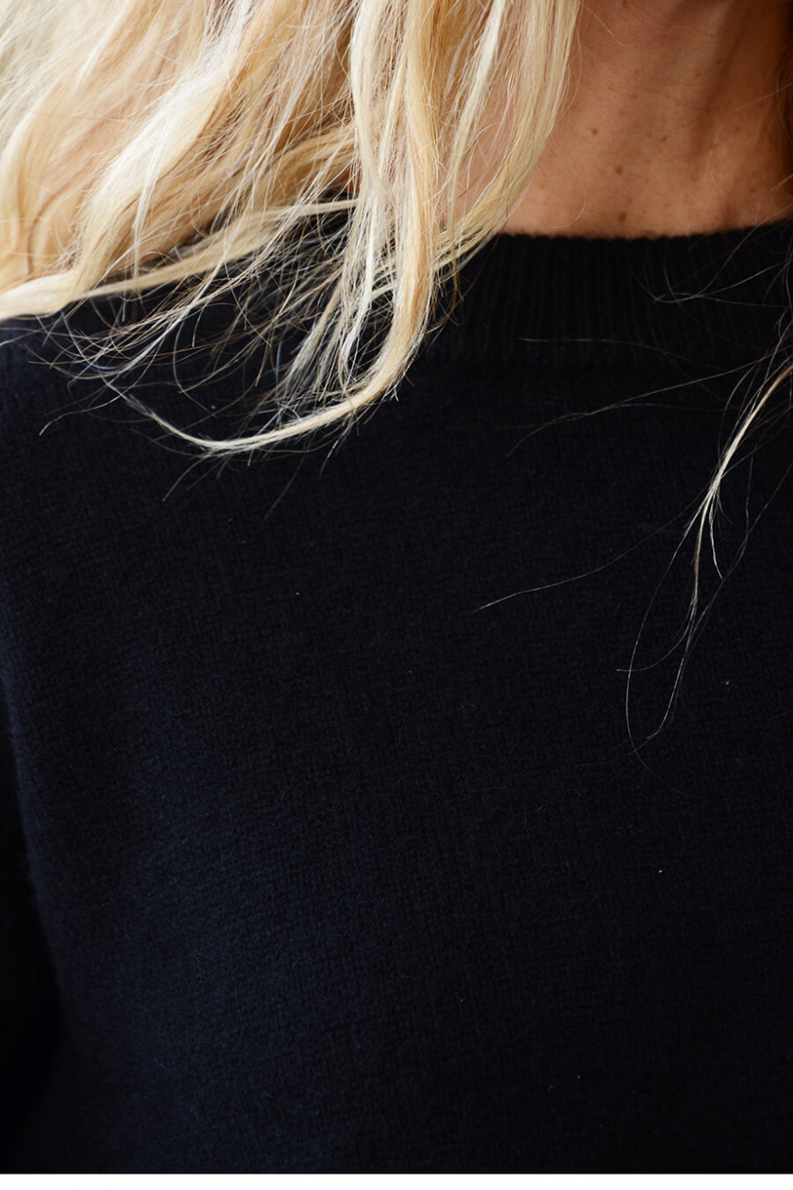 En lyxig lite mer matig stickad tröja från Elin Maria Studio i 100% royal cachmere (Good Cashmere Standard). Enkel klassisk modell där du tar din vanliga storlek om du vill ha den som modellen bär den. Ribbad halsringning och nederkant. Tröjan har lite droppad axelsöm och lite mer rymd i kroppen.Är du mellan storlekar gå upp en.