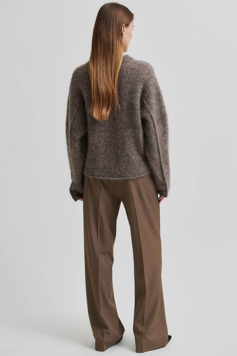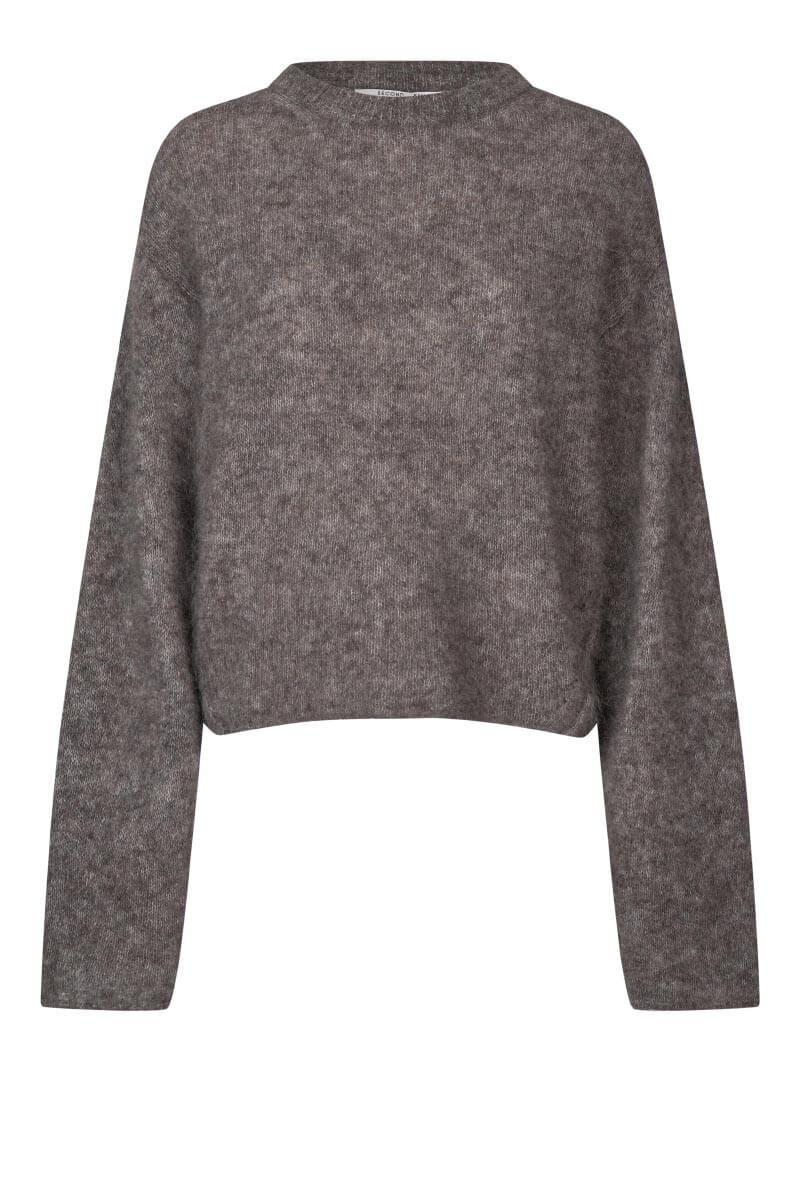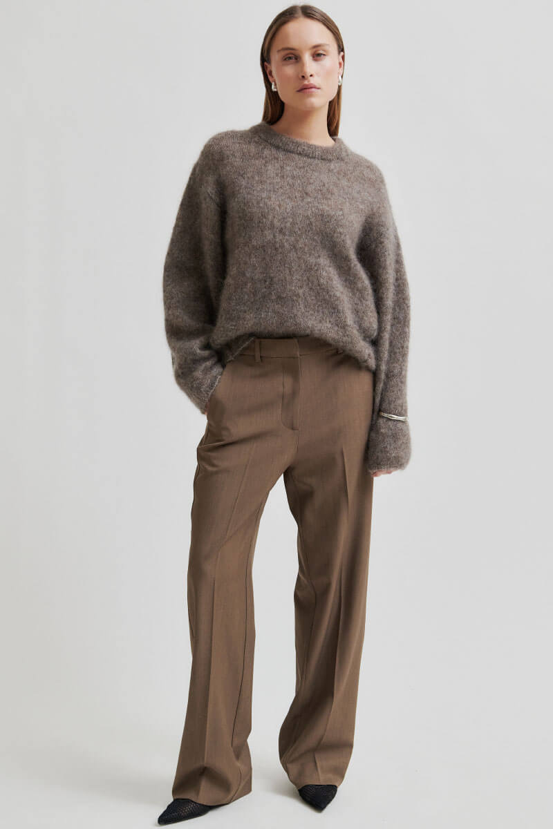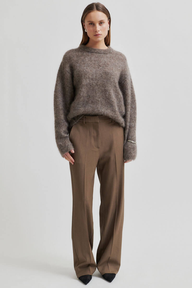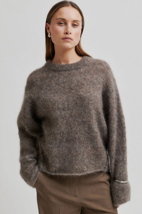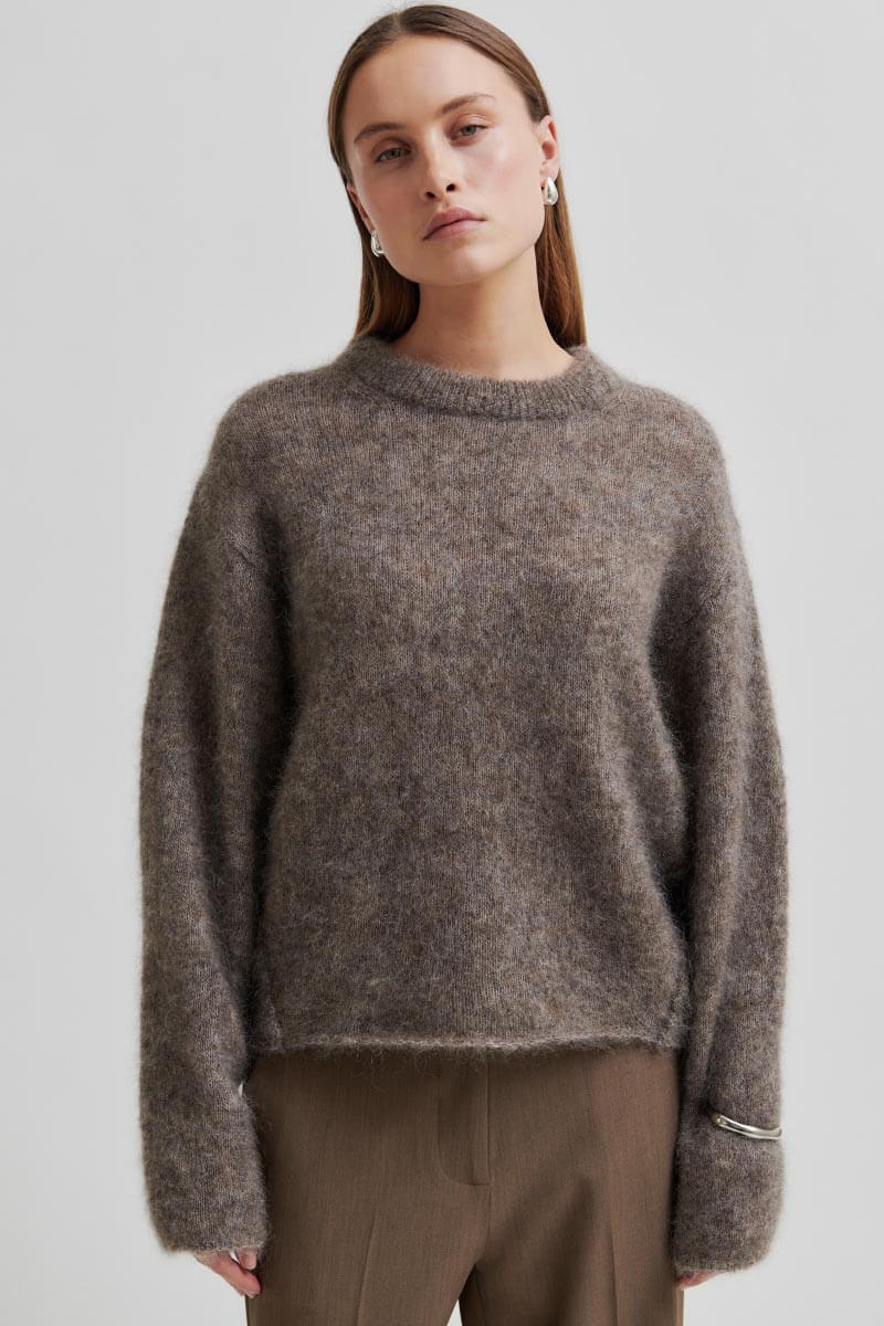 Brun melerad stickad tröja i lyxig mohairblandning med rund hals och avslappnad passform. Perfekt till skräddade ullbyxor och loafers för en elegant dagstil, eller över satinklänning med stövlar för en oväntad, kontrastfylld höstlook.Stickad tröja i en fluffig mohairblandning med rund hög halsringning, lös passform, fallande axelsömmar och sömmar på ärm bak från Second Female.