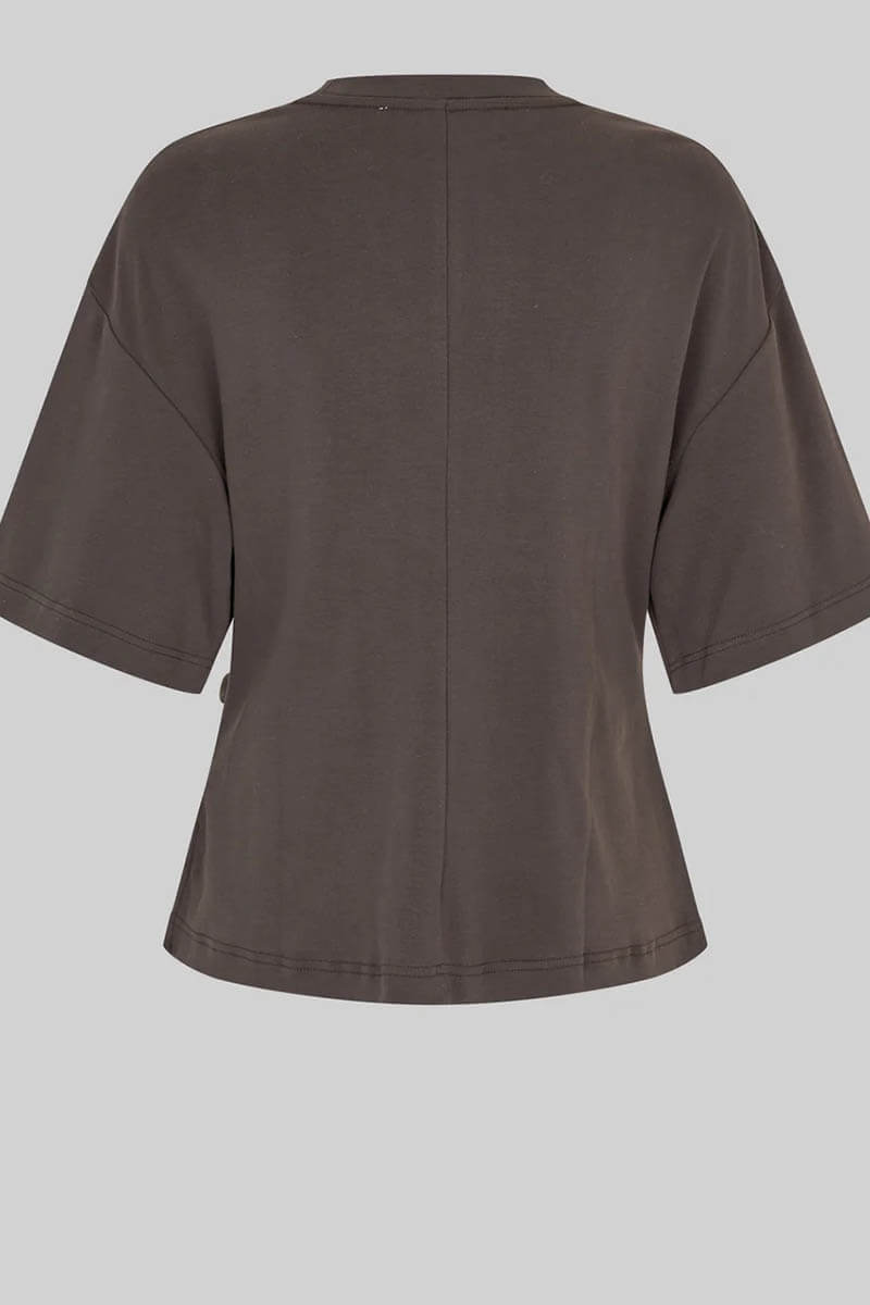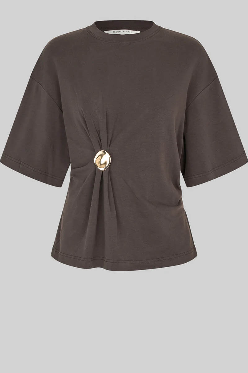 T-shirt med rund halslinje, sänkta axlar och en smickrande rynkdetalj i sidan. Plagget pryds av en avtagbar guldfärgad brosch som ger en skräddarsydd känsla.