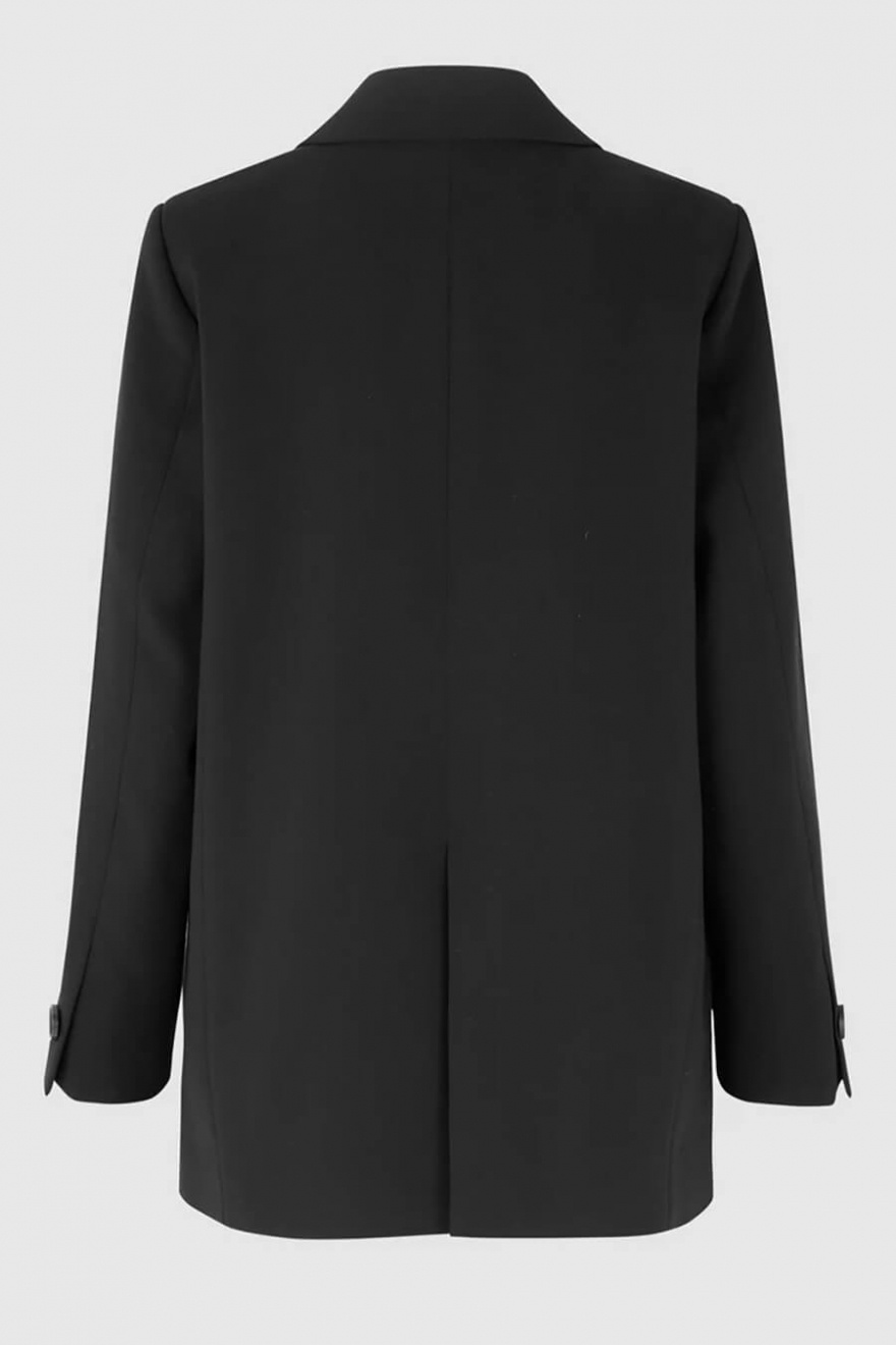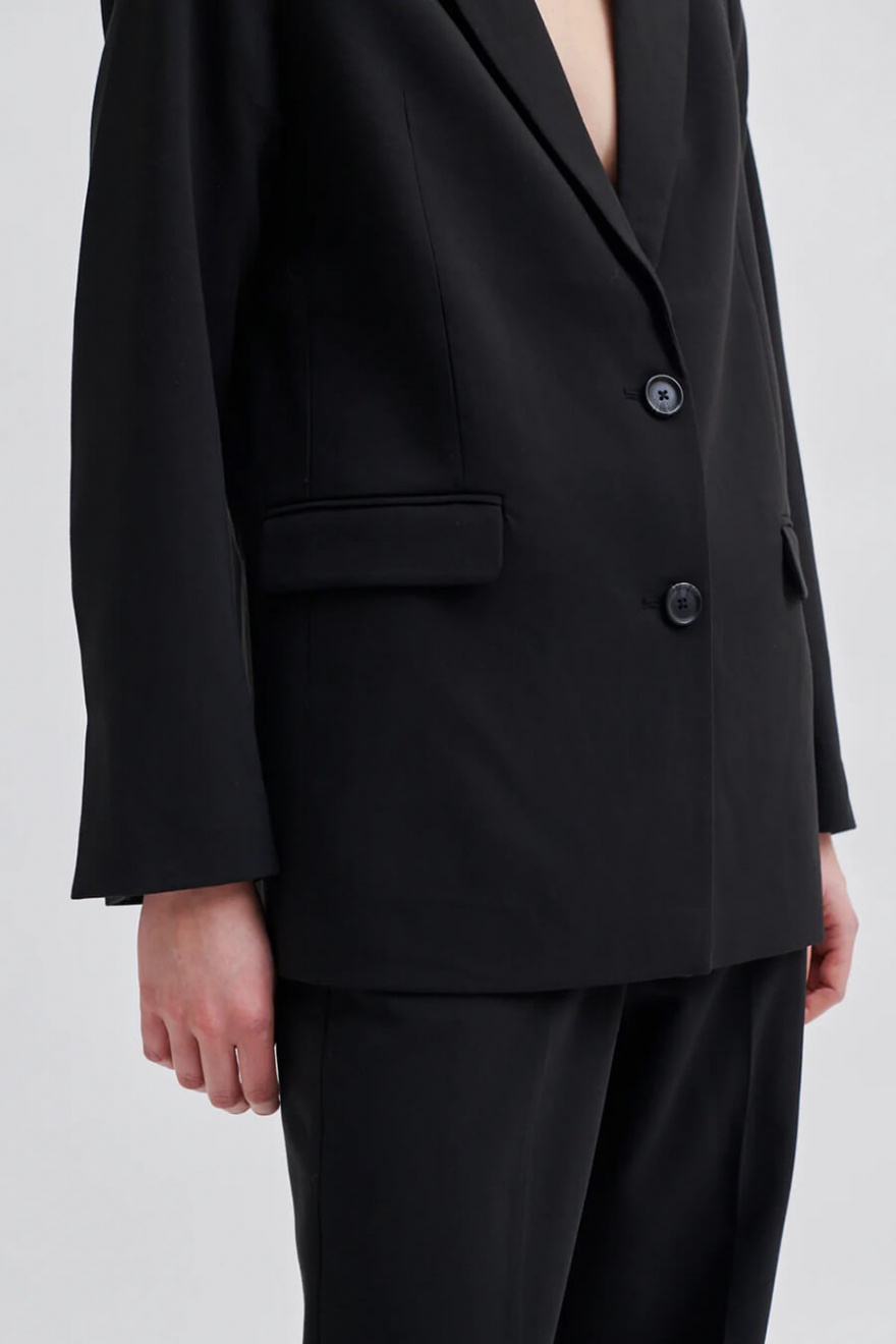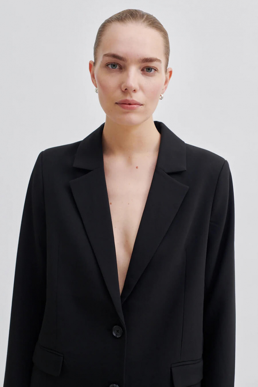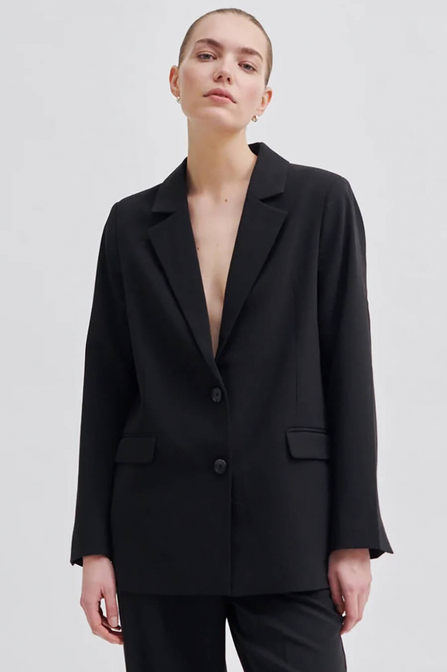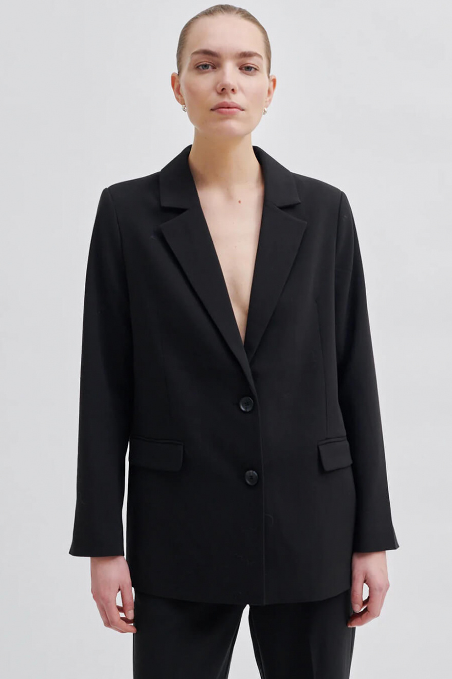 Denna svarta kavaj erbjuder en modern silhuett med sina rena linjer och avslappnade passform. De skräddade detaljerna ger en sofistikerad känsla, perfekt för att höja varje outfit. En tidlös klassiker!Kavaj i en avslappnad passform med fickor fram, slits bak, stängs med knappar fram och lätt vadderade axlar från Second Female.