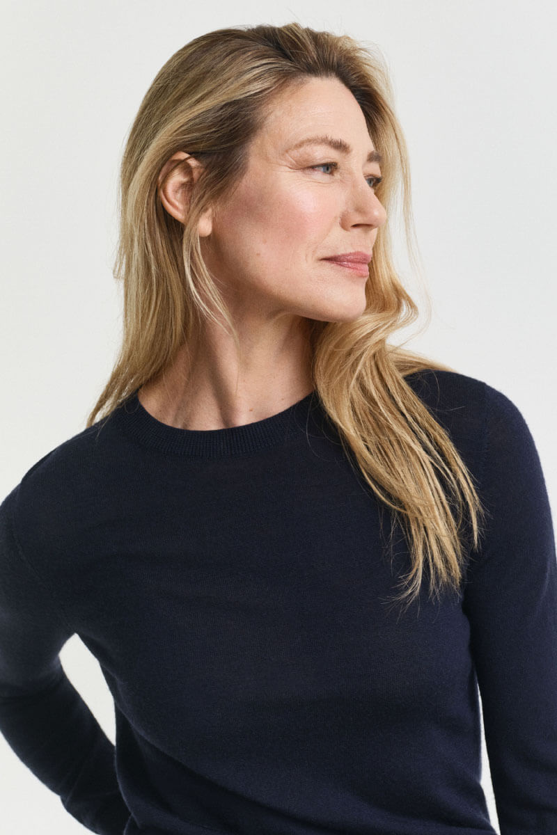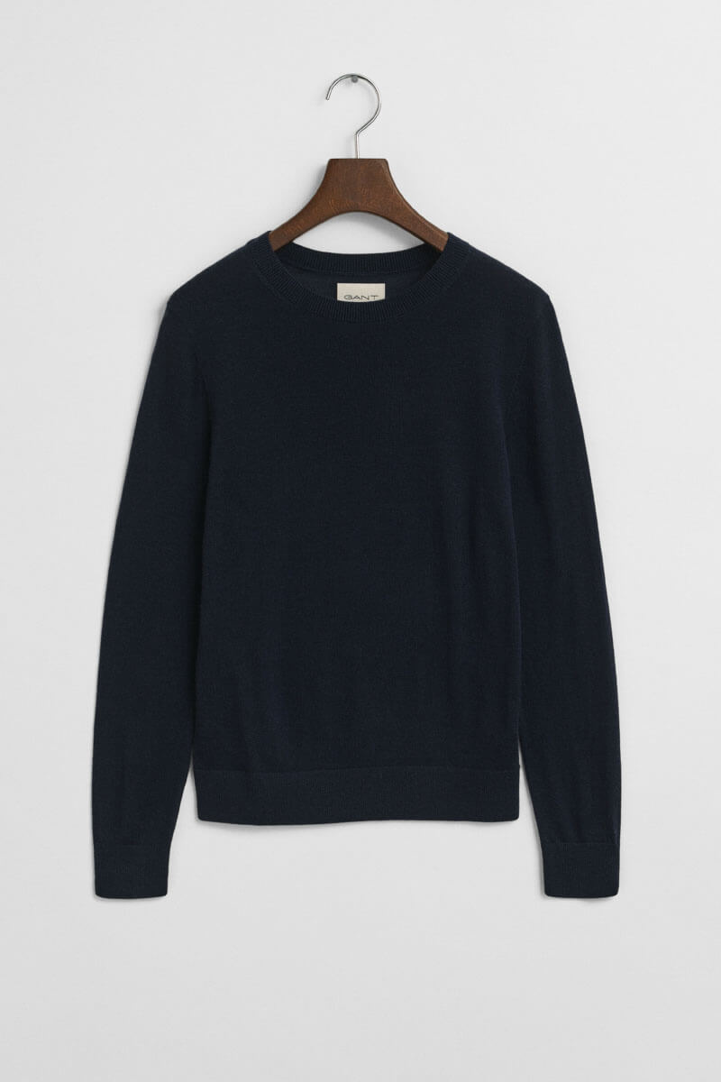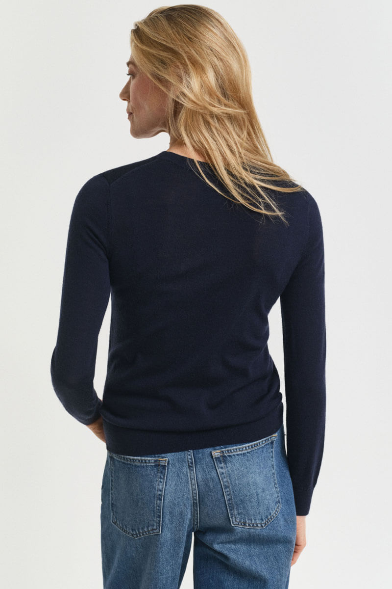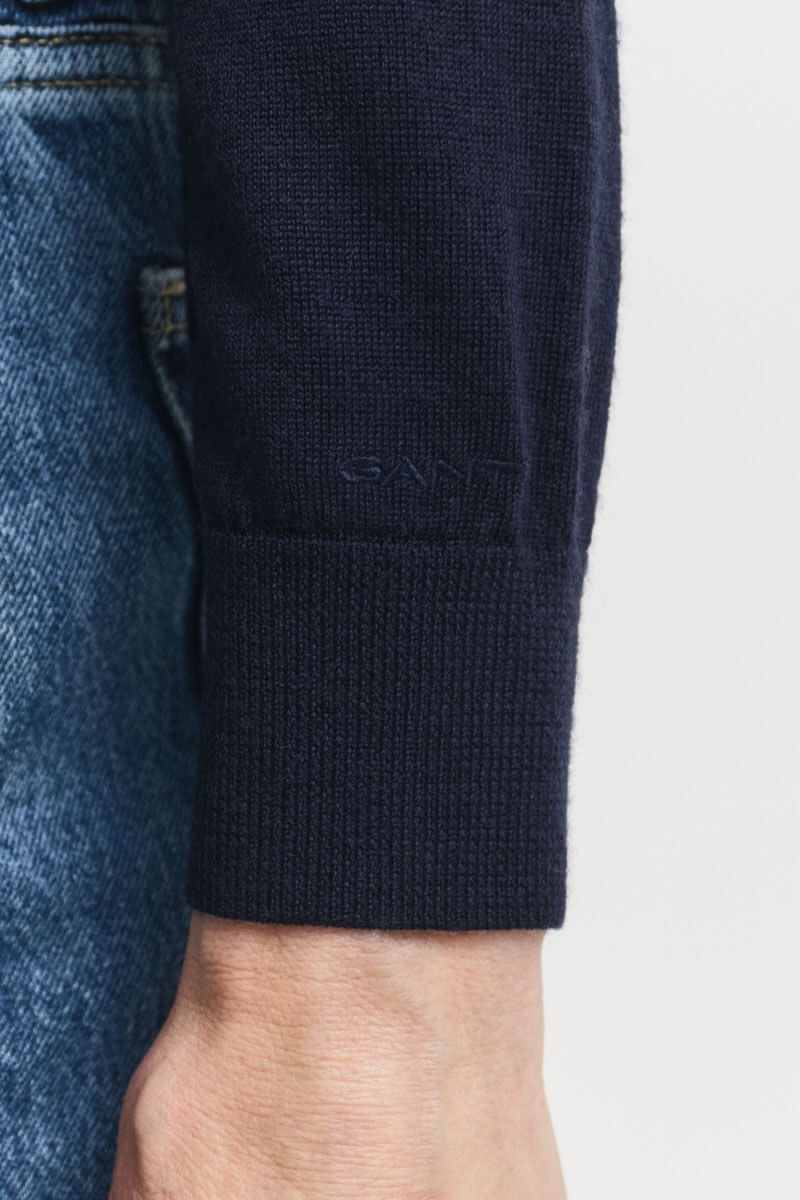 En stickad mörkblå tunn tröja i smal passform och rund halsringning är nyckeln till en elegant men avslappnad look. Styla med kostymbyxor för modern minimalism eller låt den möta en volymig kjol för en lekfull kontrast – alltid självsäkert enkelt.Stickad tröja i mjuk merinoull med smal passform, rund halsringning, ribbstickade kanter och broderad logga vid ärmslut från Gant.