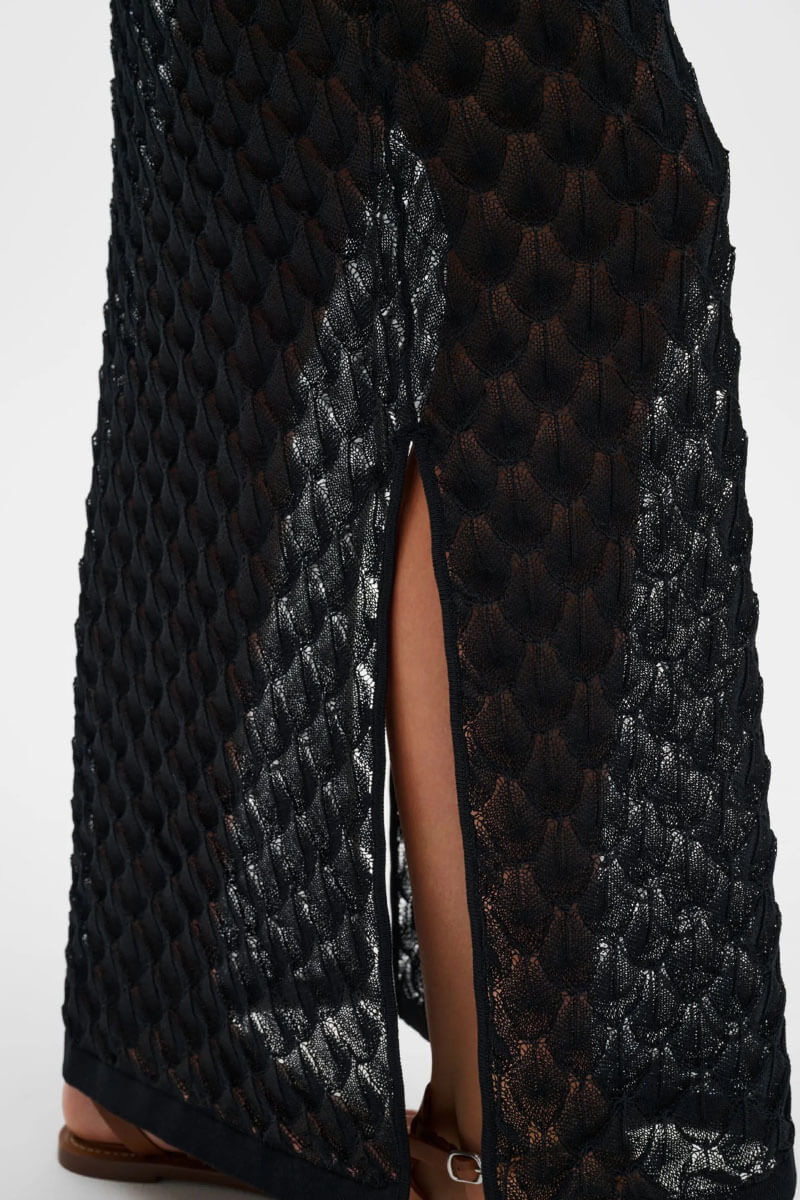En stickad maxikjol som kombinerar en feminin silhuett med hög komfort. Det dekorativa hålmönstret och den smickrande sidoslitsen skapar en modern och elegant look. Styla med tillhörande topp för ett komplett set eller med en enkel t-shirt för en mer avslappnad stil.