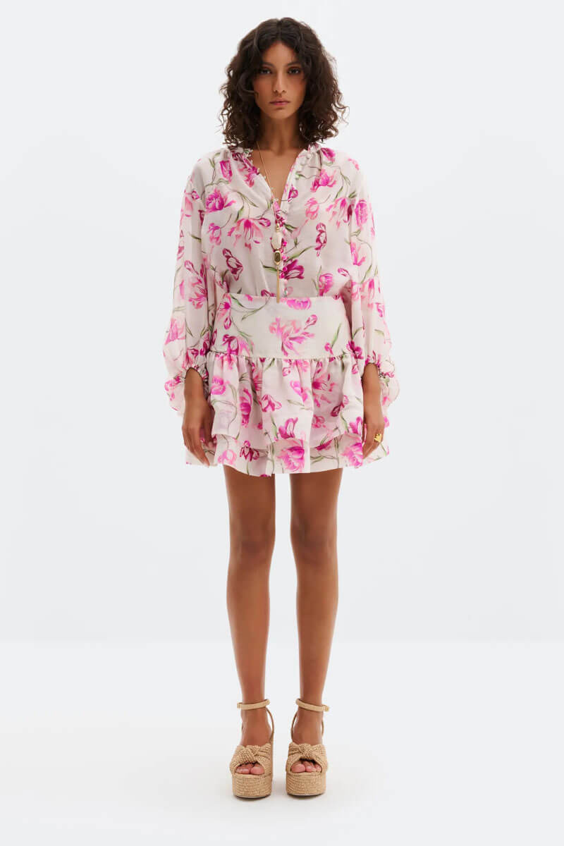 En voluminös minikjol som ger en lekfull men elegant touch till sommargarderoben. De böljande volangerna ger ett vackert fall och en feminin form som är lätt att klä upp eller ner. Bär den tillsammans med den matchande blusen för en iögonfallande look på sommarfesten.