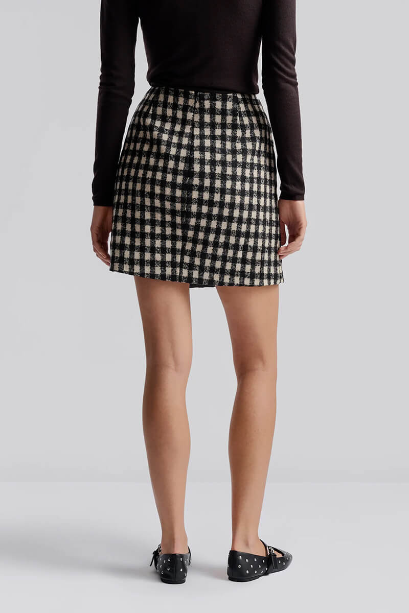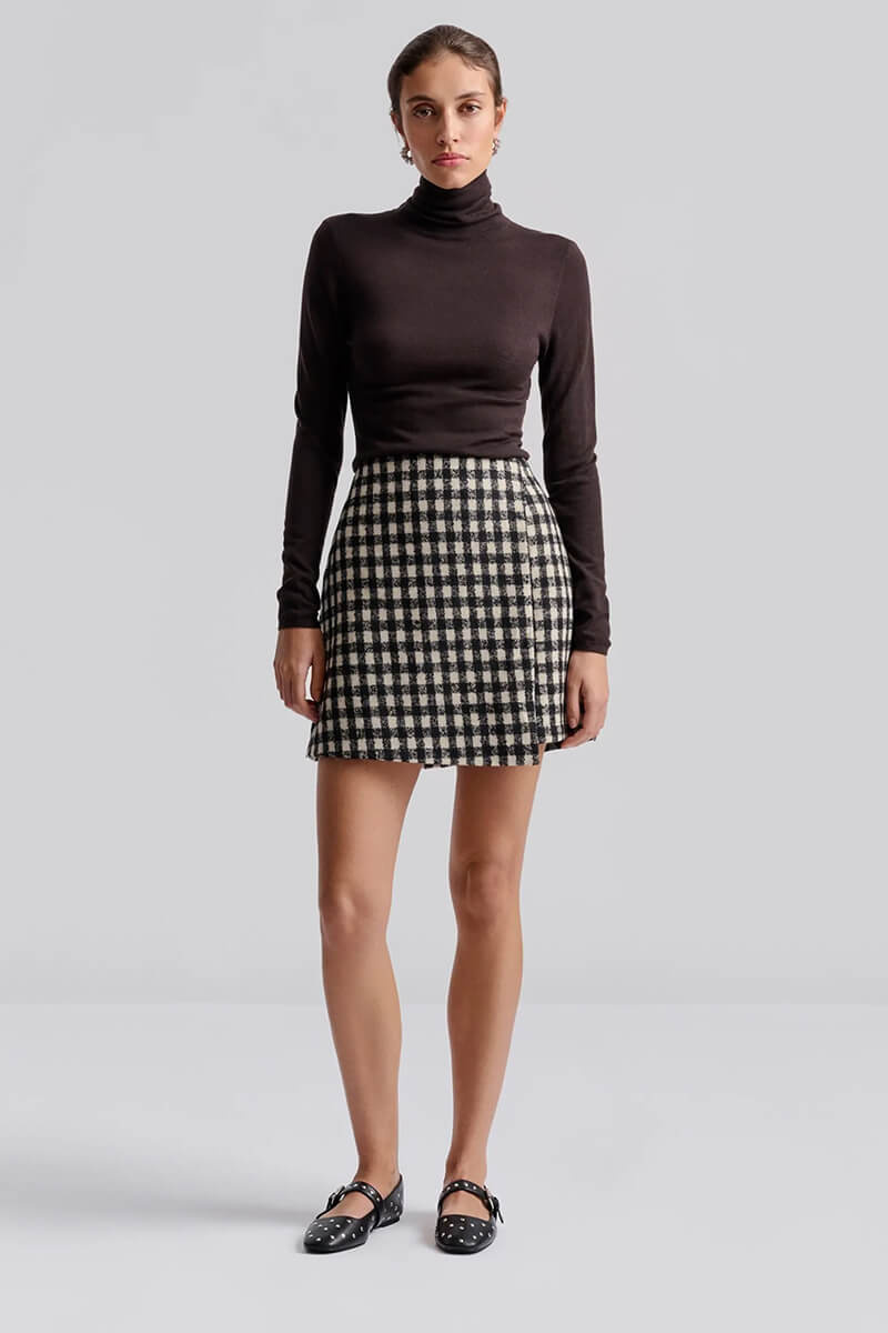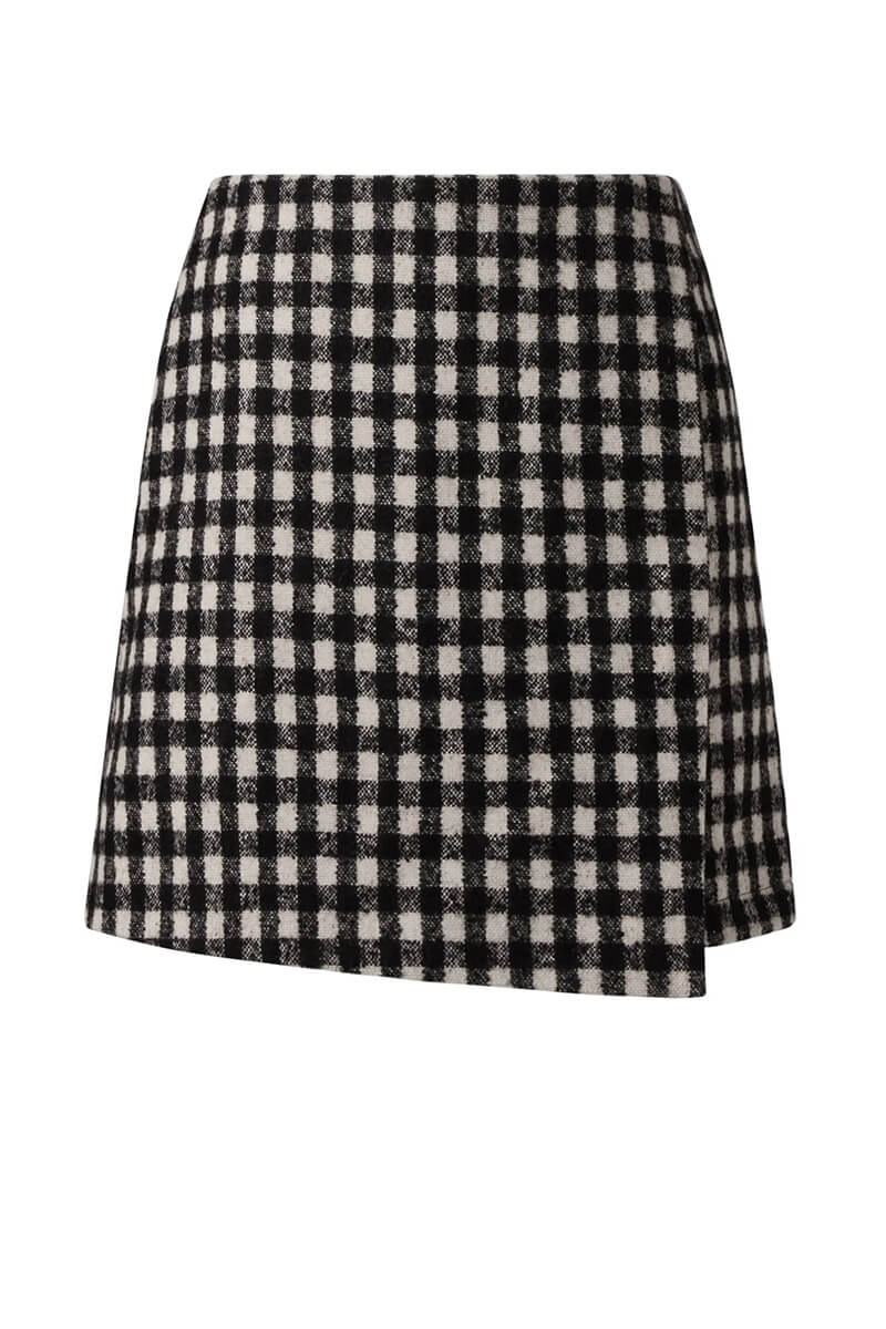 En klassiker den lilla korta kjolen i ullmix med rutmönster som du kombinerar lätt med en blus eller härlig stickad tröja. En stövlett till eller en ballerina för inomhusbruk gör stilen.Boucle minikjol med omlott detalj men dragkedja bak. Fodrad.