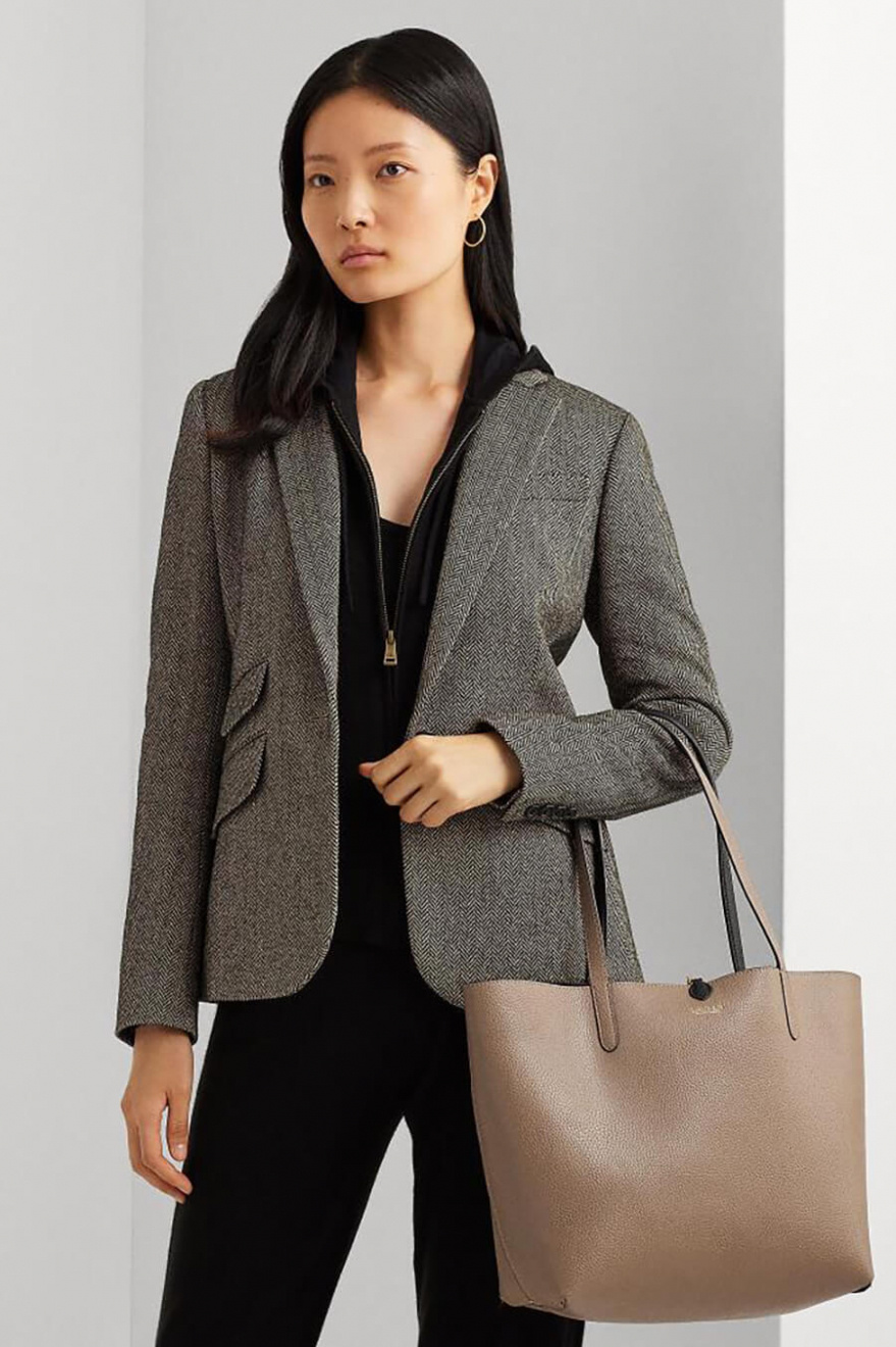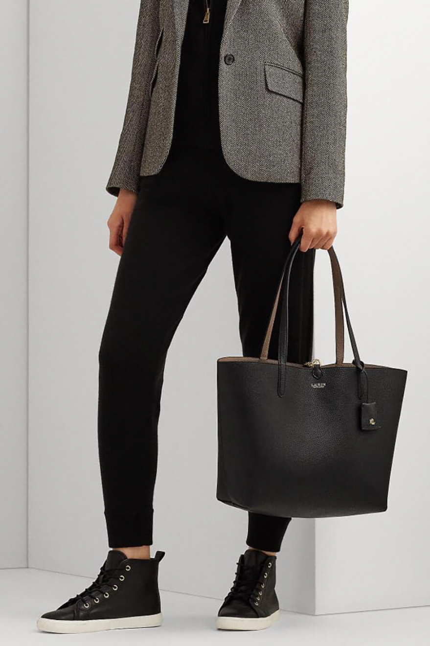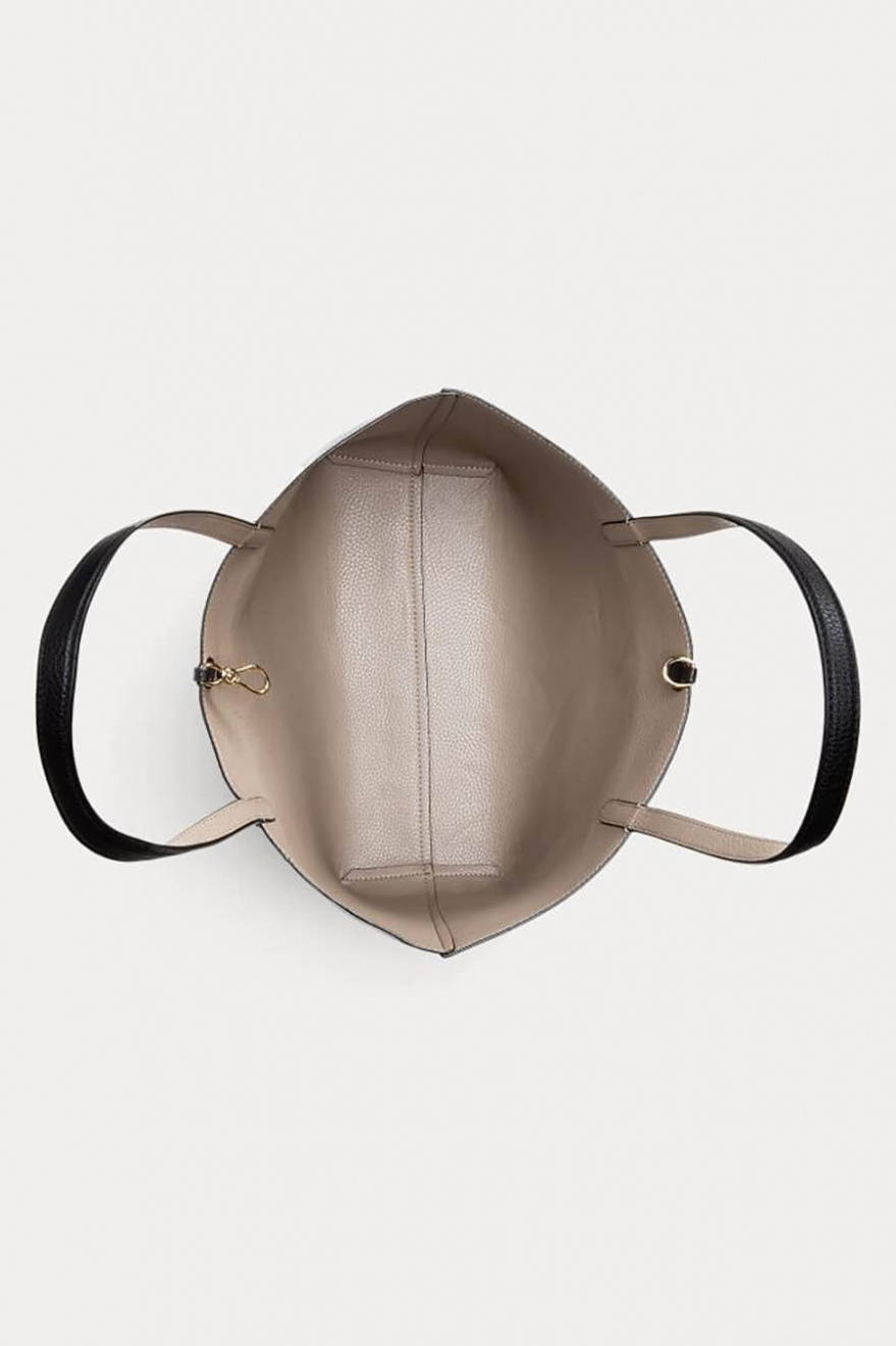 En vändbar tote i lyxigt fuskläder som ger dig två väskor i en – elegant beige på ena sidan, klassiskt svart på den andra. Stilren design med genomtänkta detaljer gör den lika praktisk som sofistikerad. Din nya favorit, oavsett dag eller dresscode.Tote väska i en vändbar design med dubbla handtag, en matchande innerficka som är avtagbar, nyckelknippa och stängs med ett spänne från Lauren Ralph Lauren.