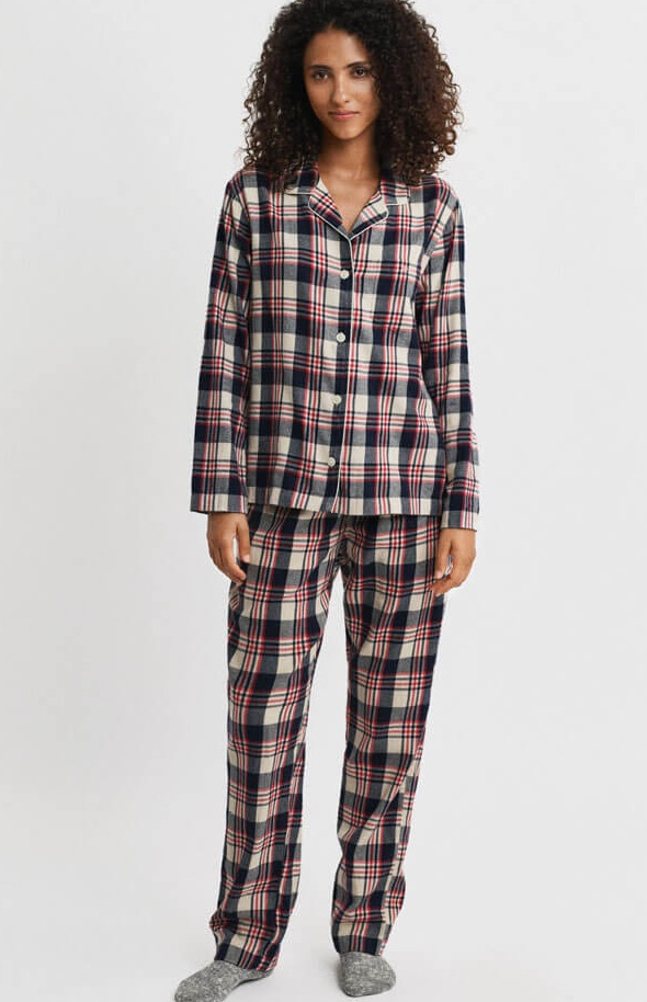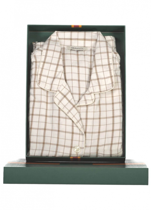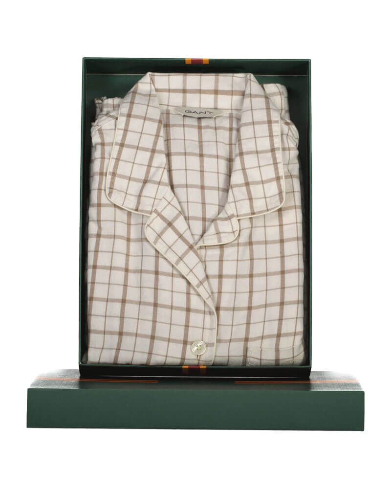 Pyjamassetet är tillverkat i tvättad bomull som ger en mjuk lyxig känsla.Setet inkluderar en långärmad skjorta med knappar och ett par byxor. Byxorna har sidfickor och dragsko i midjan. Skjortan har en regular fit och en broderad Gant-logo på bröstfickan, samt kontrasterande passpoal på kragen. Båda plaggen kommer i en rutmönstrad flanell.