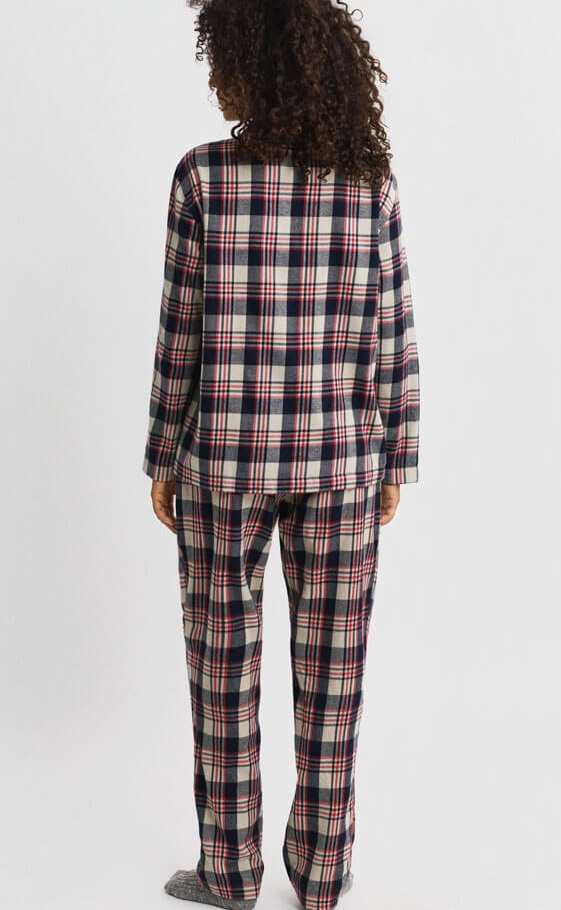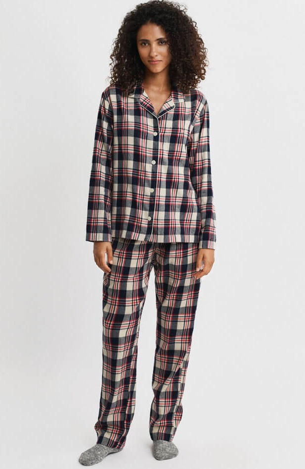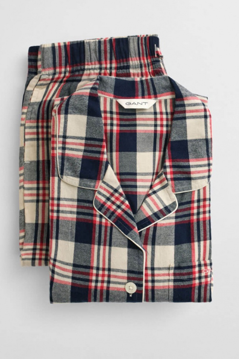 Pyjamassetet är tillverkat i tvättad bomull som ger en mjuk lyxig känsla.Setet inkluderar en långärmad skjorta med knappar och ett par byxor. Byxorna har sidfickor och dragsko i midjan. Skjortan har en regular fit och en broderad Gant-logo på bröstfickan, samt kontrasterande passpoal på kragen. Båda plaggen kommer i en rutmönstrad flanell.