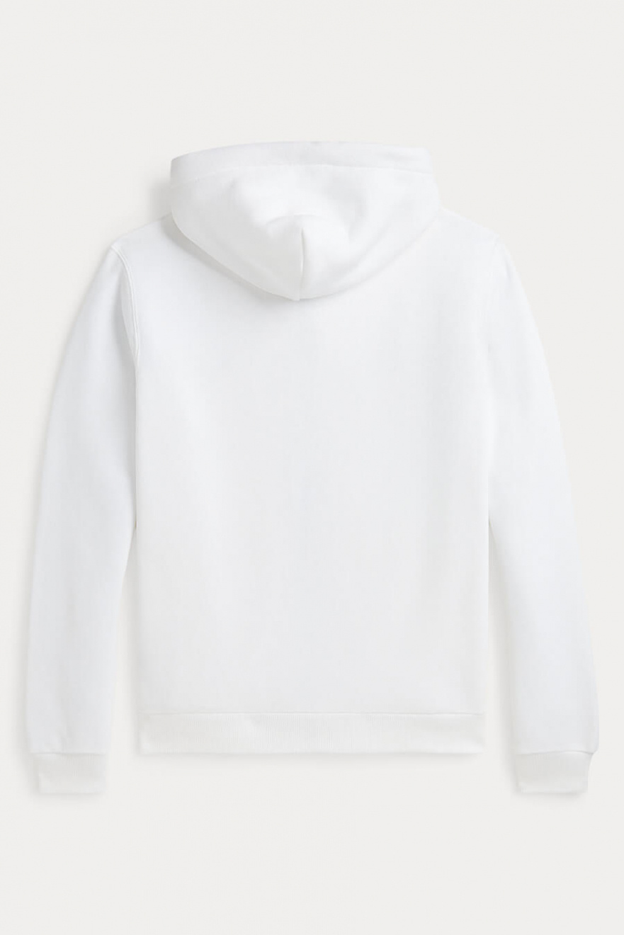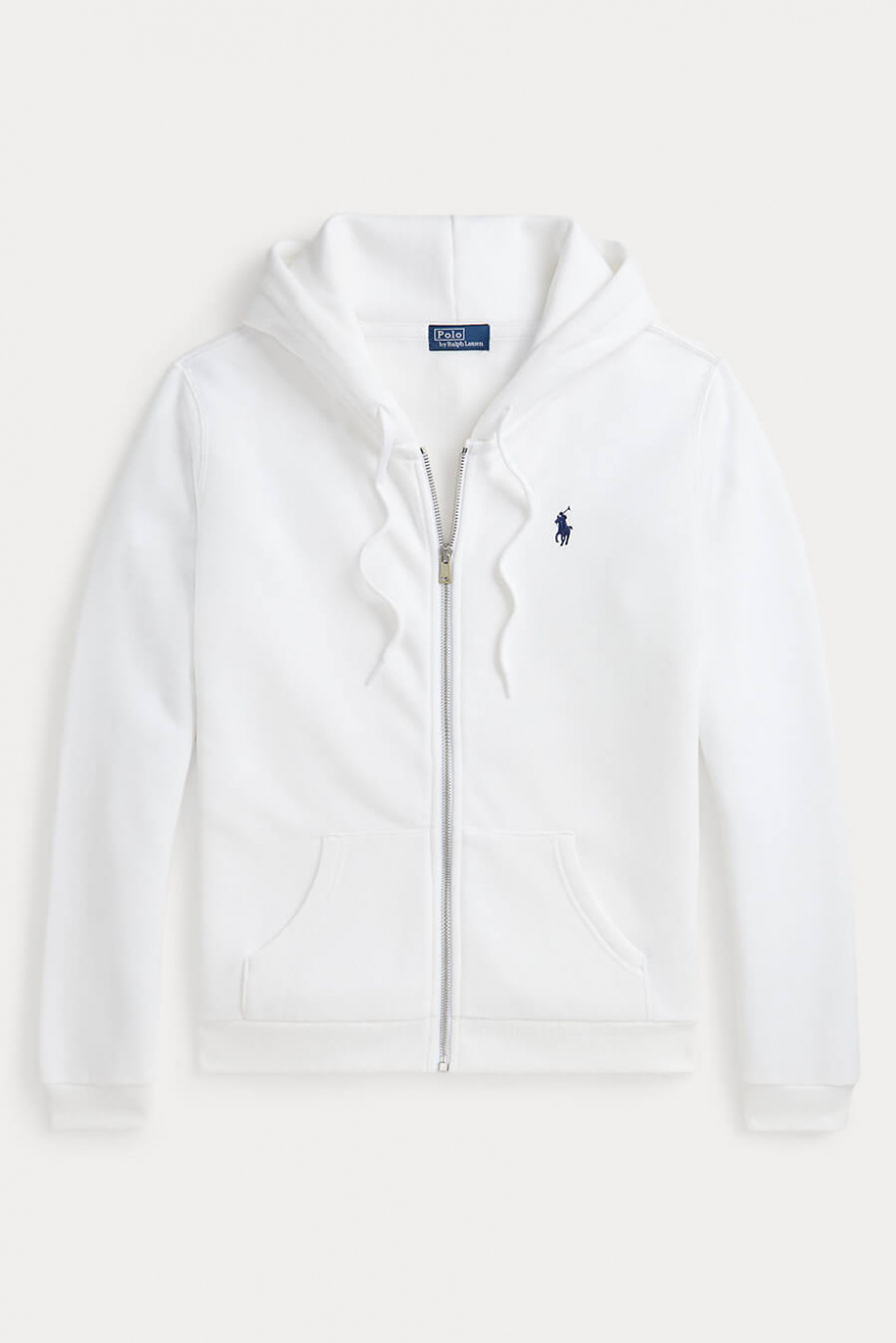 En vit hoodie med dragkedja är basplagget som alltid känns rätt. Den tidlösa designen kombinerar komfort och stil, perfekt för allt från långa promenader till avslappnade dagar hemma. Ett mångsidigt tillskott i vilken garderob som helst.Hoodie med synlig dragkedja fram, broderad logga, borstad fleece på insidan, dragsko på luva, fickor fram, ribbstickade muddar och avslappnad passform från Polo Ralph Lauren.