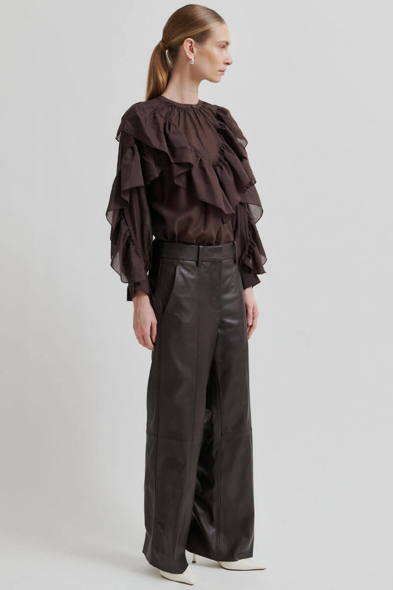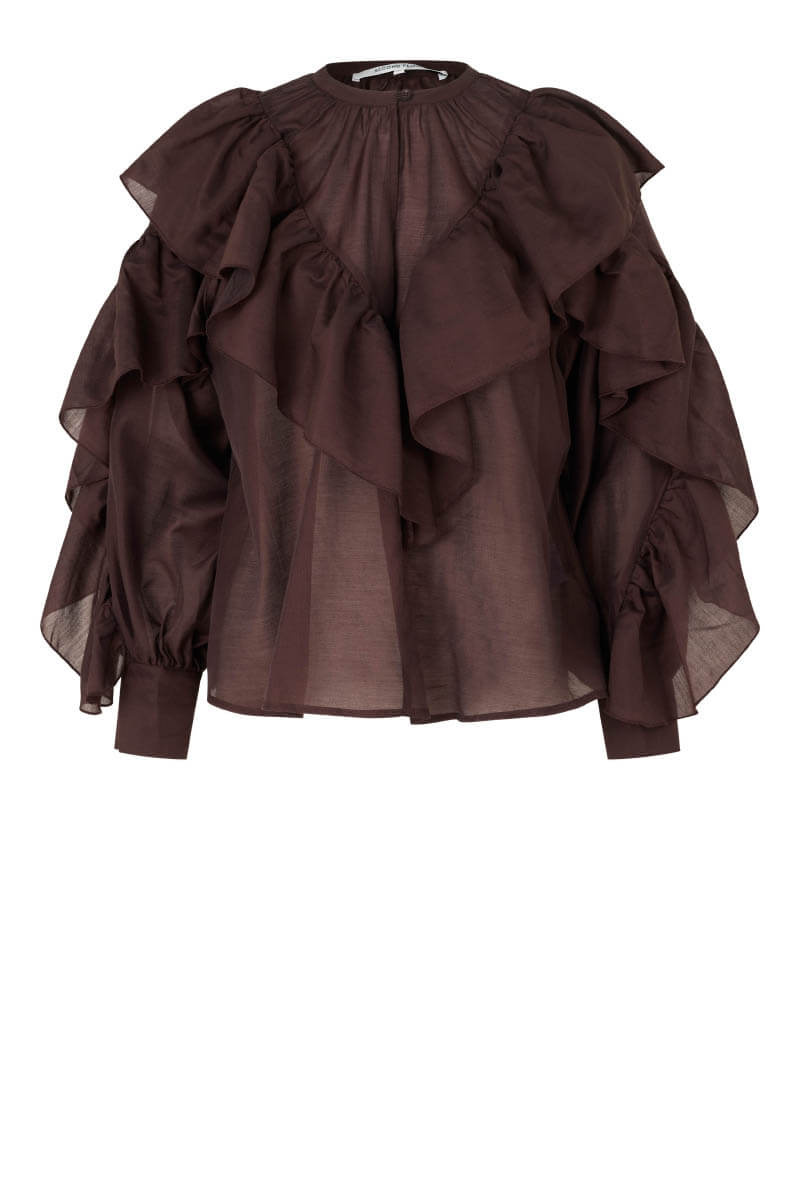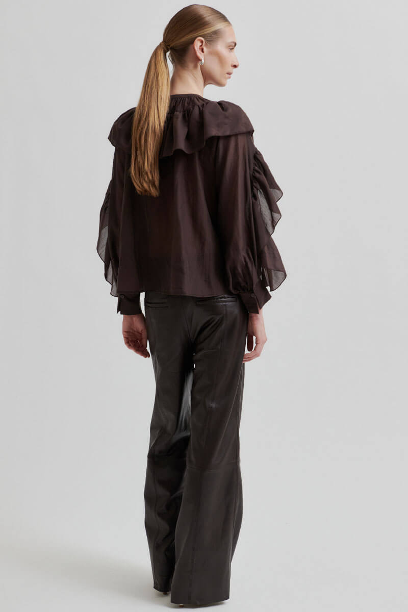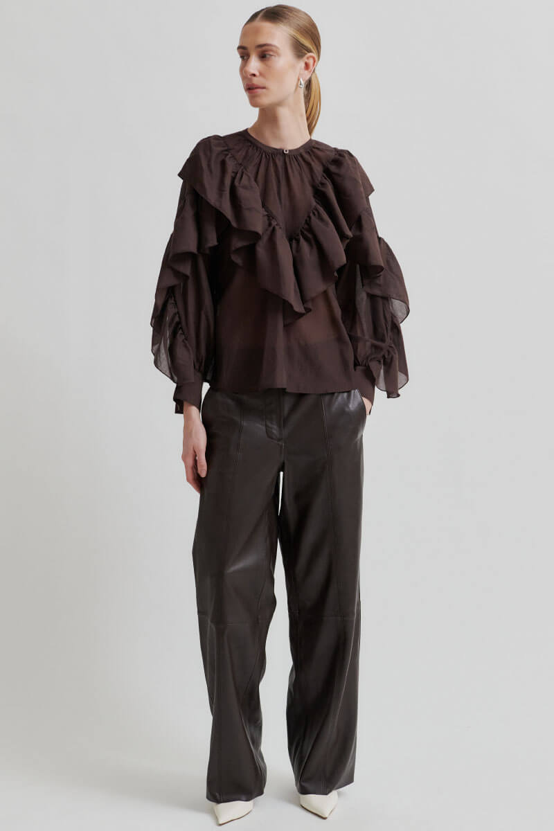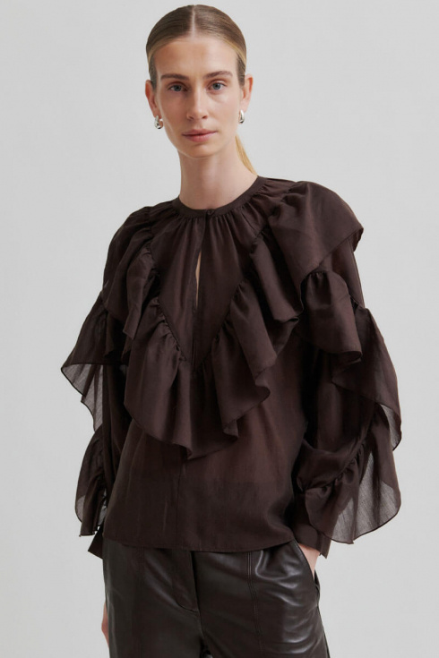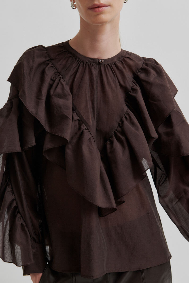 Mörkbrun blus med volangdetaljer och lätt transparent tyg som ger subtil dramatik. Matcha med ullkjol och stövlar för en sofistikerad höstlook, eller med mörk denim och loafers för en avslappnad men elegant kontrast.Blus i en lyocellblandning med volangdetaljer, lös passform, något transparent, litet nyckelhål fram och stäng med en knapp fram från Second Female.