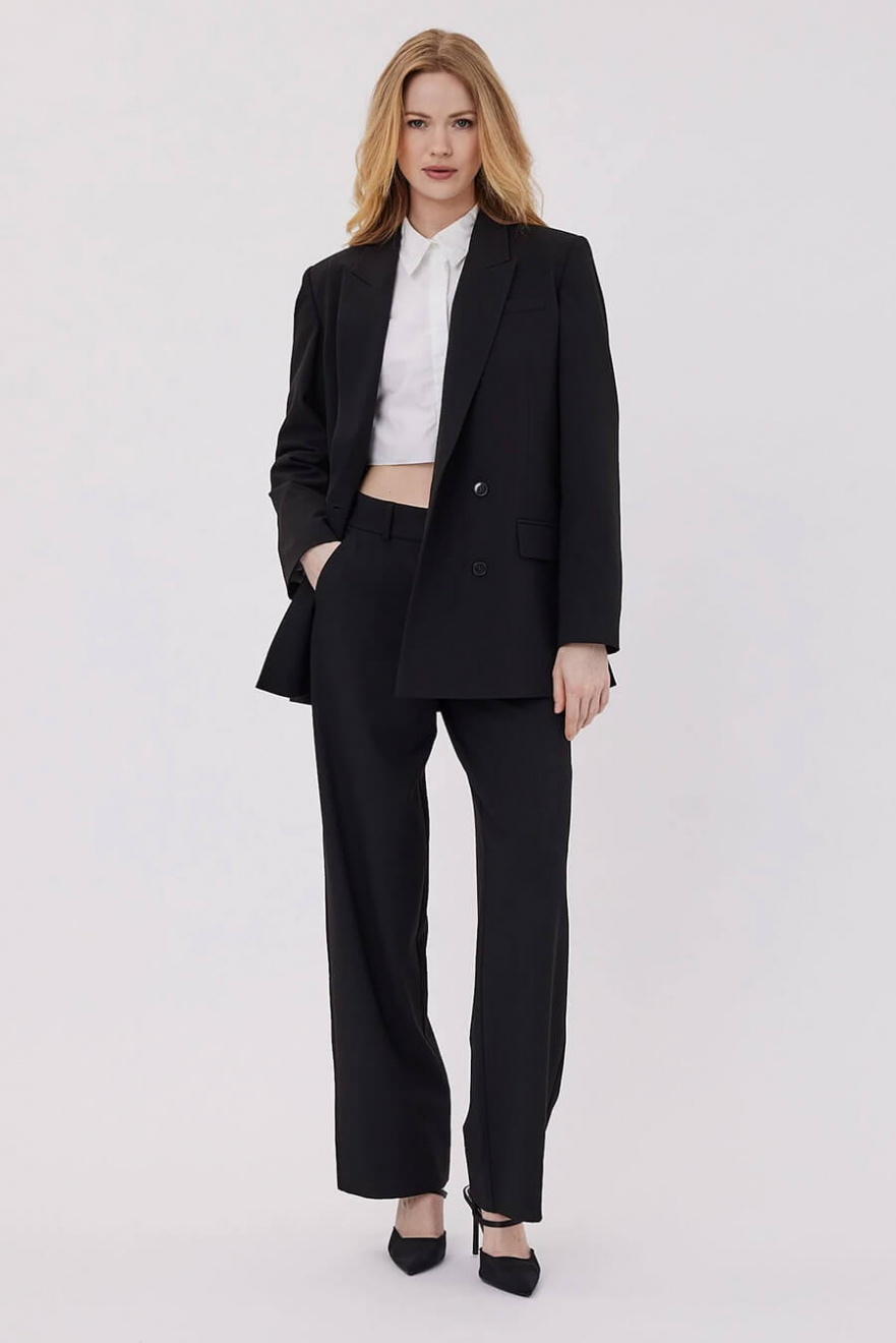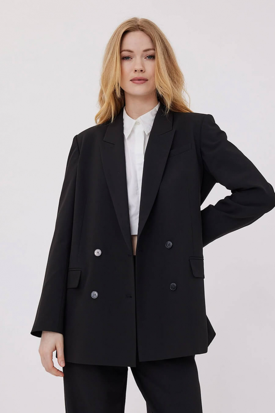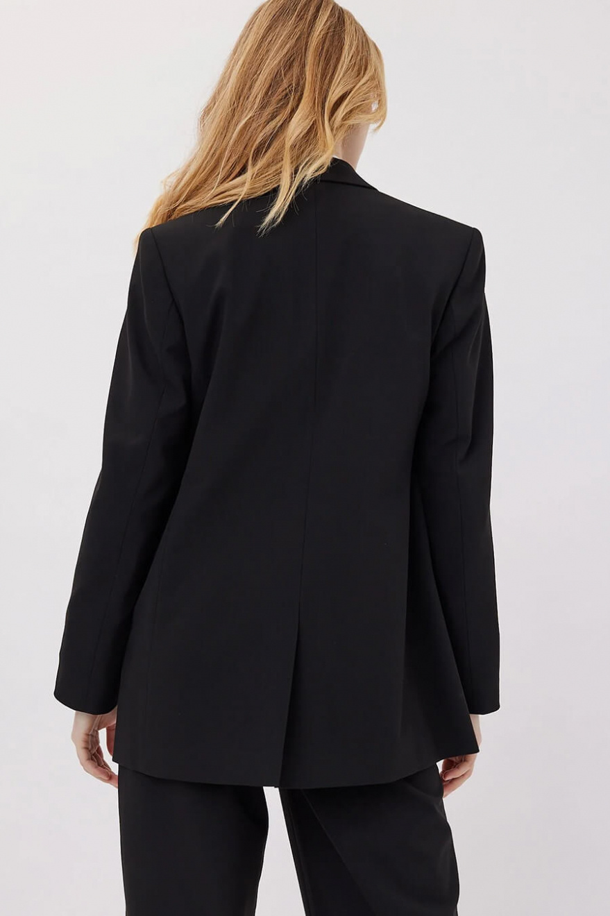 Denna dubbelknäppta kavaj är en modern tolkning av klassisk elegans. Med sin strukturerade siluett och minimalistiska detaljer är den perfekt för att skapa en kraftfull look – lika självklar på kontoret som vid stilfulla evenemang.Dubbelknäppt kavaj i en återvunnen blandning med lös passform, lätt vadderade axlar, en innerficka och två fickor fram från FiveUnits.