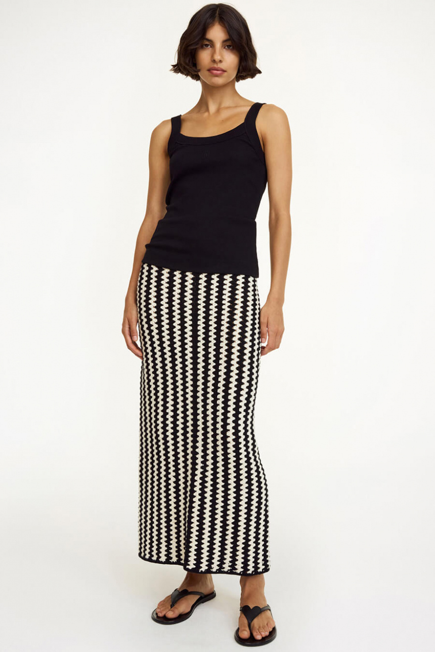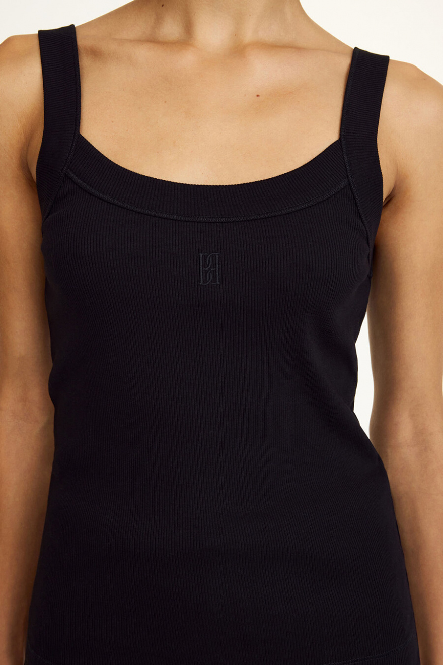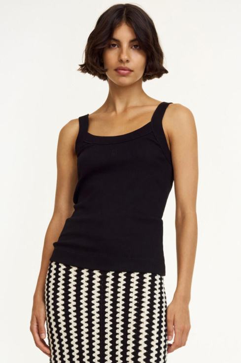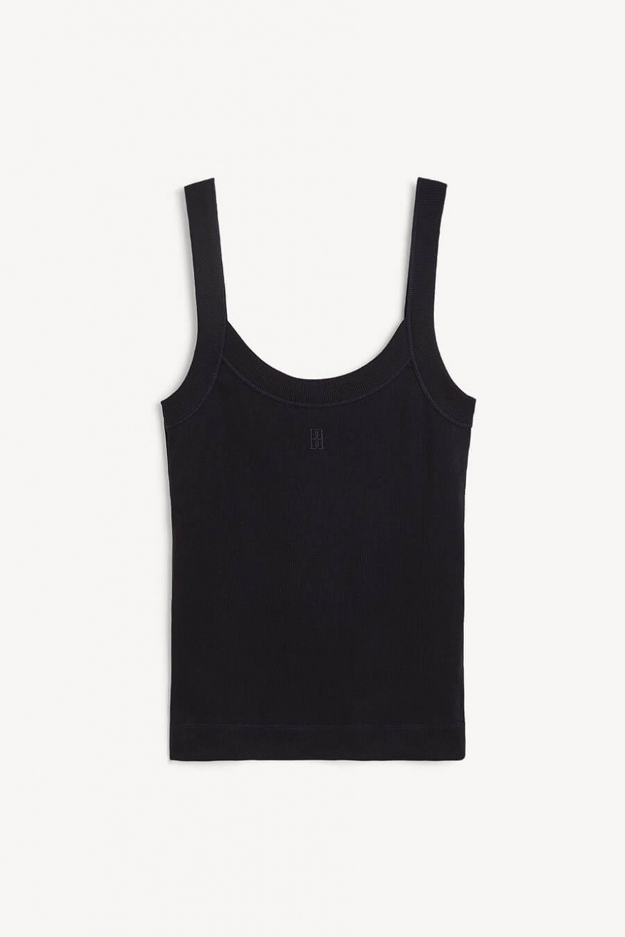 Svart ribbat linne med smal passform och tjocka band – en garderobsfavorit med attityd. Monogramloggan framtill adderar en exklusiv touch. Perfekt att styla till både jeans och kjol för en tidlös, trendig look. Enkelt, men aldrig tråkigt.Ribbat linne i ekologisk bomull med breda axelband, smal passform och broderad logga fram från By Malene Birger.