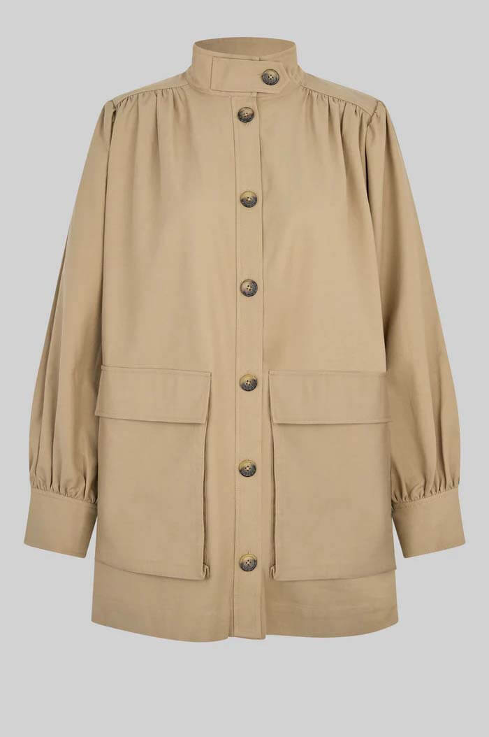 Designad med hög hals och knäppning framtill. Har rynkade axlar, långa ärmar och knappade manschetter som ger en subtilt feminin touch.