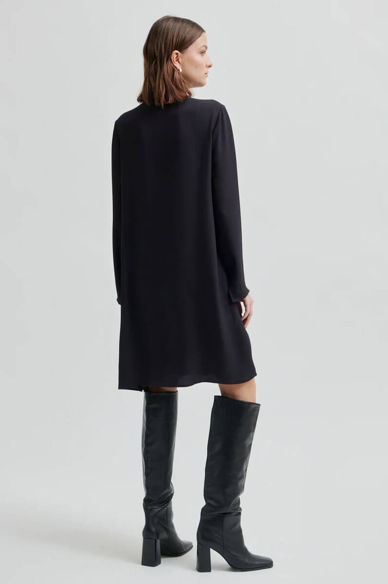 Second Female klänning med elegant midjedetaljEn sofistikerad klänning från Second Female, sydd i en mjukt fallande viskosblandning med vacker lyster. Designen utstrålar diskret stil med sin nyckelhålsöppning framtill och nätta knappstängning. Ett elegant veck på ena axeln och subtila rynkningar i sidan formar en smickrande, symmetrisk drapering som framhäver silhuetten.