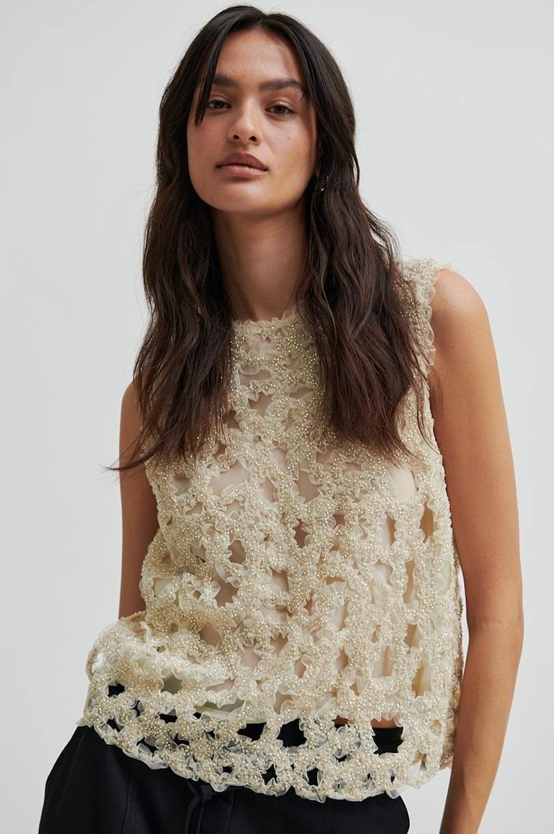 Pärlad topp med subtil glans och rak silhuett. Perfekt med svarta byxor och klackar för en elegant kvällslook, eller med jeans och kavaj för en modern vardagsoutfit.