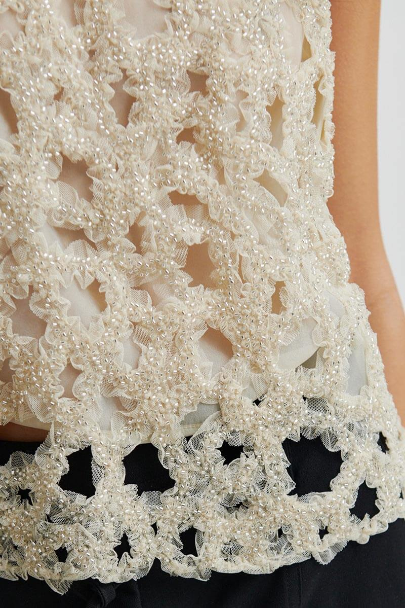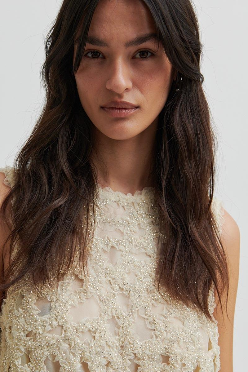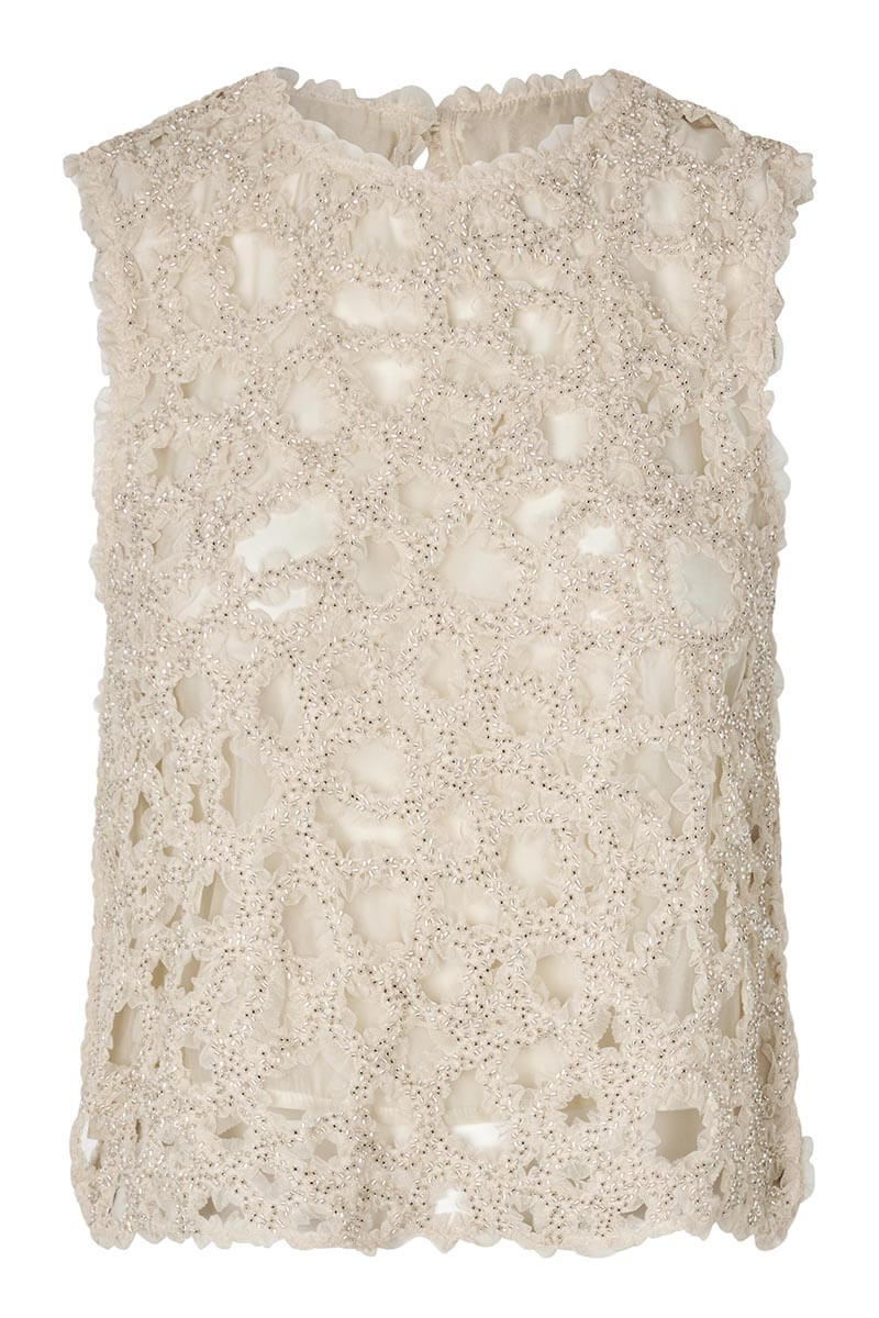 Topp med strukturerat mönster och skimrande pärlor på ton-i-ton-fodrad bas från Second Female. Rund halsringning med liten nyckelhålsöppning och knapp i nacken.