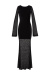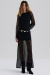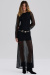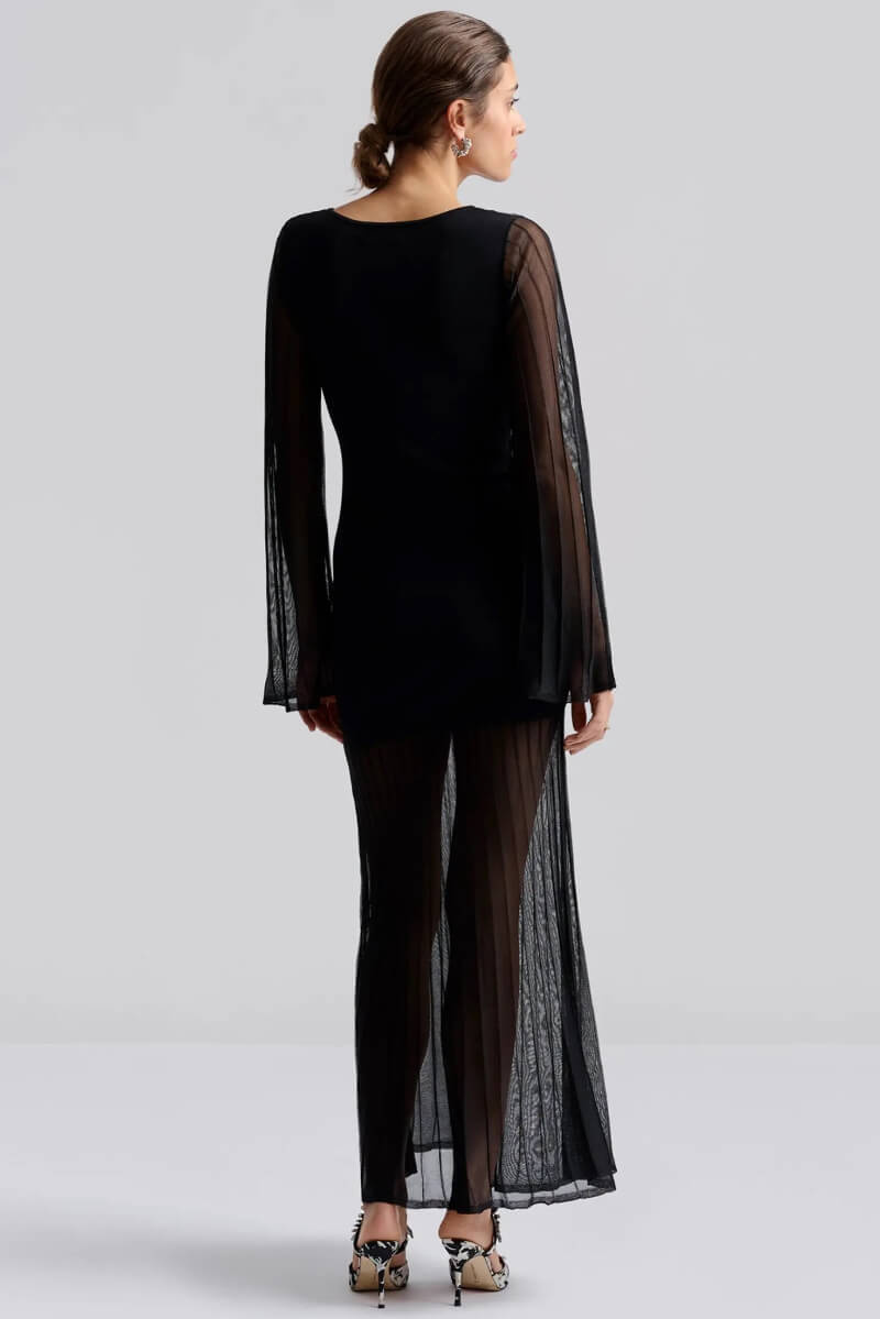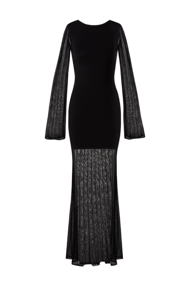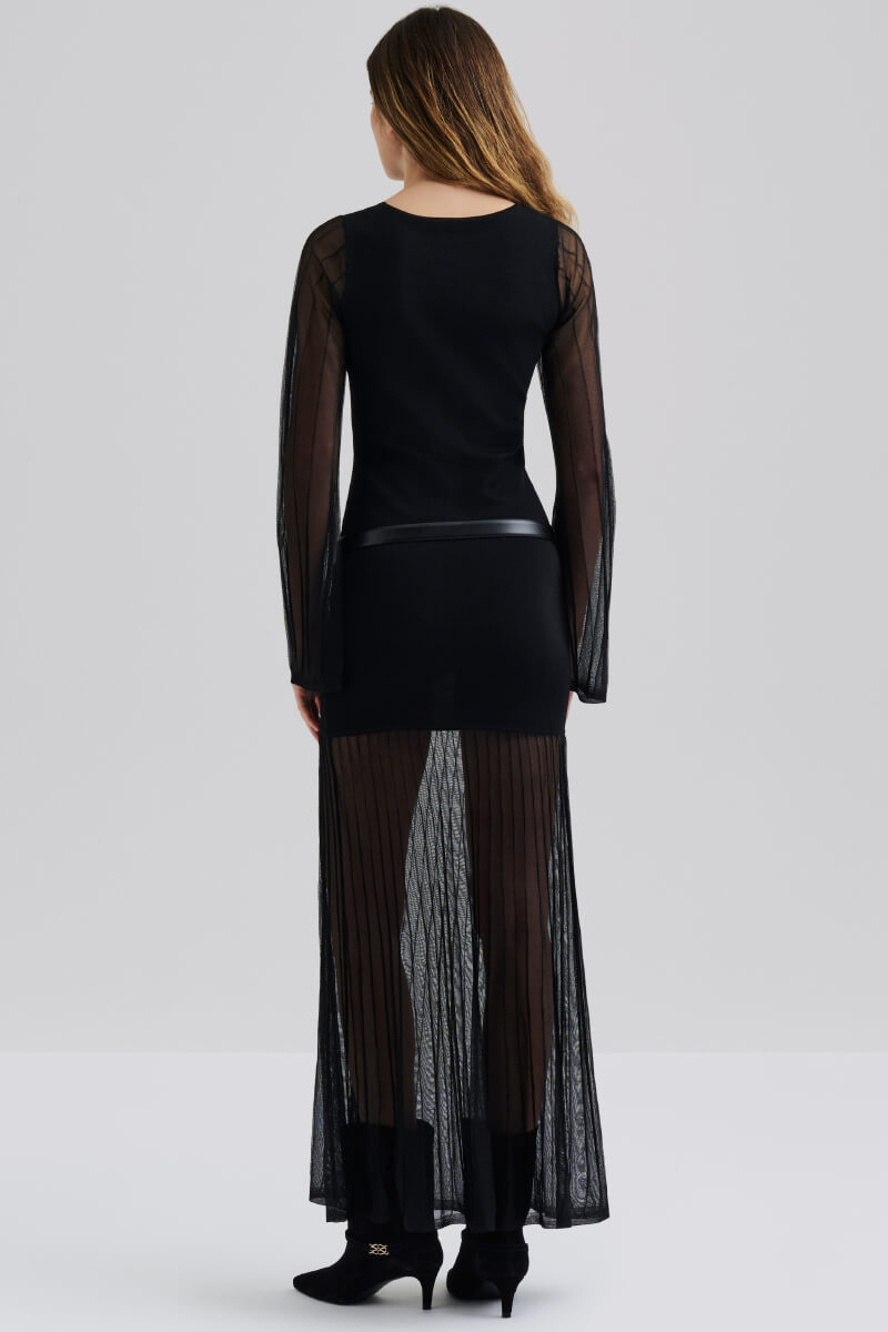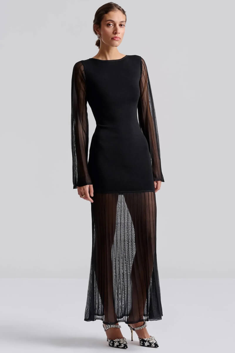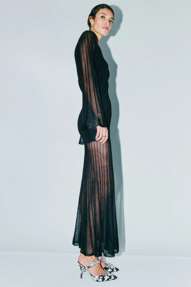 En svart maxiklänning som låter strukturen tala. Transparenta, veckade partier möter markerad silhuett – en kontrastlek för kvällens middagar och mingel. Bär med eleganta klackar, ett kashmiromslag och sobra smycken för en stilren, självsäker look.Strukturmönstrad tunn klänning i maxilängd med smal passform, något vida ärmar, rund hög halsringning, delvis fodrad och vid kjol från Malina.