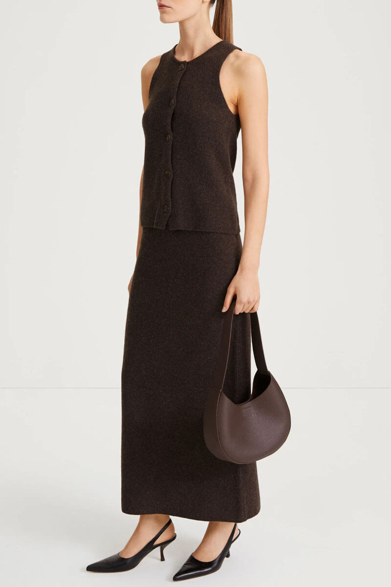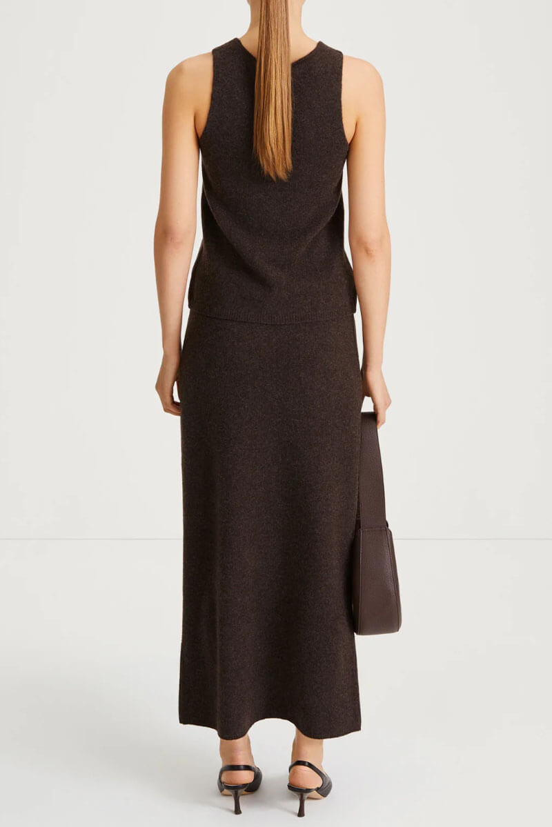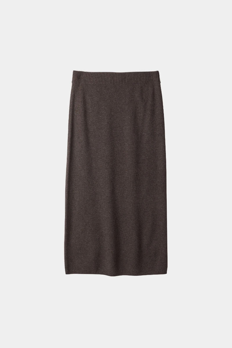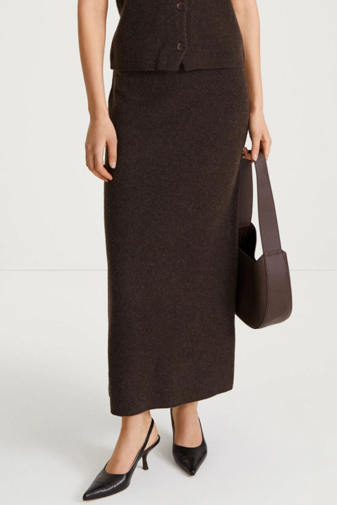 En mörkbrun, rak kjol i borstad merinoull med ankellång längd och en ren, avskalad silhuett. Den dolda resåren i midjan ger en bekväm passform som följer kroppen utan att strama. Styla med den matchande koftan för en elegant, monokrom look eller bär med vit skjorta och boots för en modern vardagsstil. Mjuk, stilren och enkel att bära varje dag.Mörkbrun stickad kjol i borstad merinoull från Stylein med rak passform, ankellång längd och elastisk midja.