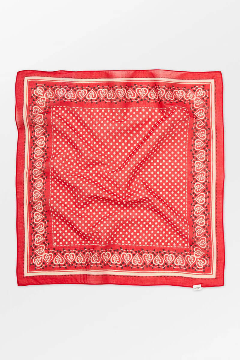 En stilfull fyrkantig scarf i 100 % bomull med måtten 55 x 55 cm. Det sofistikerade mönstret med bård och fina detaljer ger en feminin känsla och blir en elegant detalj till din outfit. Bär den runt halsen, som bälte eller som en dekorativ accessoar på väskan för en modern touch.