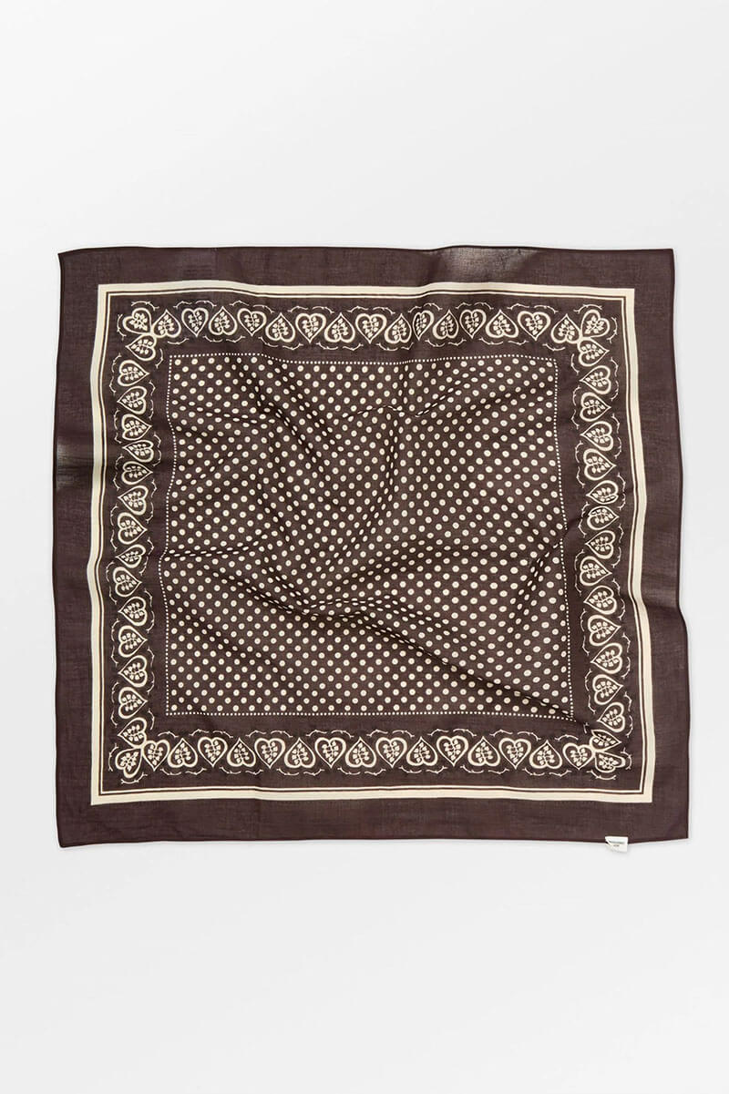 En stilfull fyrkantig scarf i 100 % bomull med måtten 55 x 55 cm. Det sofistikerade mönstret med bård och fina detaljer ger en feminin känsla och blir en elegant detalj till din outfit. Bär den runt halsen, som bälte eller som en dekorativ accessoar på väskan för en modern touch.