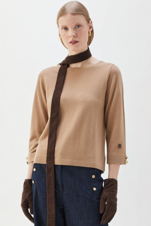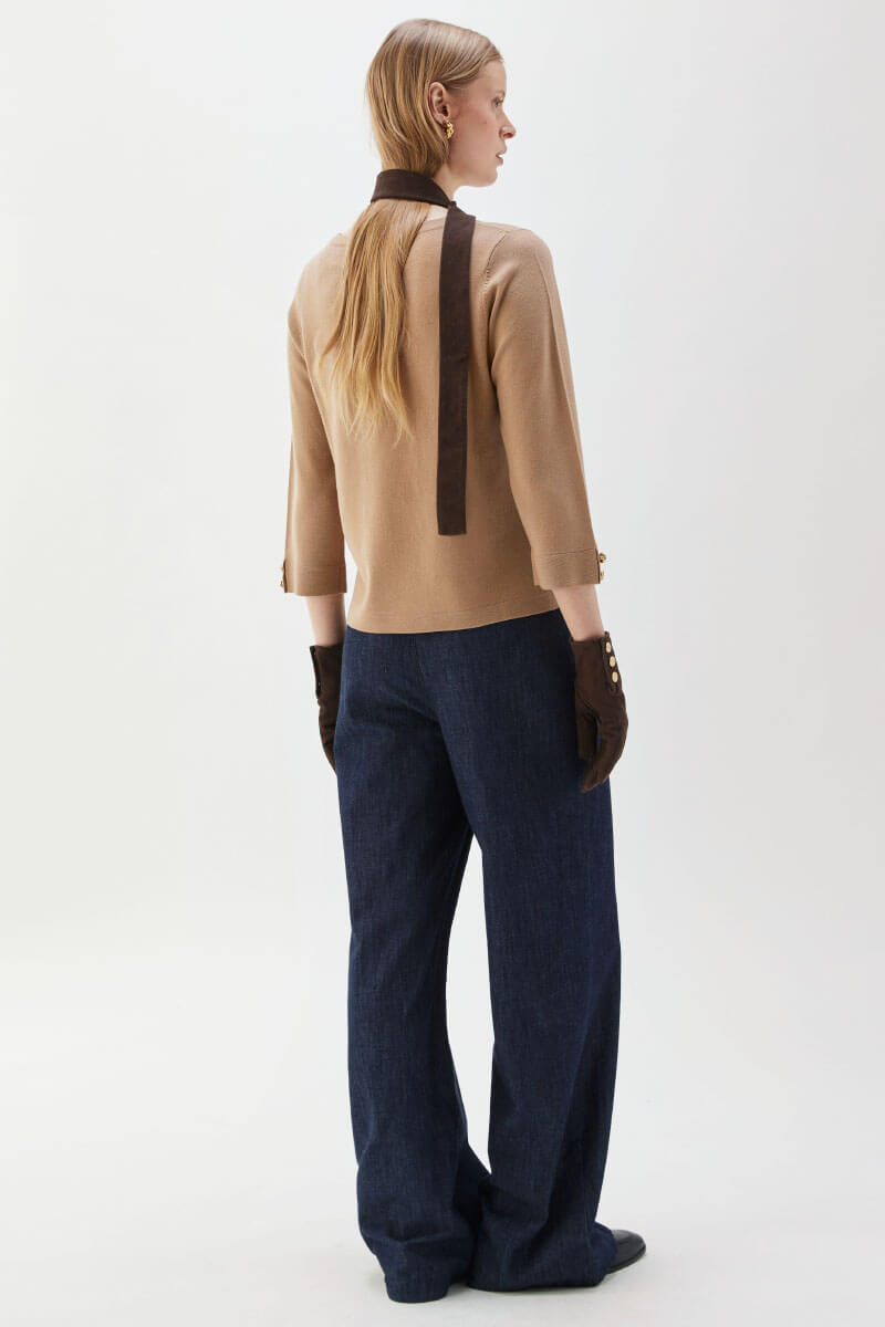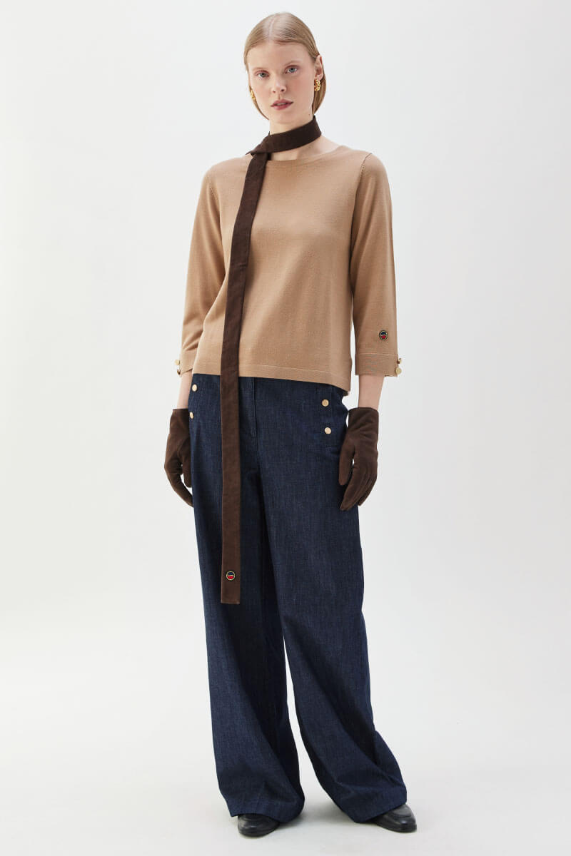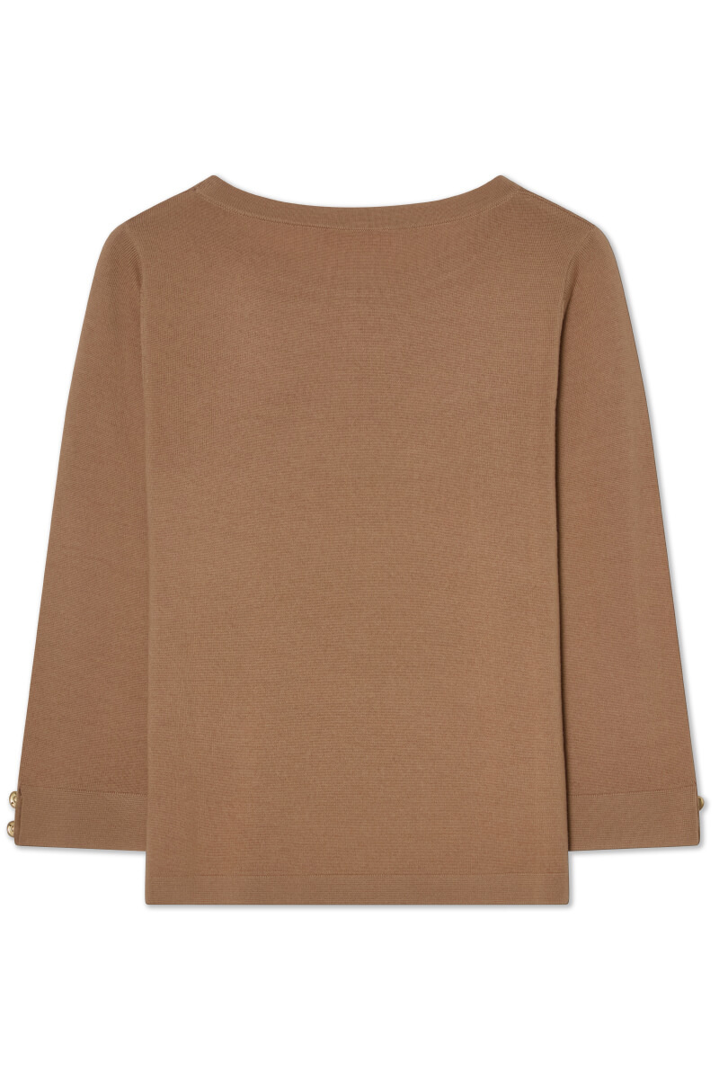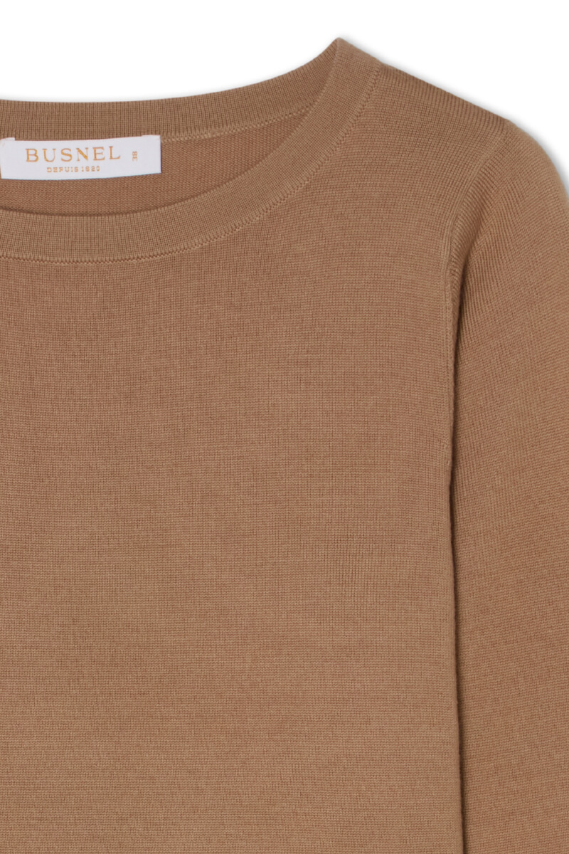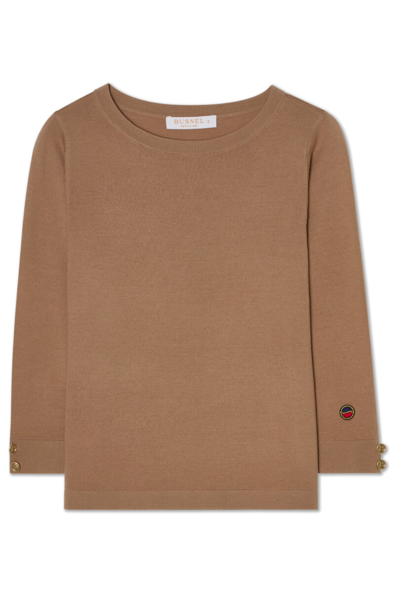 Mjuk merinoullstopp i ledig passform och varm caramelton. Bär den med skräddade byxor eller en midikjol för en elegant vardagslook. Stilrena accessoarer och boots fullbordar en avslappnad, sofistikerad och tidlös outfit som känns modern och chic.Stickad topp i merino ull med rund halsringning, 3/4 ärmar, ledig passform, dekorativa knappar och logga vid ärmslut från Busnel.