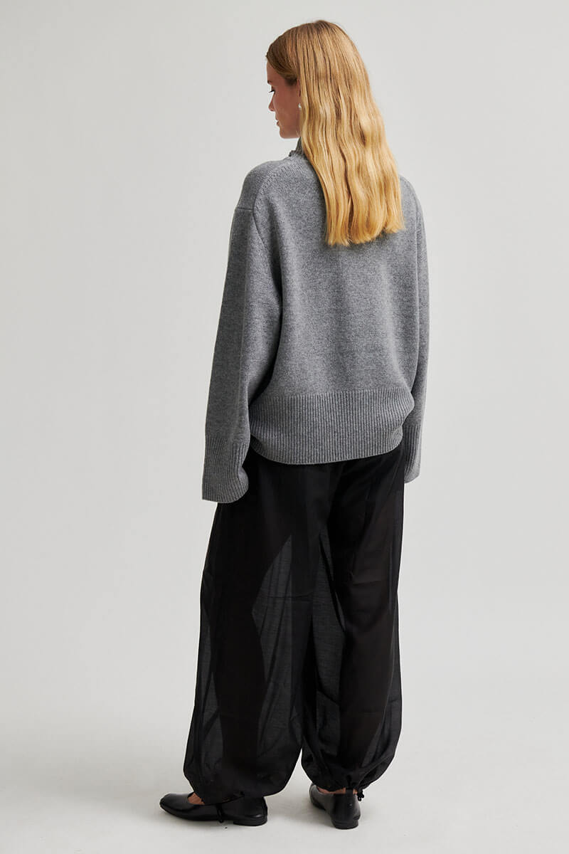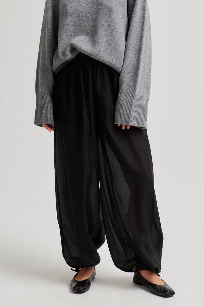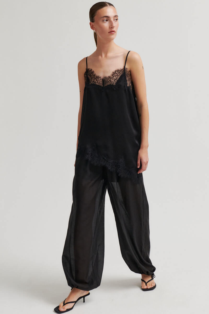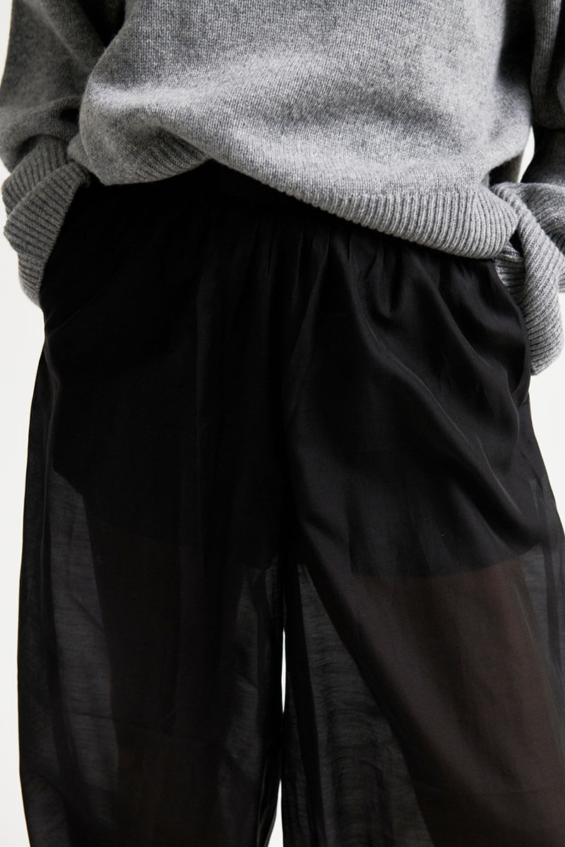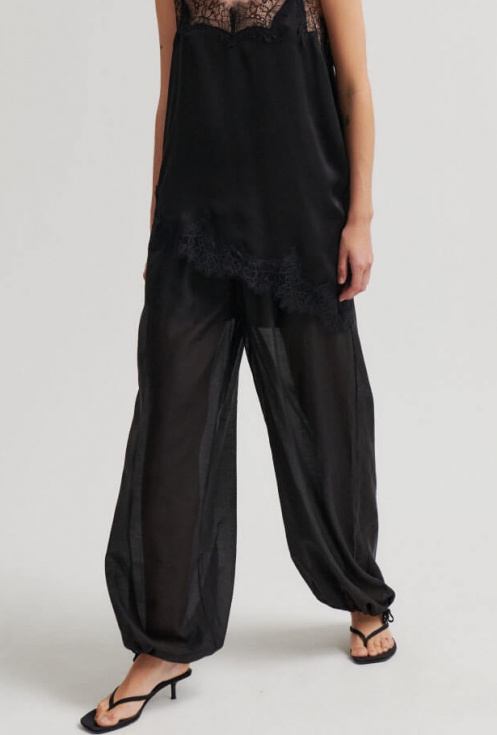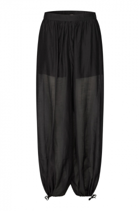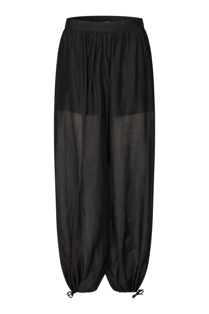 Ett par eleganta ballongbyxor i ett lätt, något transparent material som ger en luftig och modern silhuett. Ett luftigt plagg som passar lika bra till en stickad tröja till vardags eller till en kavaj för en kvällslook.