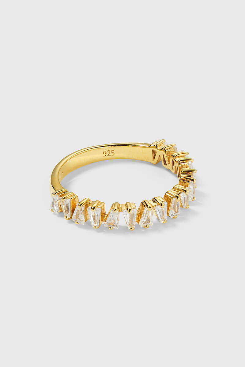 Ringen har små, avsmalnande baguetteskurna cubic zirconias. Stenarna fångar ljuset och tillför precis rätt mängd gnistra, vilket gör dem perfekta för både vardagar och speciella utekvällar.Tillverkad av 100 % återvunnet sterling silver, pläterad med 18K guld.