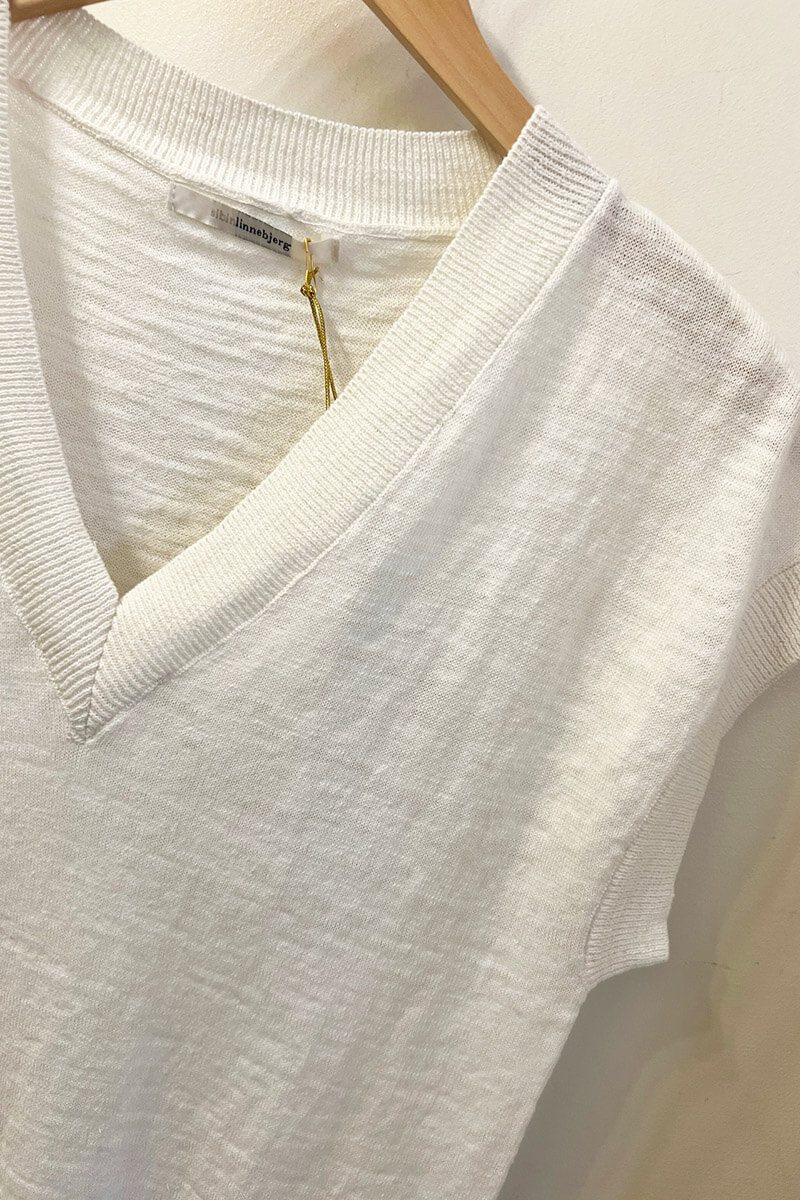 En stickad V-ringad topp som snabbt blir en favorit i garderoben. Den avslappnade passformen och den lilla holkärmen ger ett snyggt, feminint fall som är lika fint till linnebyxor som under en kavaj.