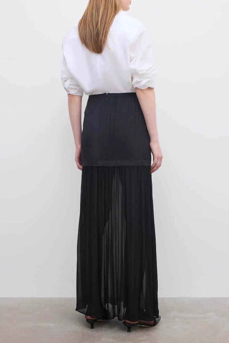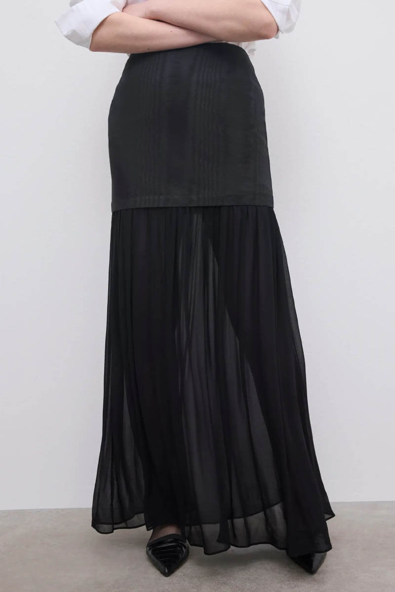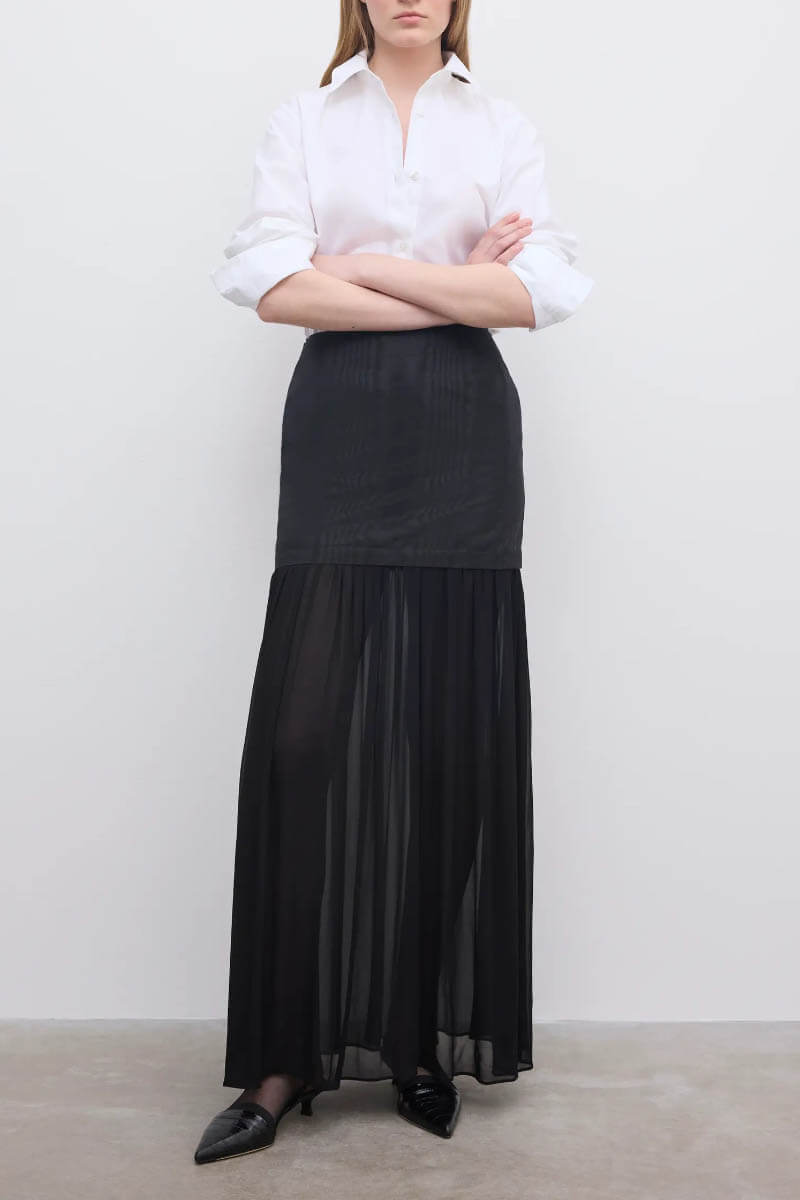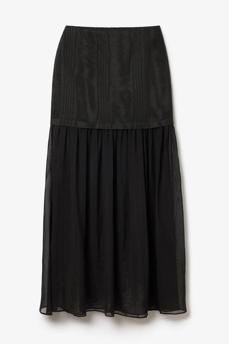 Festens finaste kjol!Maxikjol i kontrasterande texturer, med ett jacquardvävt topplager med en subtil moiréeffekt, tillverkat av exklusivt italienskt tyg. Avslutad med ett skir, mjukt fallande chiffonglager undertill som skapar ett mjukt rörelsemönster och djup.