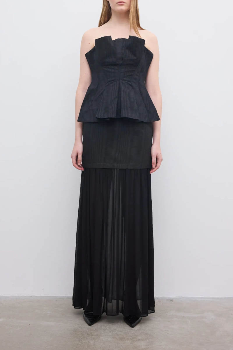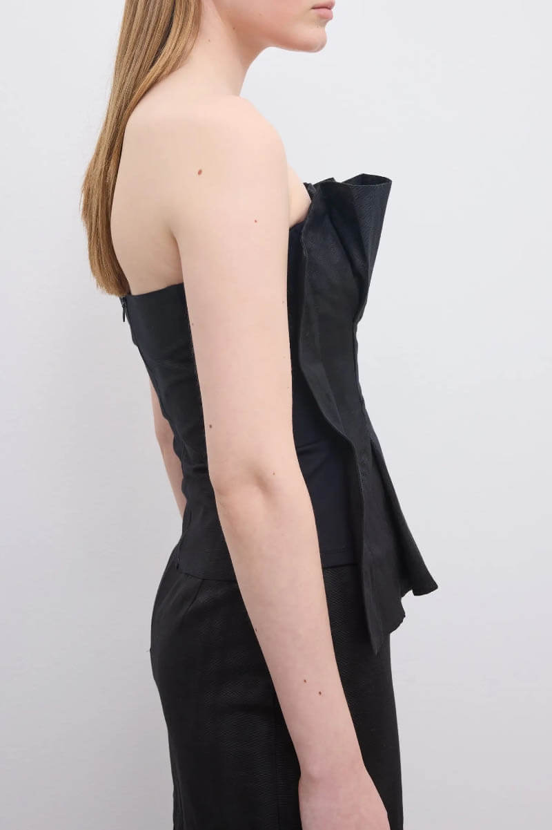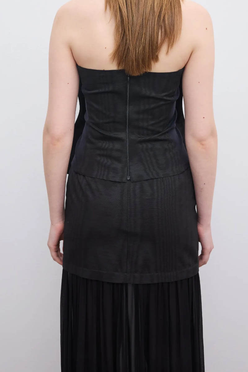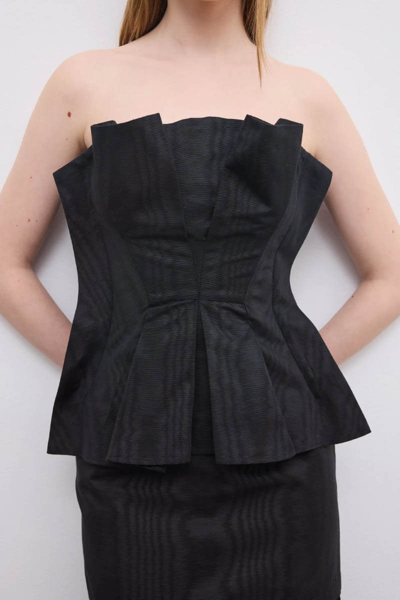 Ärmlös topp i italiensk jacquard med moiréeffekt, med en smal passform som definieras av skulpturala veck och ett mjukt kontrasterat liv, vilket skapar ett dynamiskt samspel mellan struktur och form.Har en dold dragkedja baktill.