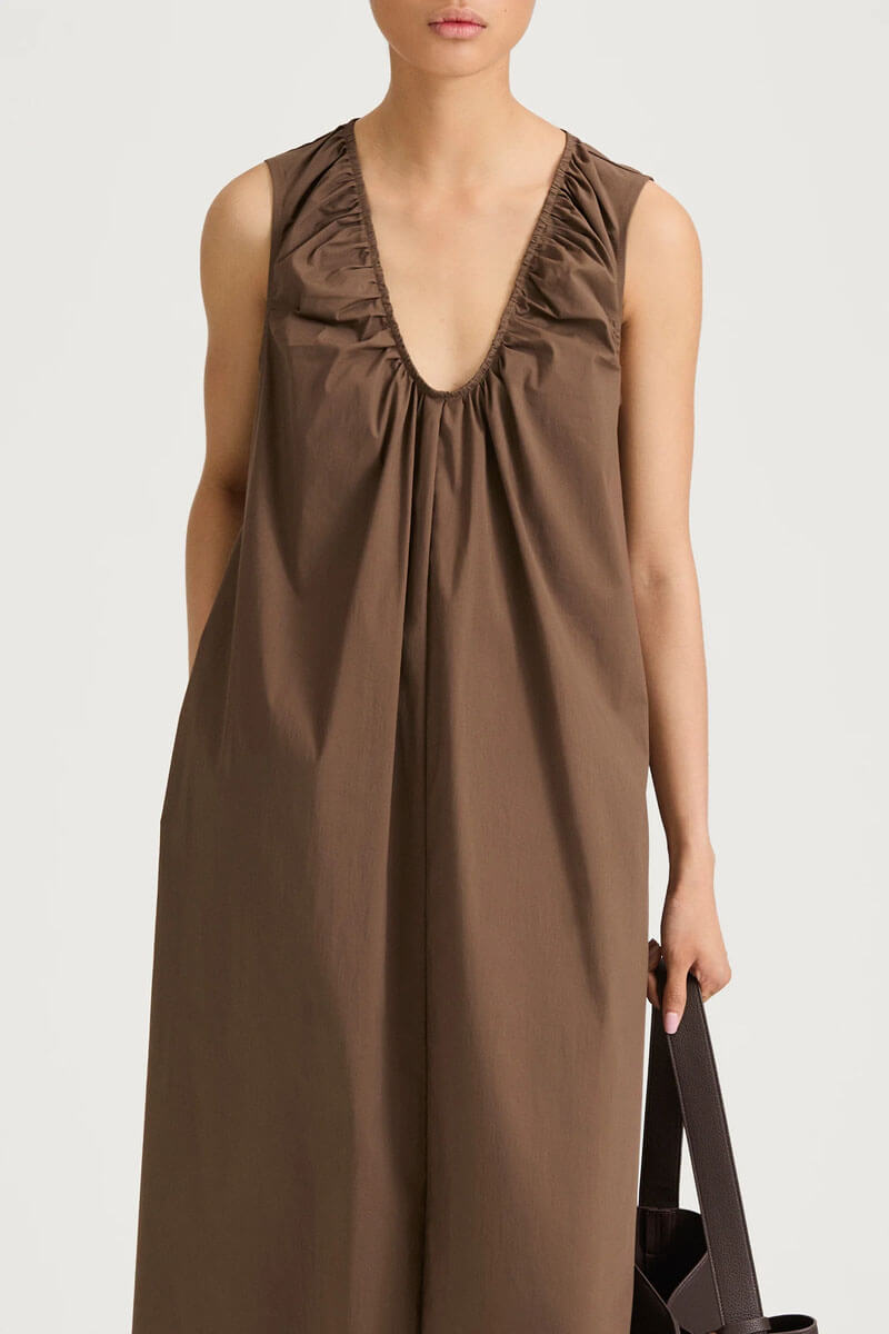 Jaisie dress i Cacao perfekt för middagen sommarpartyt eller bara med flip flop en sommardag.Jaisie Dress är en elegant klänning i en mjuk bomullsblandning med fin lyster som ger ett lätt och följsamt fall. Klänningen har en feminin U-ringning med mjuka rynkningar som skapar en vacker, flytande siluett och ger ett sofistikerat uttryck.