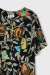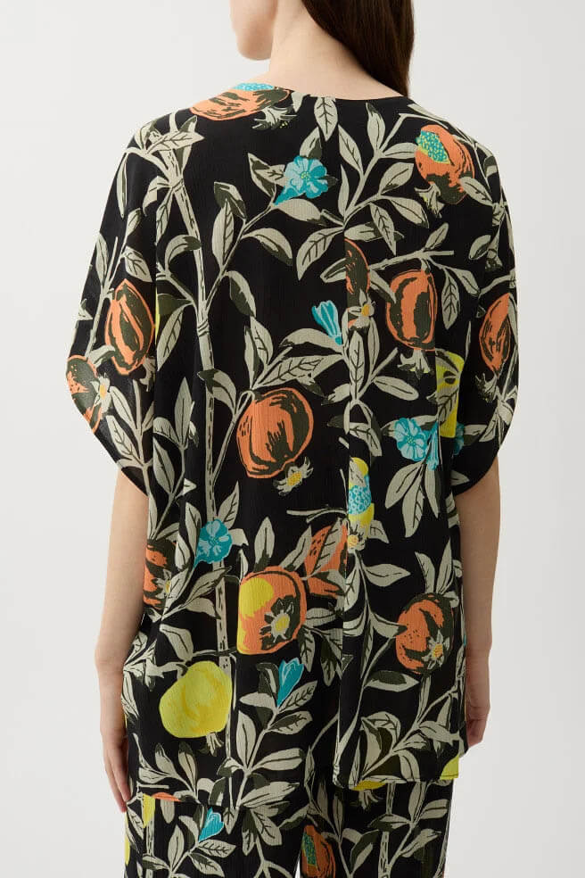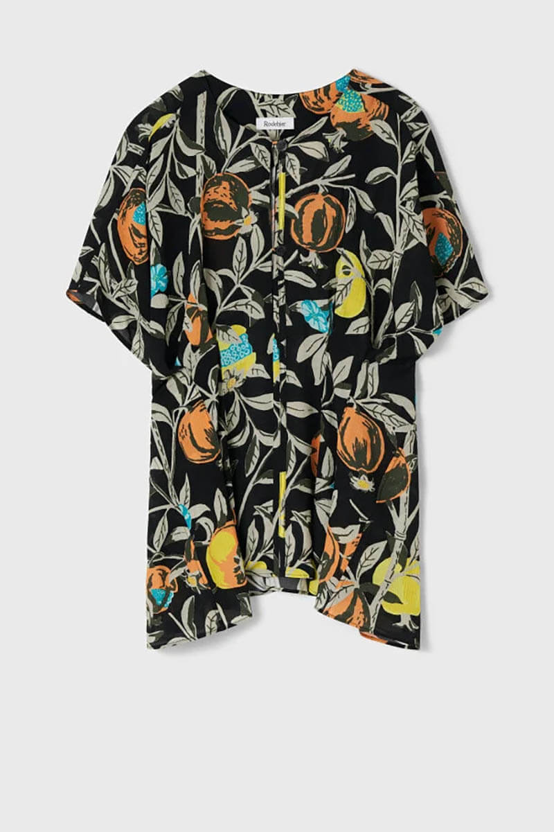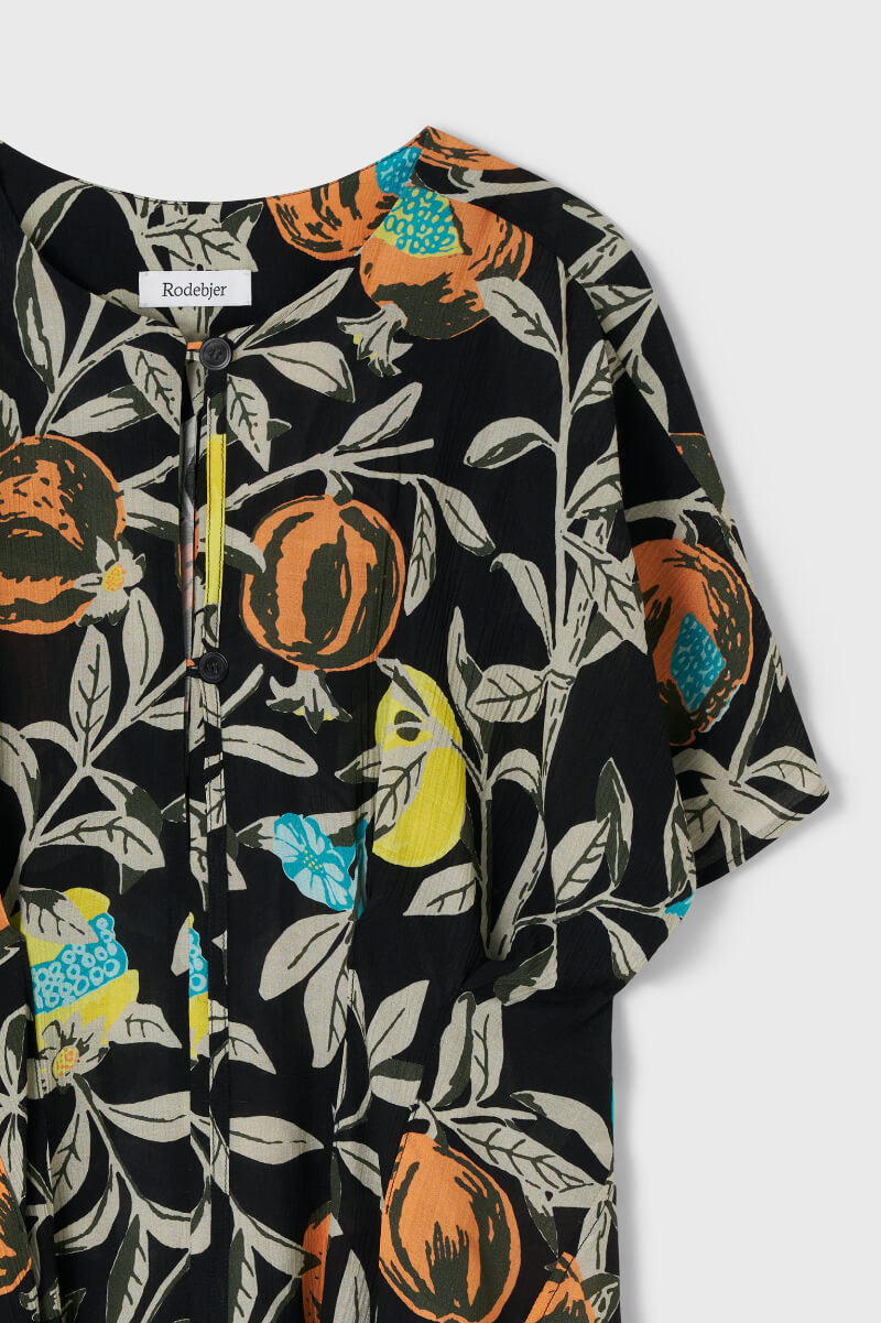Sval och självklar – den här svarta blusen med granatäpplemönster ger sommarlooken en konstnärlig twist. Den luftiga silhuetten och eleganta trycket gör den lika snygg till jeans som till en vid kjol. Ett statement utan att anstränga sig.Blus med veckade detaljer i midjan, oversize passform, stängs med knappar fram och korta ärmar från Rodebjer.
