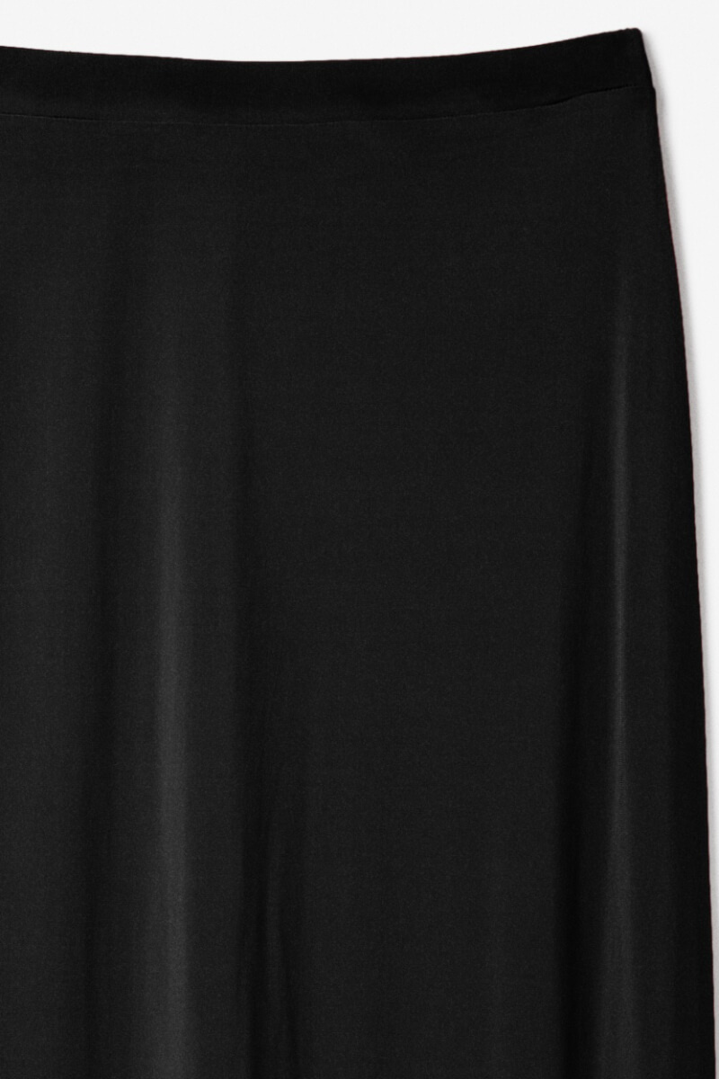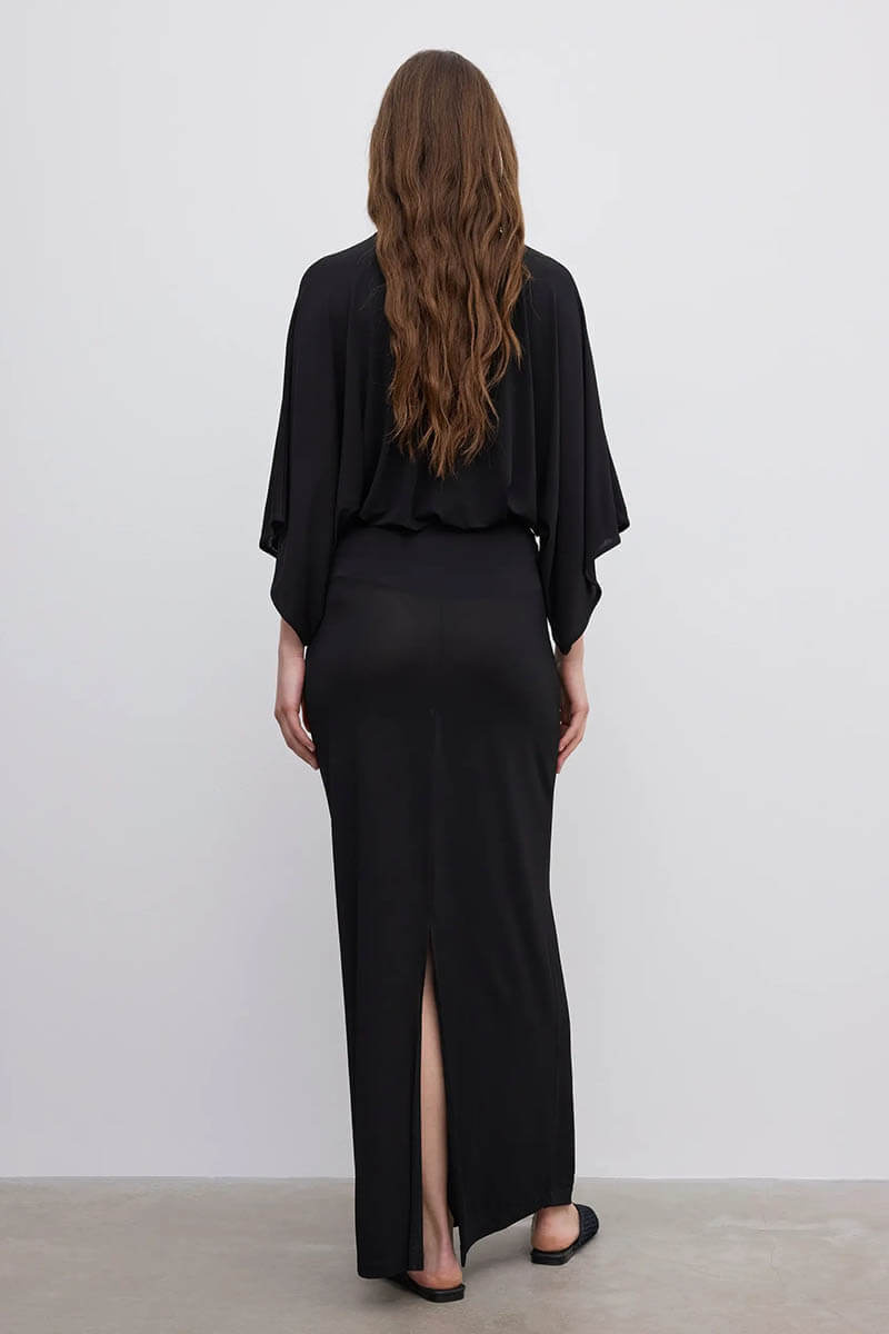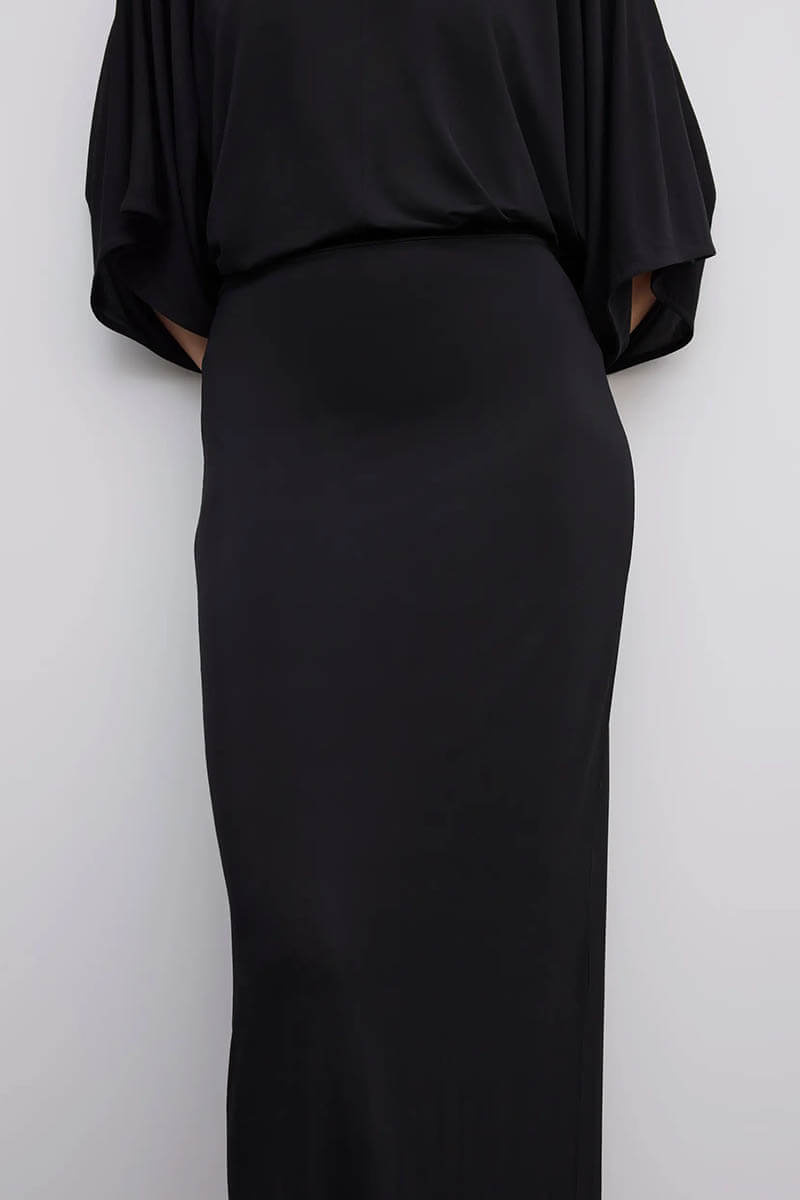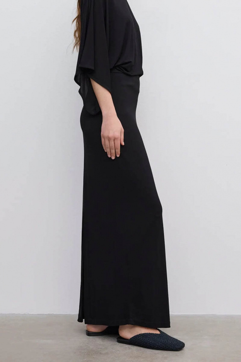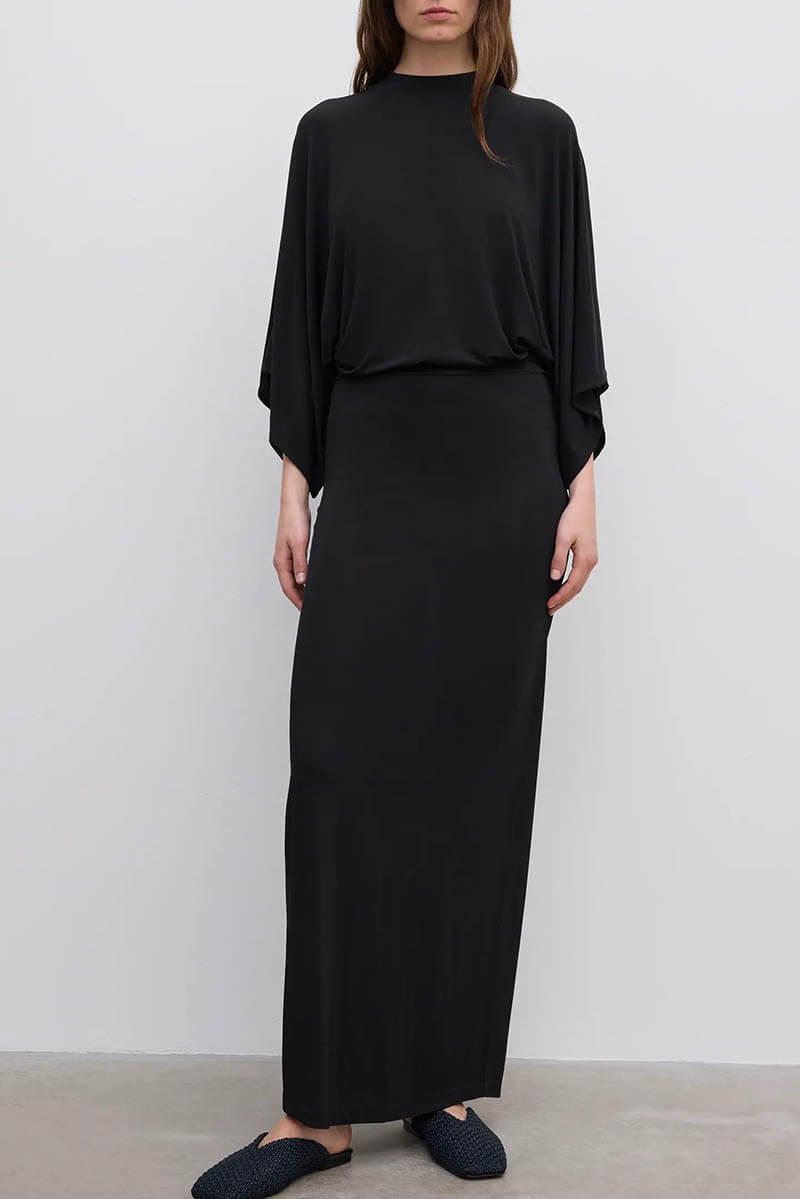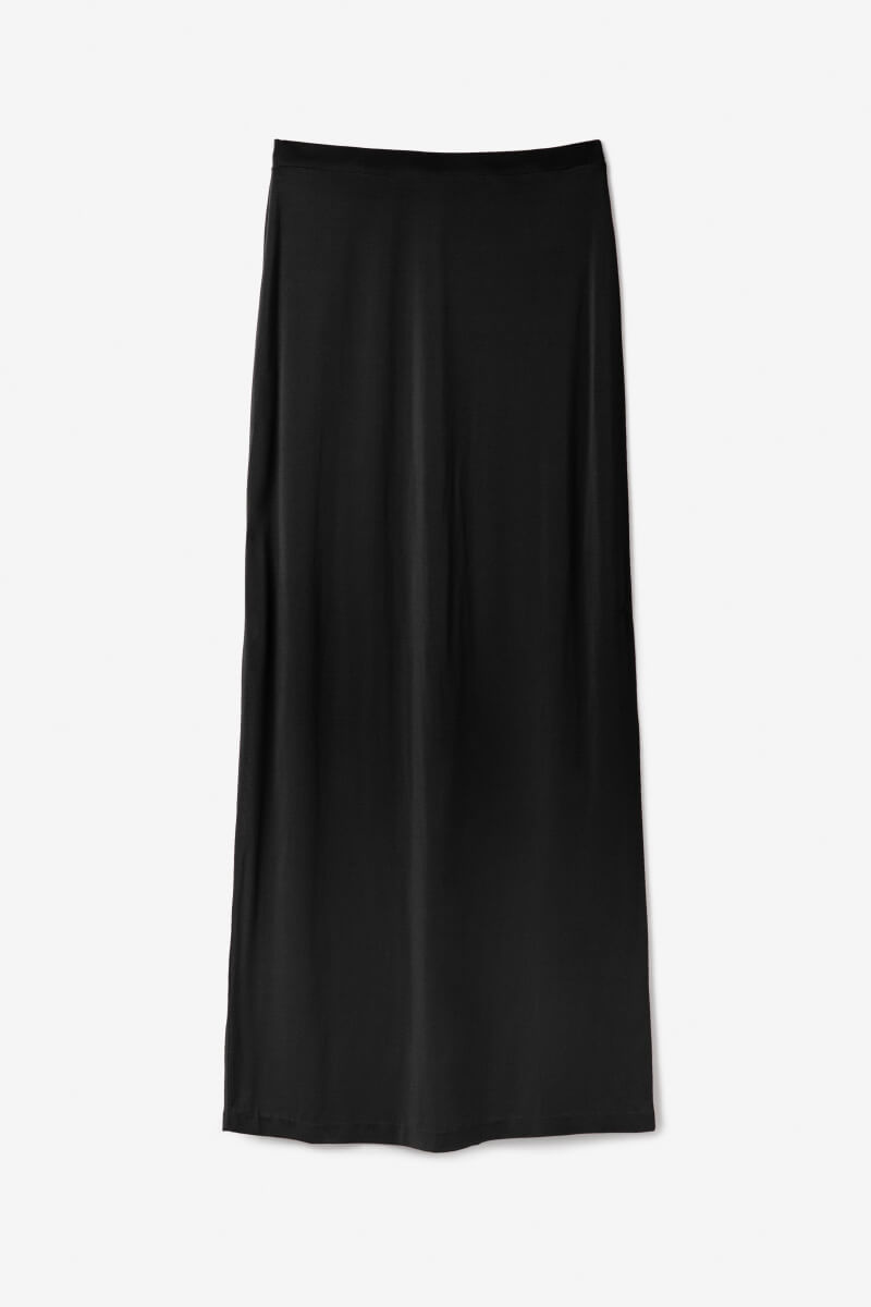 En svart jersey maxikjol med rak passform ger det där diskreta modet som känns rätt nu. Kombinera med linne, smala solglasögon och ballerinas. En stilren kjol i lyxigt fall – enkel, sval och självsäker.Maxilång jerseykjol i en viskosblandning med elastisk midjeband, slits bak, smal och rak passform från Dagmar.