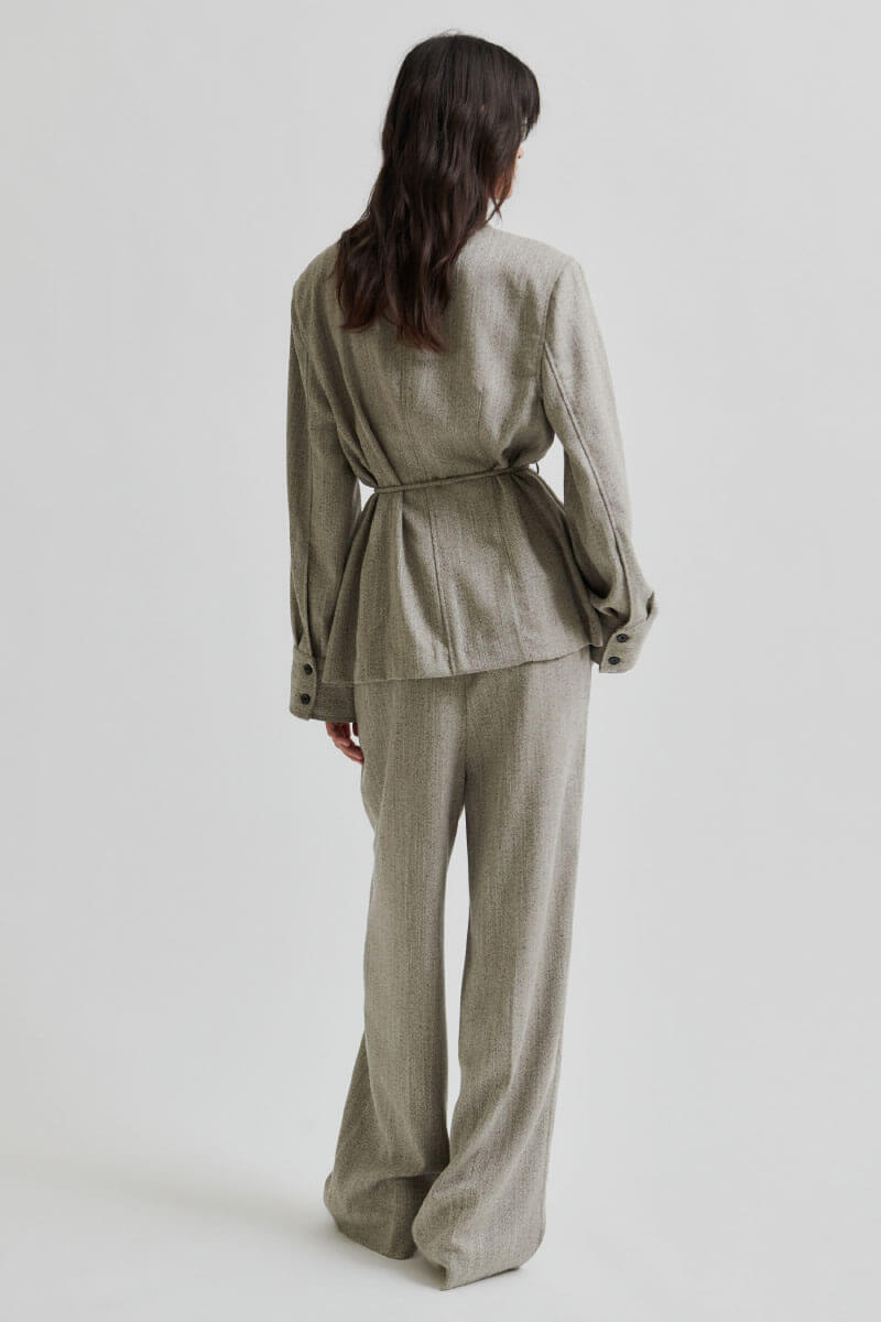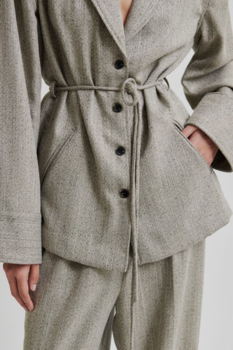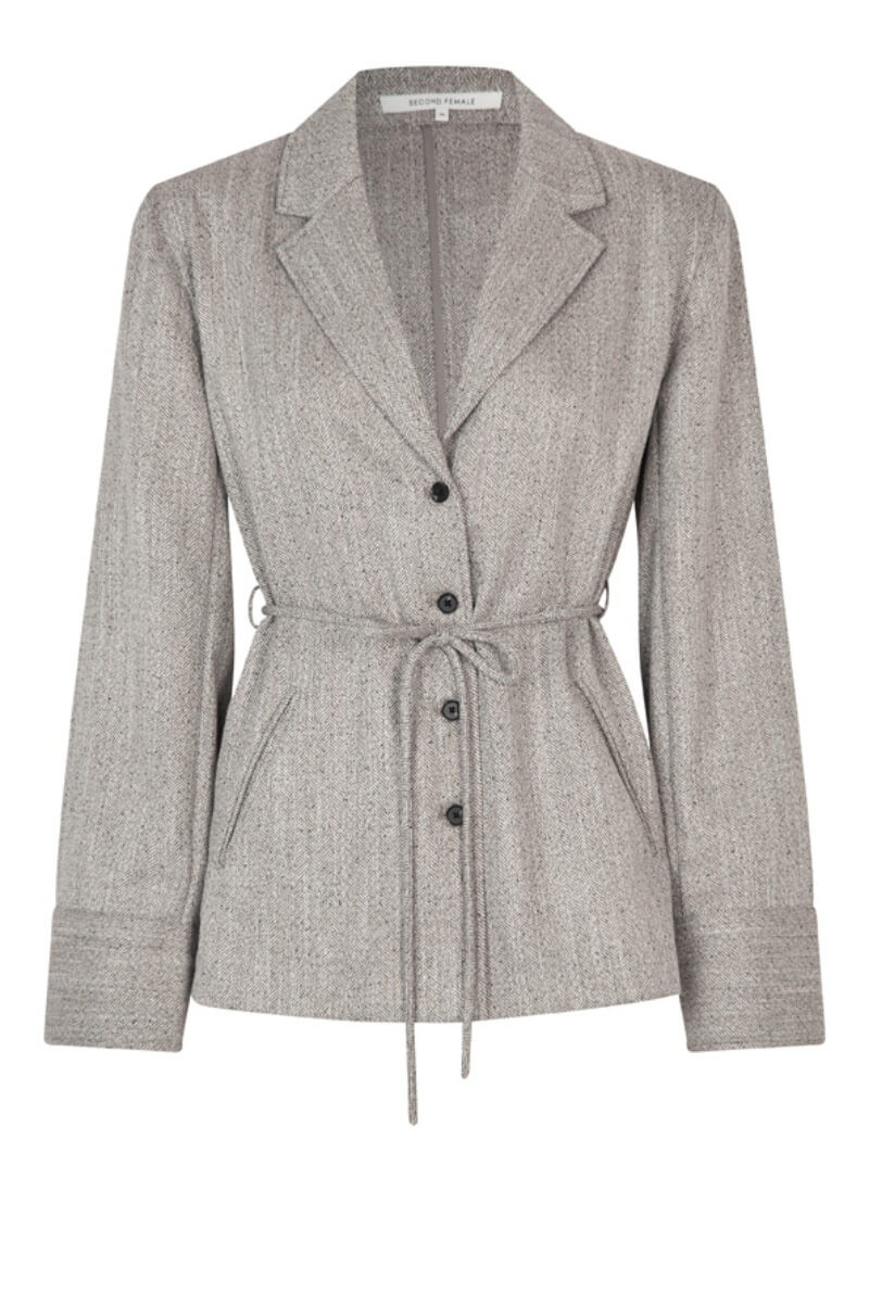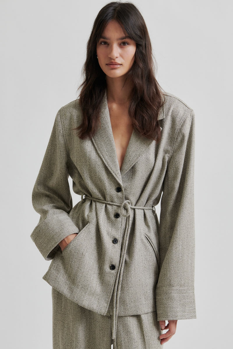 Kavajen med knytskärp som ger struktur utan att kännas strikt. Bär med vida kostymbyxor eller över en mjuk stickad klänning. En tidlös, kvinnlig silhuett och textur i grå melange. Raffinerad och avslappnad på samma gång.Mjuk kavaj i en viskosblandning med ledig passform, fickor i sidan, stängs med knappar fram och matchande bälte i midjan från Second Female.
