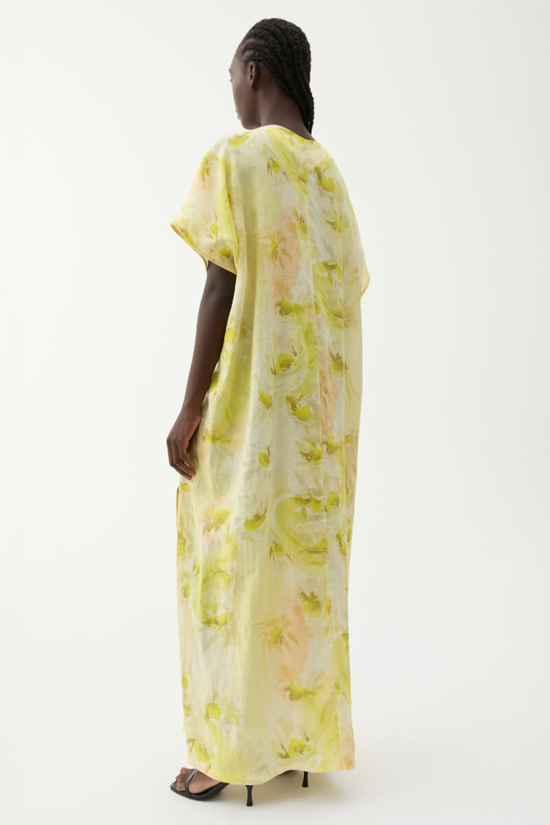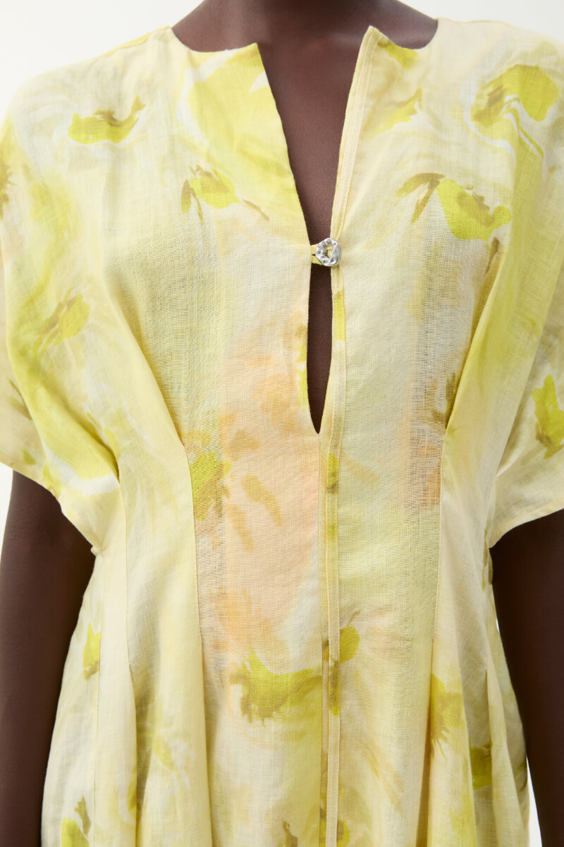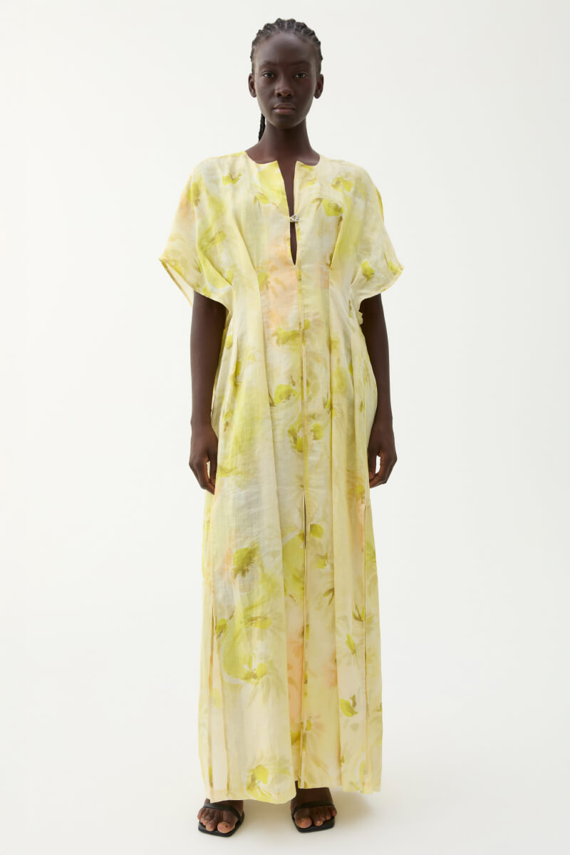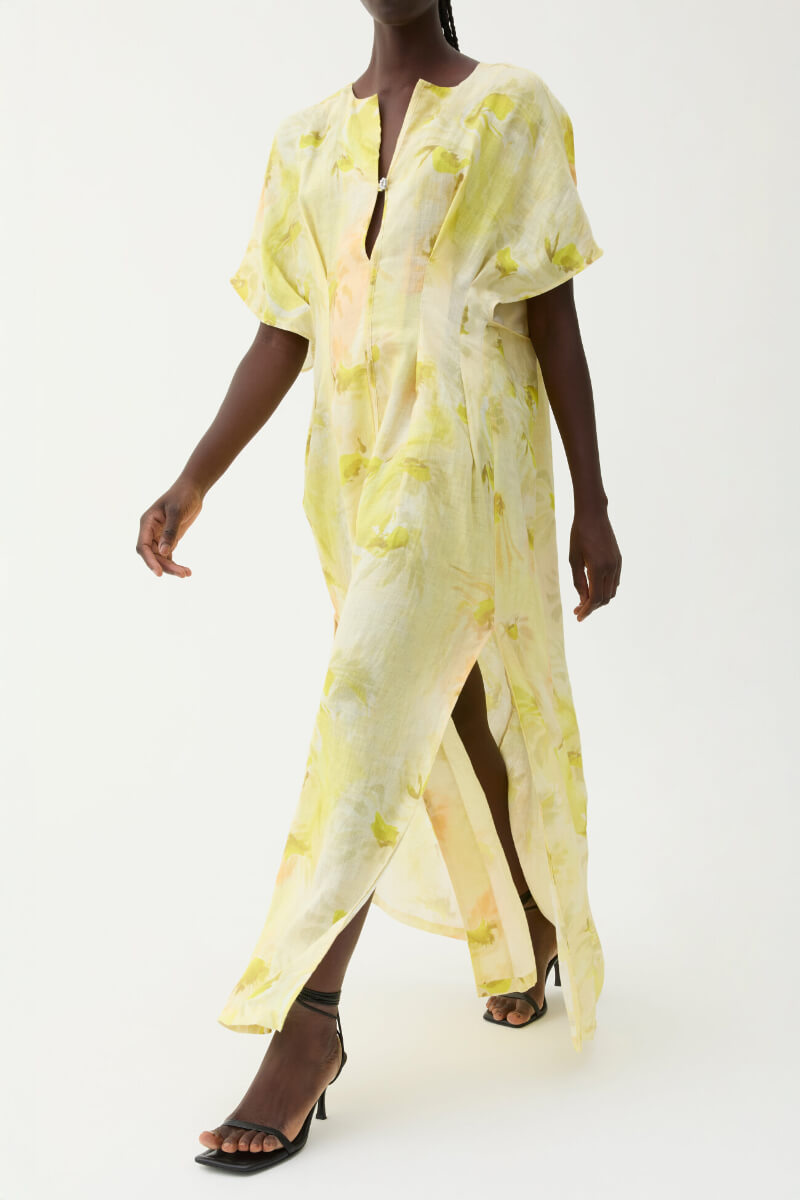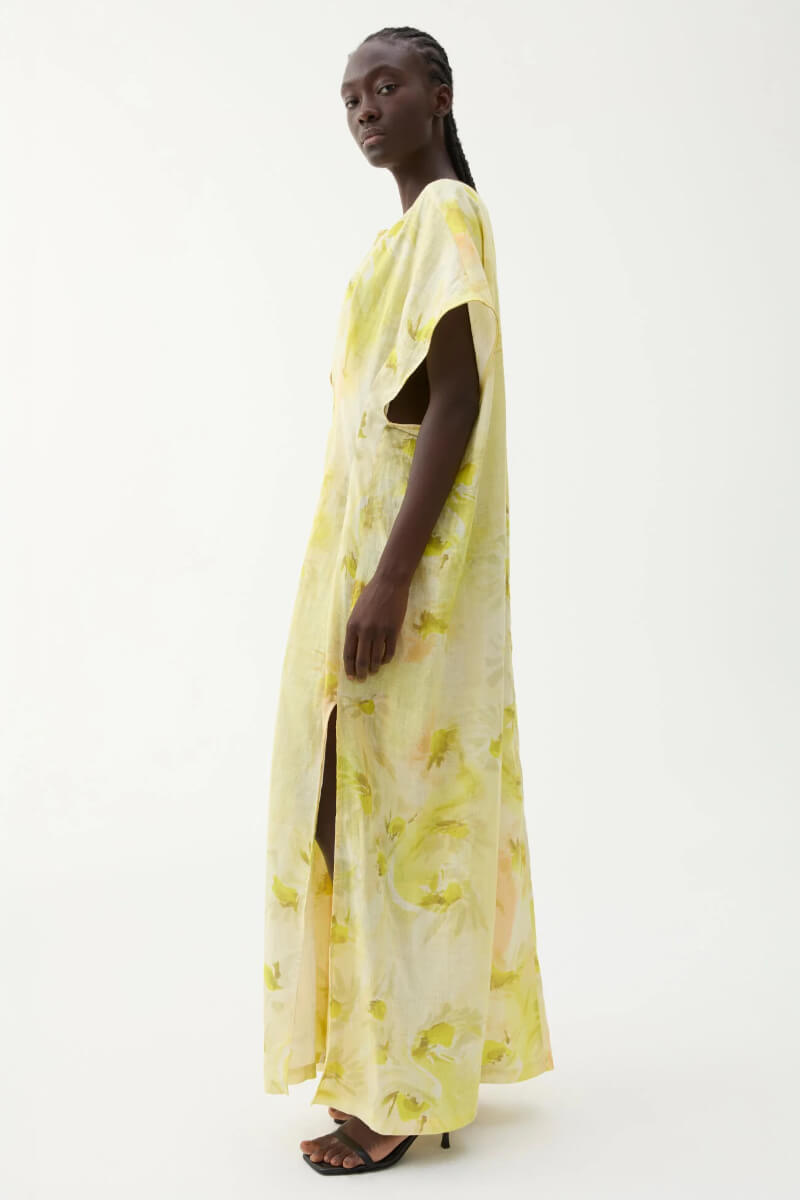 Som en solig dag i tygform. Den här luftiga maxiklänningen i linne med subtilt blommönster för tankarna till semesterdrömmar och härliga dagar. Ett sommarplagg du aldrig tröttnar på – och alltid vill packa ner.Maxiklänning i linne med veckade detaljer i midjan, avslappnad passform, stängs med en knapp fram, slitsar fram och i sidan från Rodebjer.