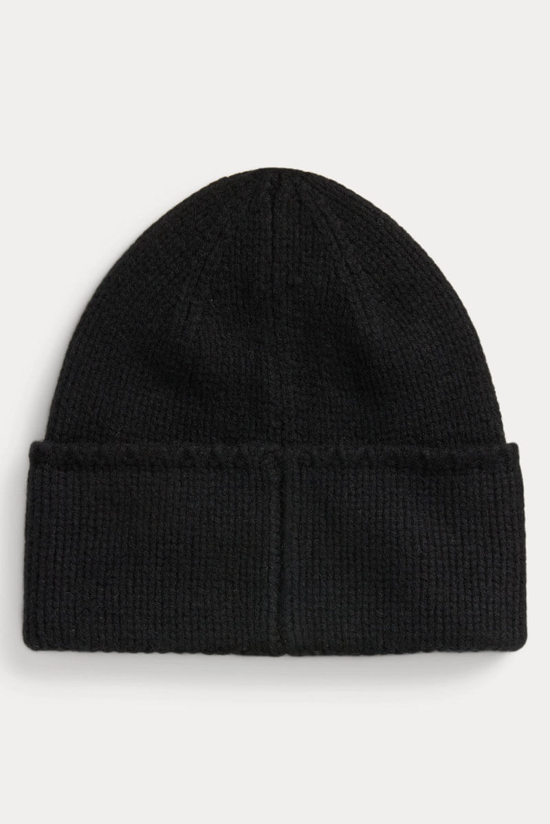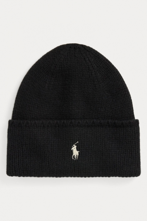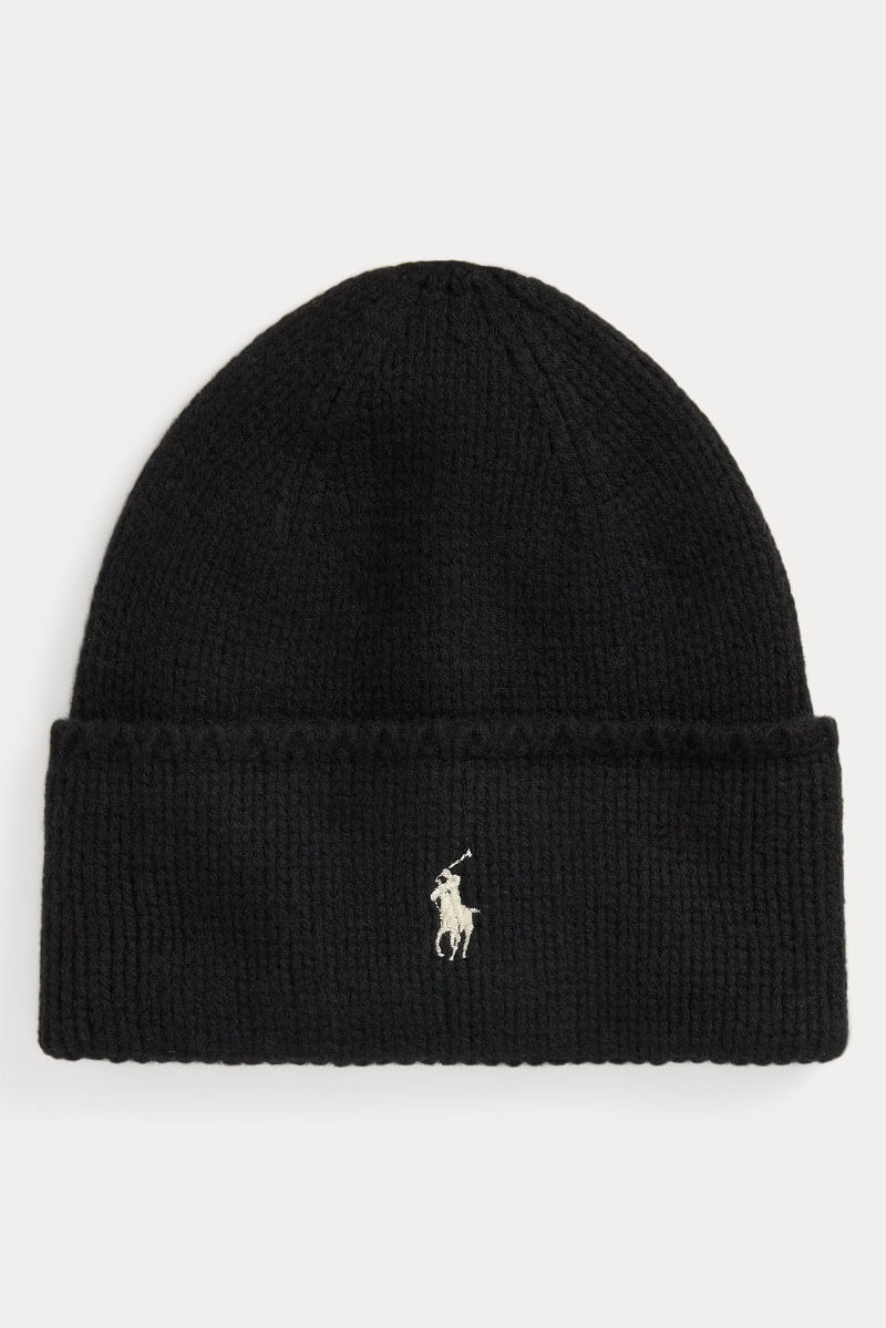 Lyft din vinterstil med denna svarta stickade mössa i ull. Mjuk, varm och tidlös, ger den både komfort och elegans. Perfekt för att komplettera din look under kalla dagar.Stickad mössa i ull med uppvikt kant, liten broderad logga fram och ej fodrad från Polo Ralph Lauren.