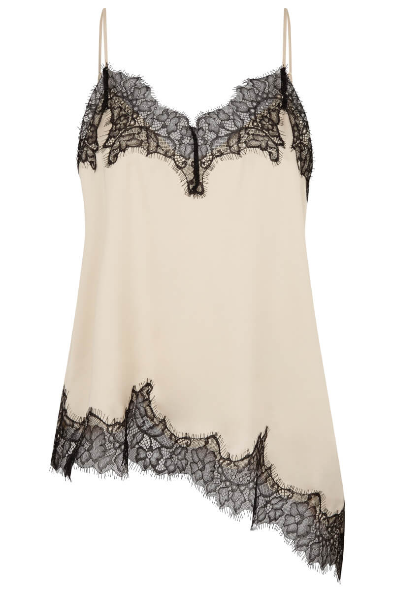 Ett elegant linne med asymmetrisk skärning nertill som ger en modern silhuett med en romantisk touch. Toppen är tillverkad i en mjuk viskosblandning som faller vackert mot kroppen och kompletteras av tunna axelband för en lätt och feminin look. Perfekt att bära under stickad tröja med antingen kjol och byxa.
