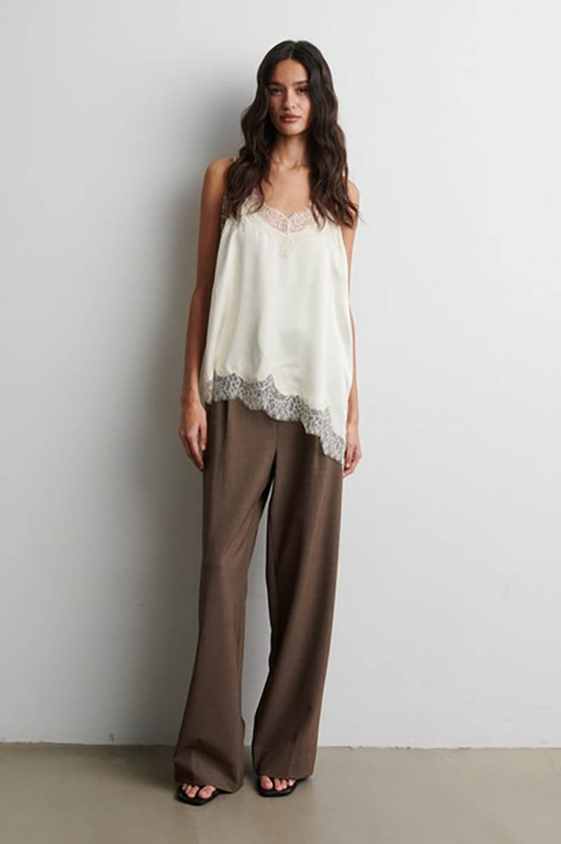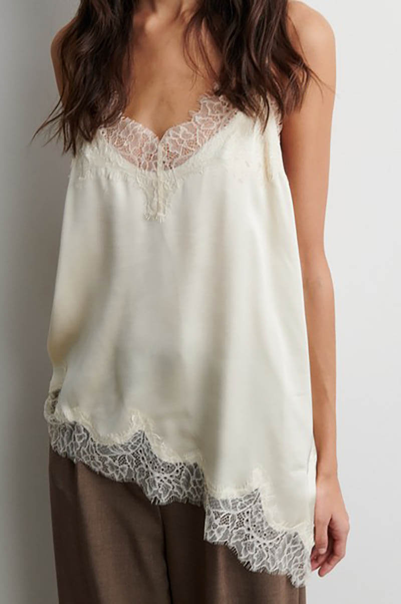 Ett elegant linne med asymmetrisk skärning nertill som ger en modern silhuett med en romantisk touch. Toppen är tillverkad i en mjuk viskosblandning som faller vackert mot kroppen och kompletteras av tunna axelband för en lätt och feminin look. Perfekt att bära under stickad tröja med antingen kjol och byxa.