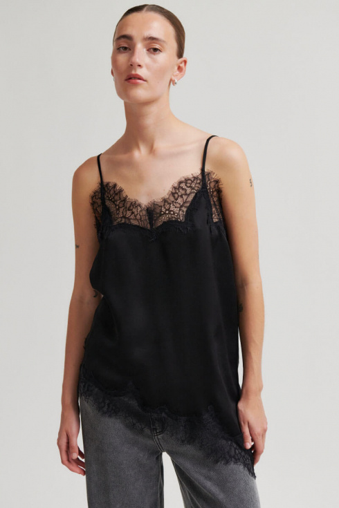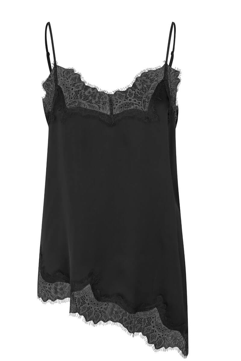 Ett elegant linne med asymmetrisk skärning nertill som ger en modern silhuett med en romantisk touch. Toppen är tillverkad i en mjuk viskosblandning som faller vackert mot kroppen och kompletteras av tunna axelband för en lätt och feminin look. Perfekt att bära under stickad tröja med antingen kjol och byxa.