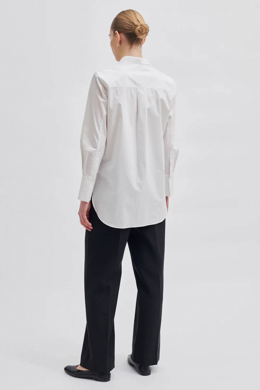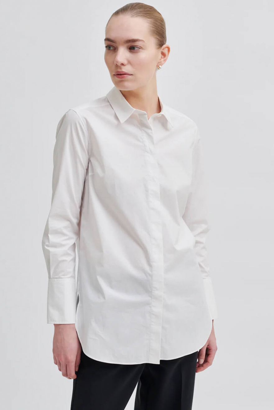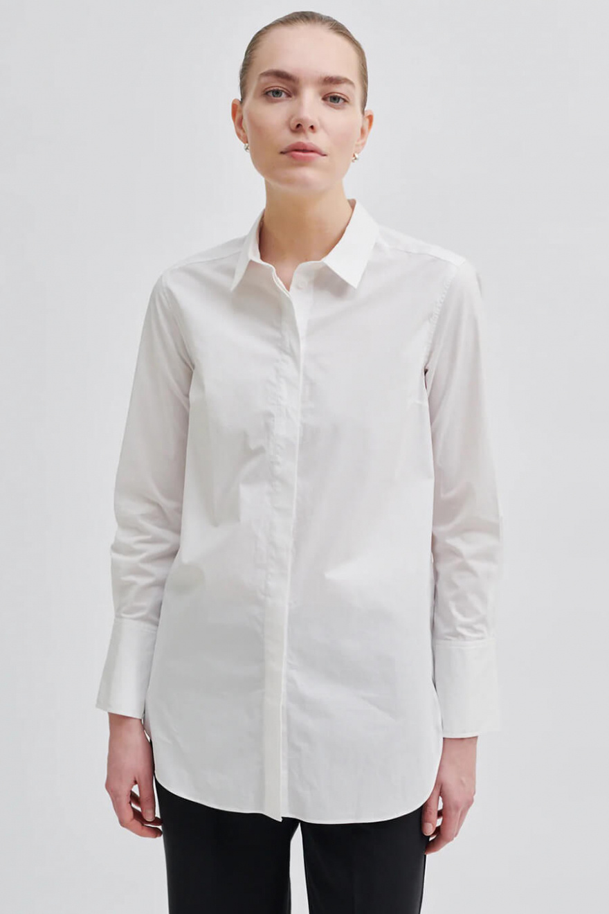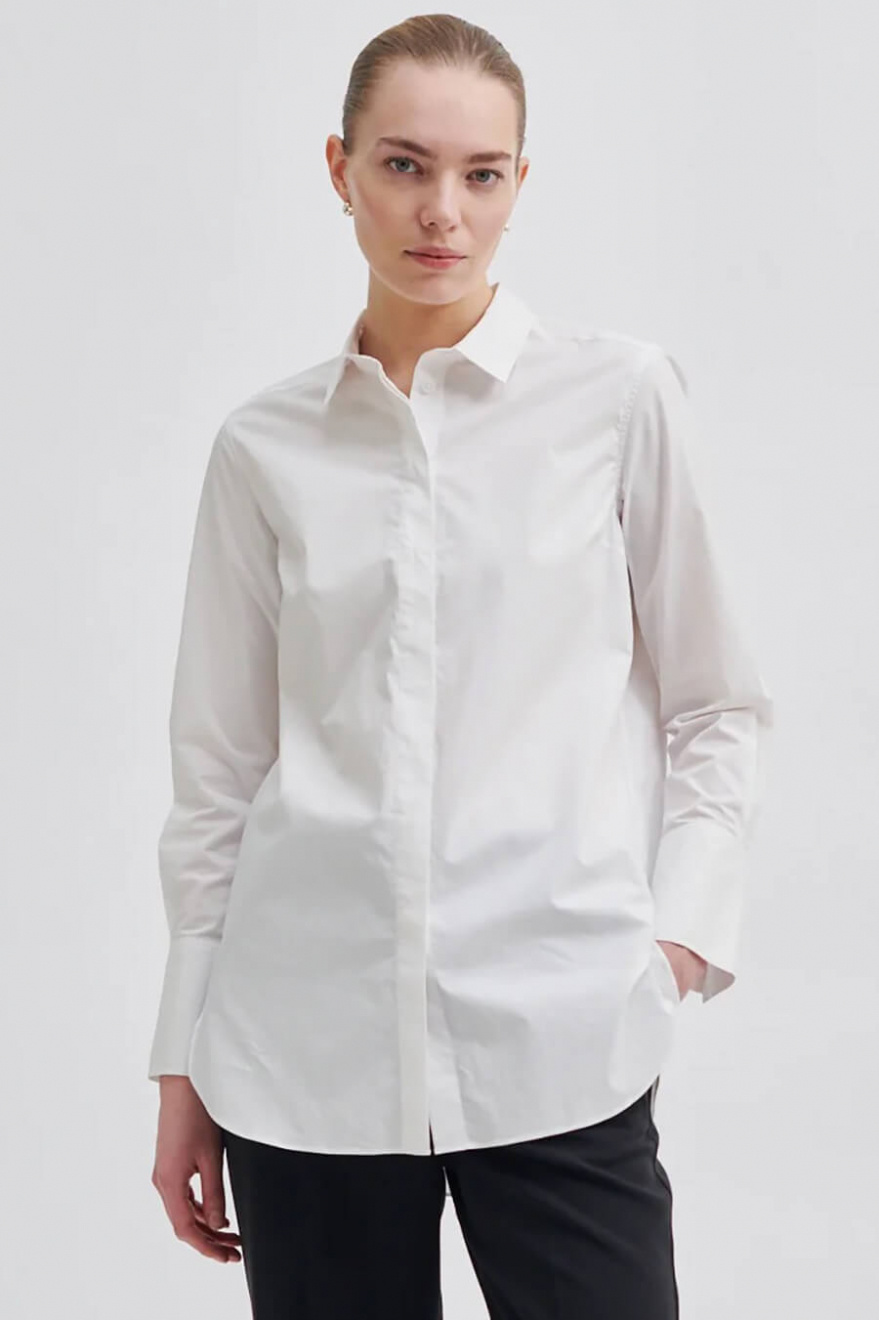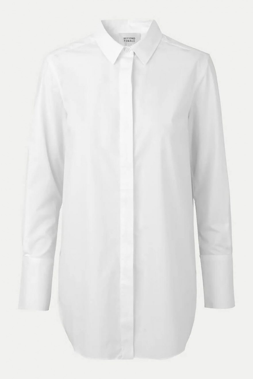 En vit skjorta i krispig bomull är det ultimata uttrycket för sofistikerad enkelhet. Med sin rena design och lediga passform ger den en tidlös elegans som fungerar både till jobbet och mer avslappnade tillfällen.Skjorta i en krispig bomull med ledig passform, stängs med gömda knappar fram, slits i sidan och vid ärmslut från Second Female.