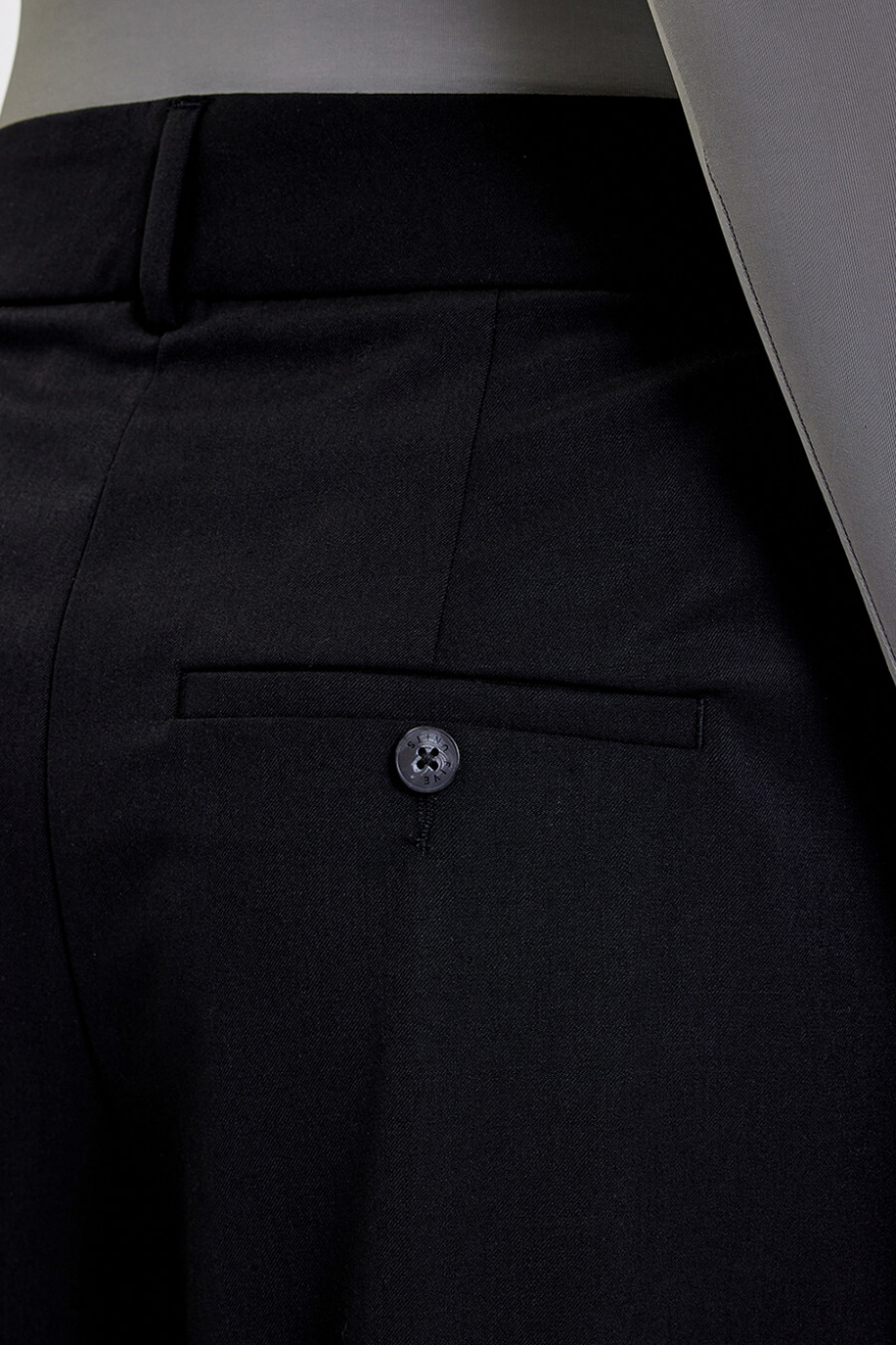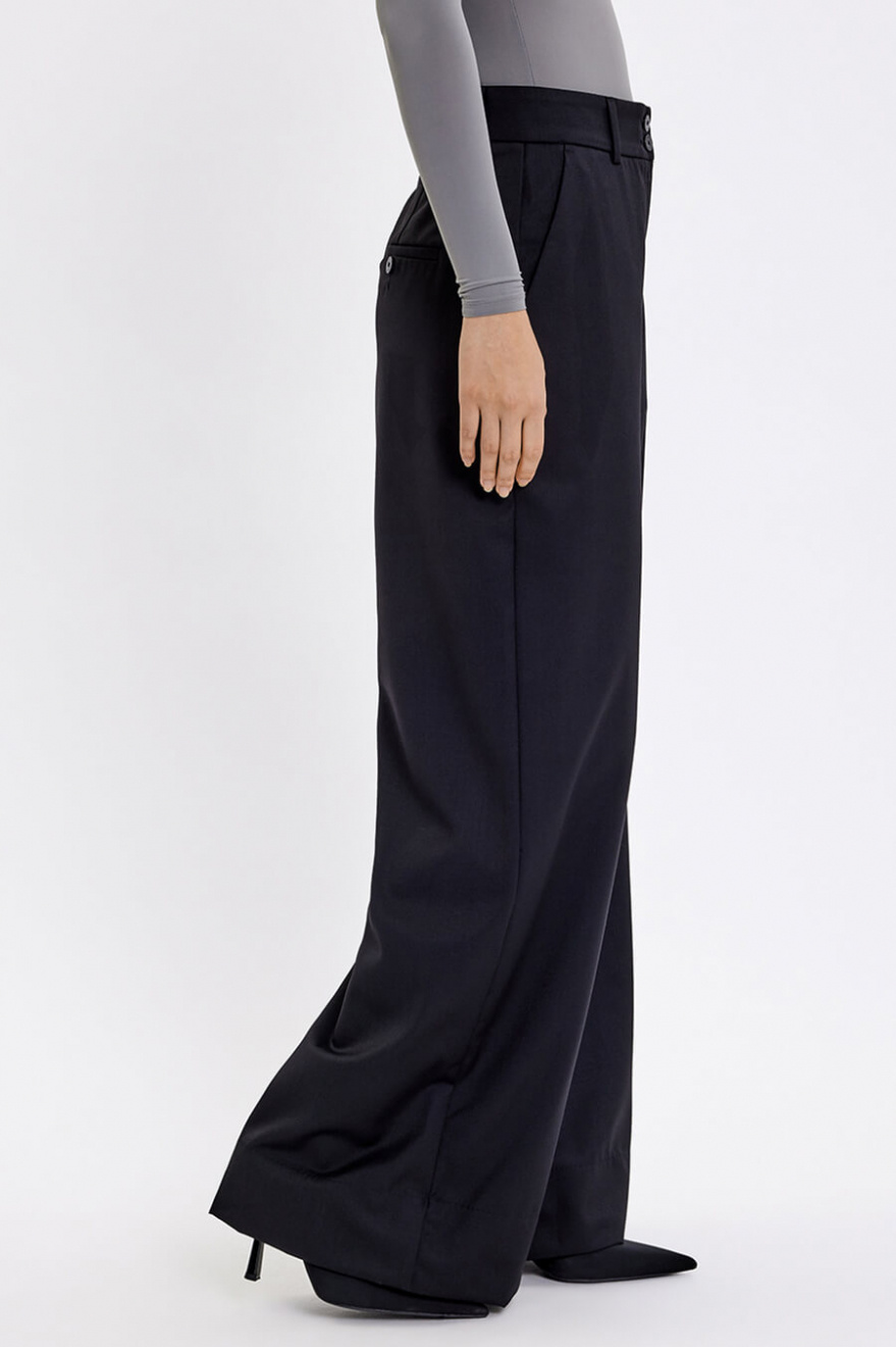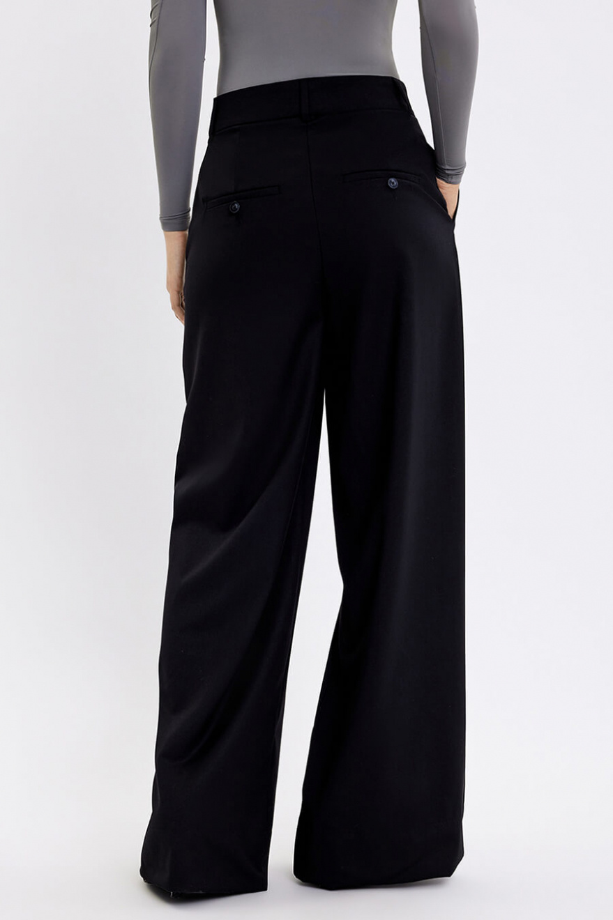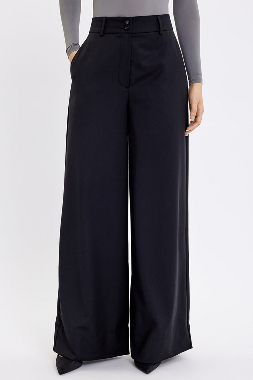 Dessa vida byxor i svart färg ger en sofistikerad och modern silhuett. Med hög midja och skräddad passform kombinerar de komfort och stil. Perfekta för både arbetsdagen och kvällsevent, blir de en tidlös nyckel i garderoben.Byxa i en vid passform med fickor i sidan, hög midja, ben i full längd, stängs med dragkedja och knappar från Five Units.