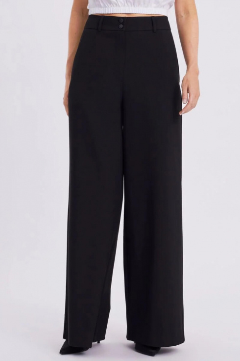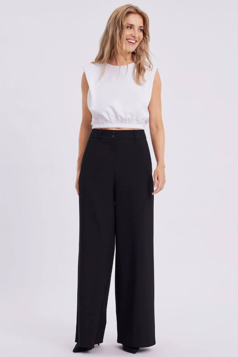 Svarta, vida byxor med en elegant fall och markerad midja – lika stilrena på kontoret som till middagen. Bär dem med en silkig blus och klackar, eller stickat och loafers för en mer avslappnad men genomtänkt look.Byxa i en vid passform med fickor i sidan, hög midja, stängs med dragkedja och knappar från Five Units.
