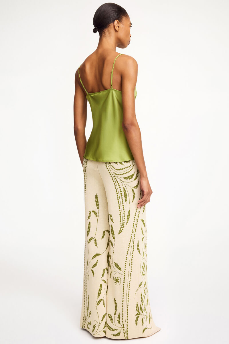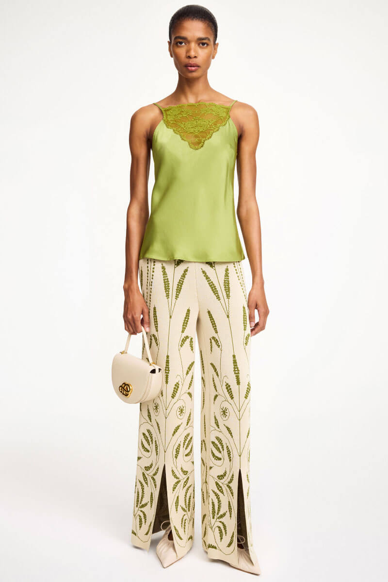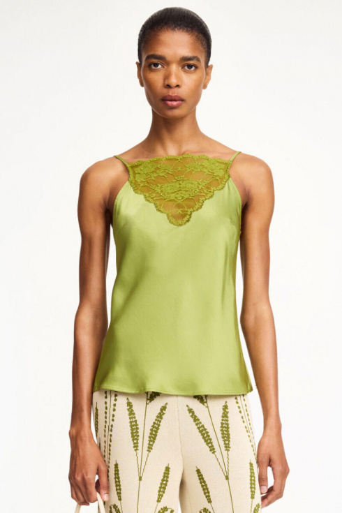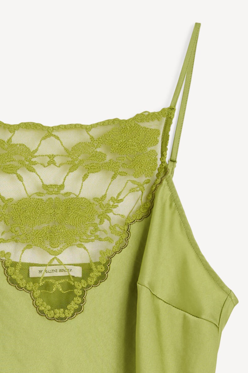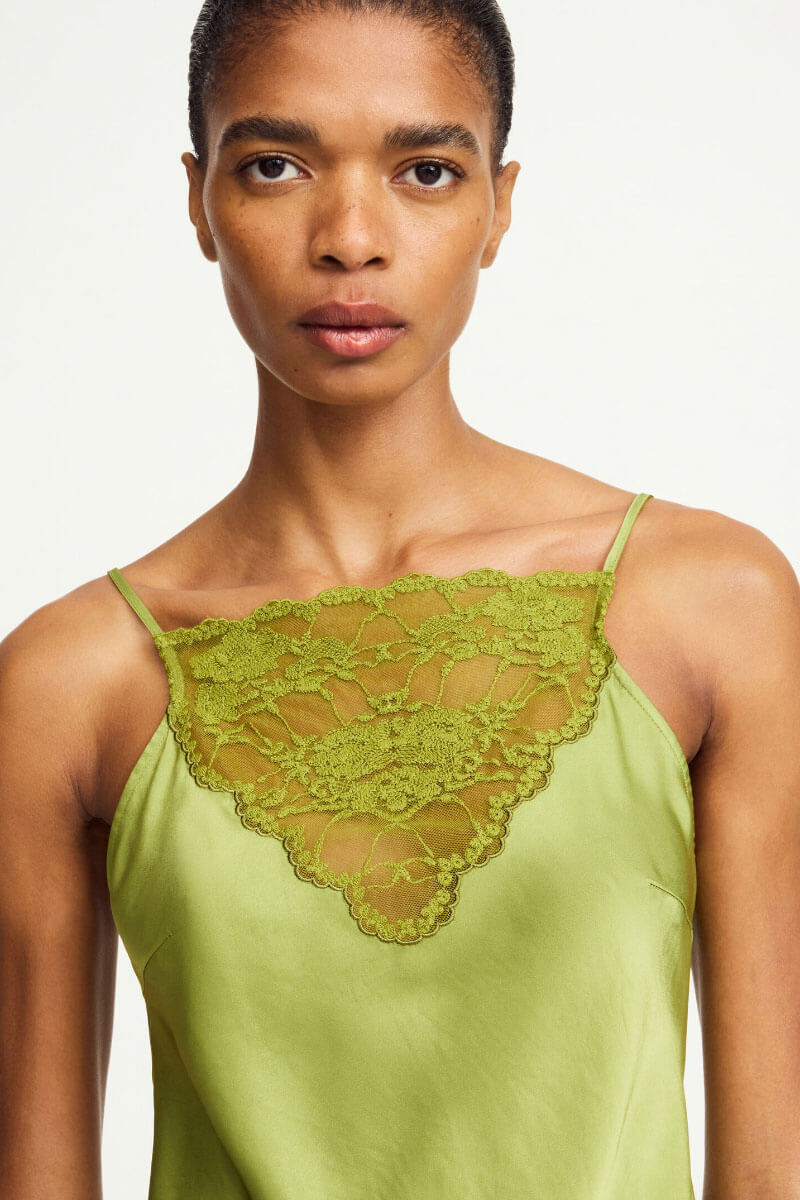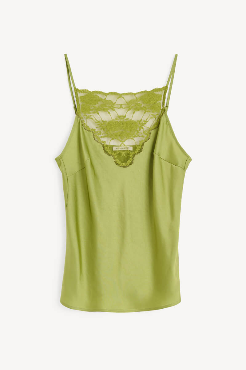 Ett spetskantat linne i syrligt grönt med blank finish och smala axelband – där mjuk lyster möter chic. Bär det till jeans, kostym eller under kavaj. En silkeslen statementpiece som förvandlar enkel styling till något minnesvärt.Mjukt linne i en fin glans med spetsdetaljer fram, justerbara axelband och normal passform från By Malene Birger.