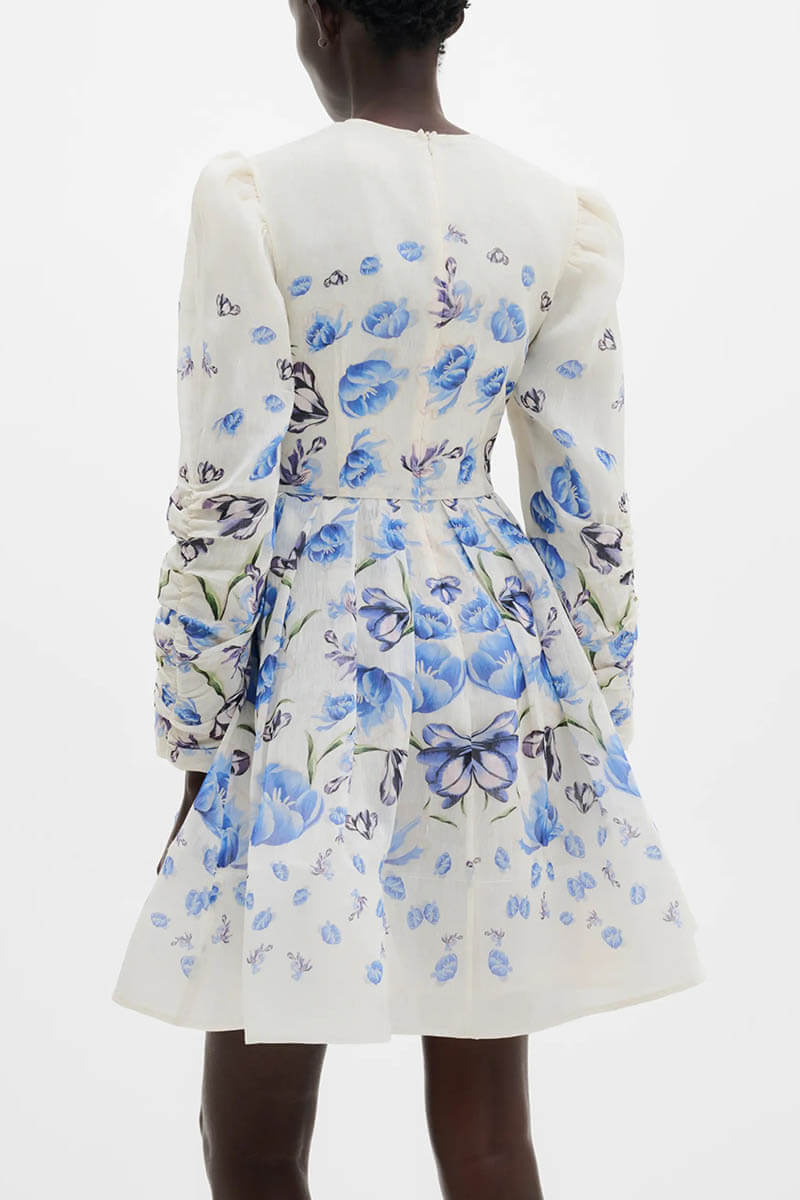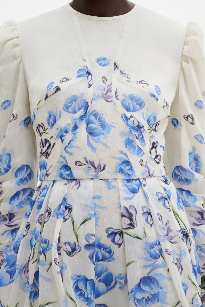 En drömlik miniklänning som andas exklusivitet och hantverk. Det vackra blommönstret i blå toner kombineras med lyxiga detaljer som kontrastsömmar och plisserade partier, vilket skapar en vacker silhuett som är perfekt för bröllop, dop eller sommarens finaste fester.