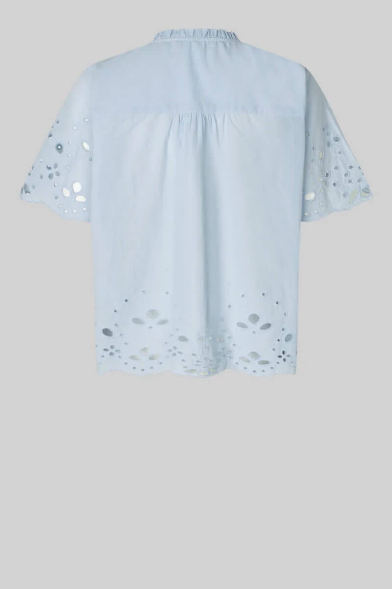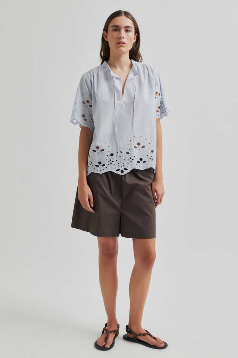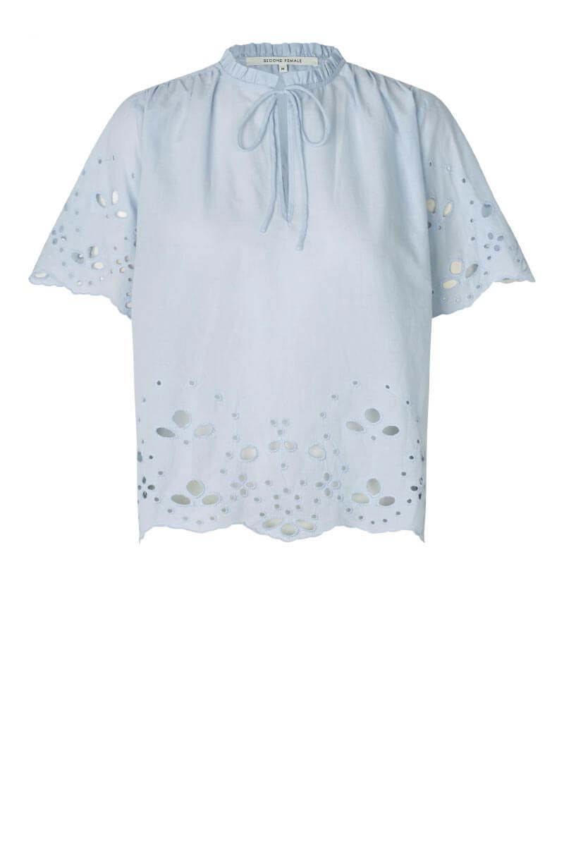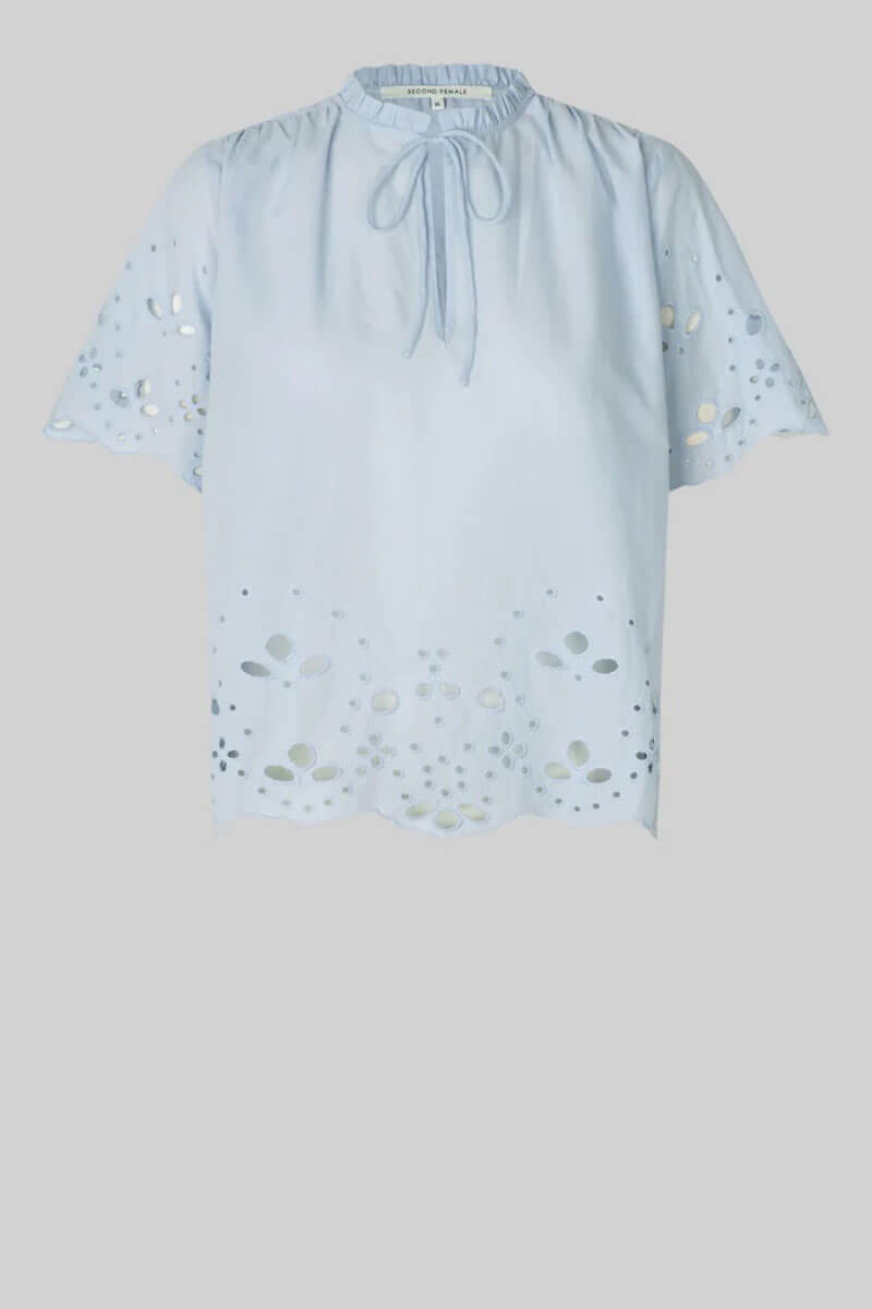 Denna ljusblåa blus i bomull med broderade detaljer och romantisk knytning. Den perfekta blusen till både jeans och kjol – en garderobsfavorit som lyfter varje vår- och sommarlook med enkel elegans.Tunn och mjuk topp i bomull med lös passform, korta vida ärmar, hög halsringning med knyt fram från Second Female.
