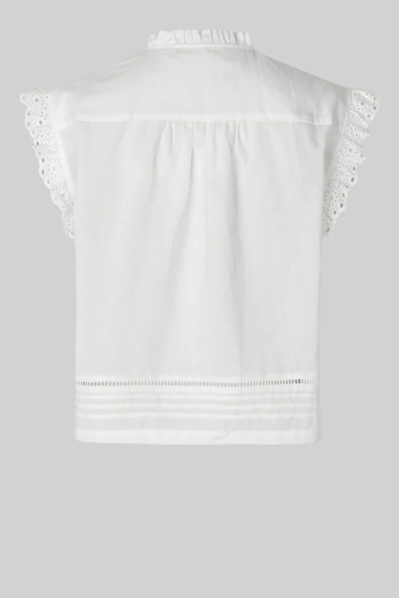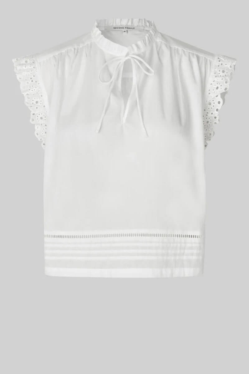 Den vita bomullstoppen – feminin, luftig och lätt att bära. Broderade ärmar adderar en romantisk touch. Matcha med denim eller linne för en tidlös look du vill bära om och om igen.Tunn och mjuk topp i bomull med ledig passform, korta ärmar med volanger, hög halsringning med knyt fram från Second Female.