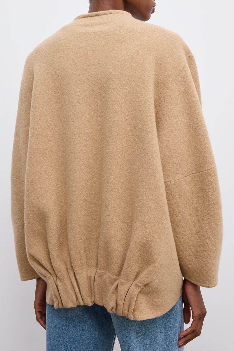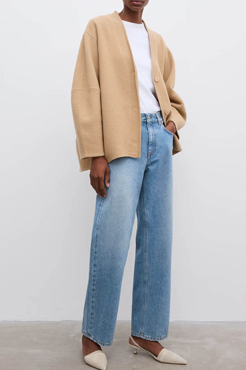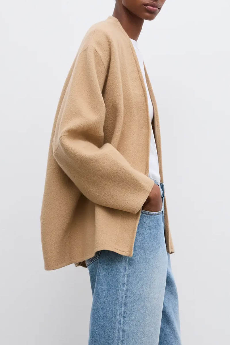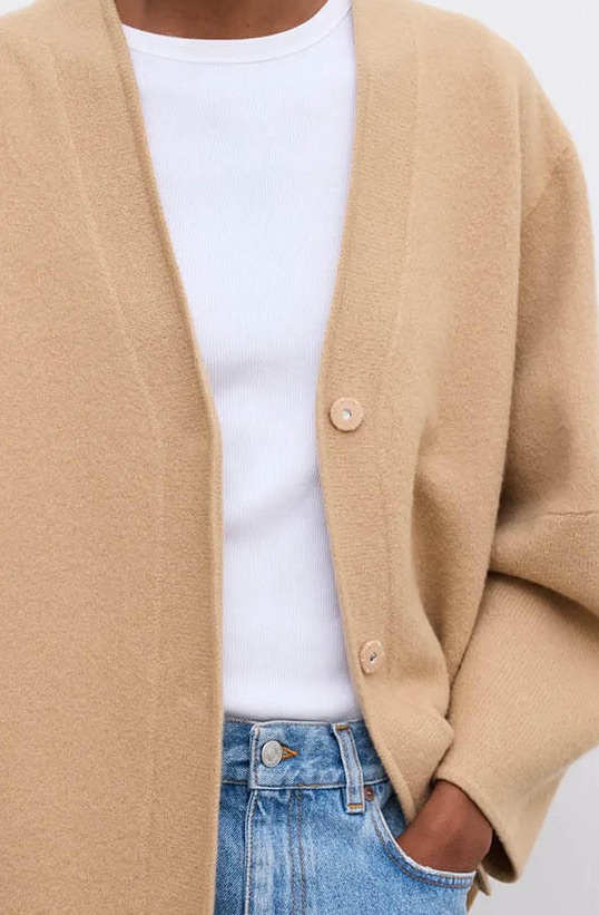 Den är designad med en lätt oversized silhuett, nedhasade axlar och en smickrande V-ringning. Koftan har dolda knappar framtill för ett rent och elegant uttryck.