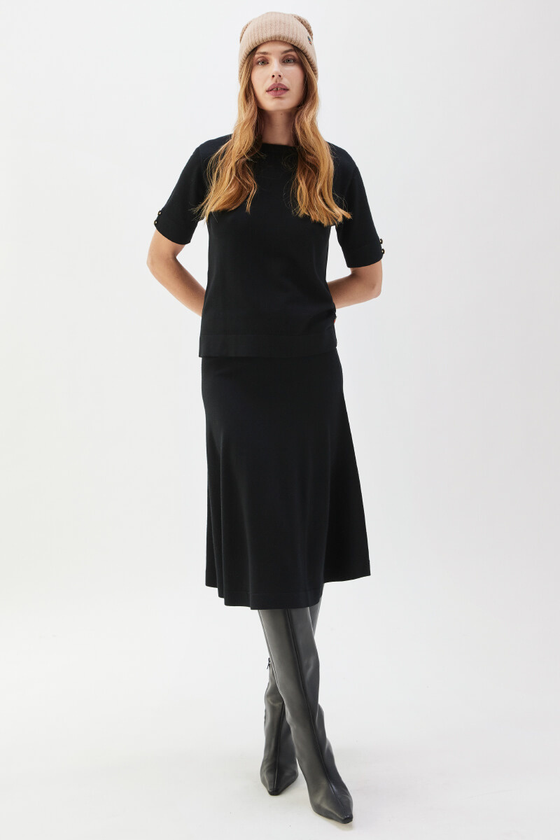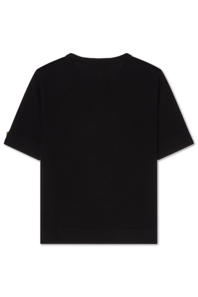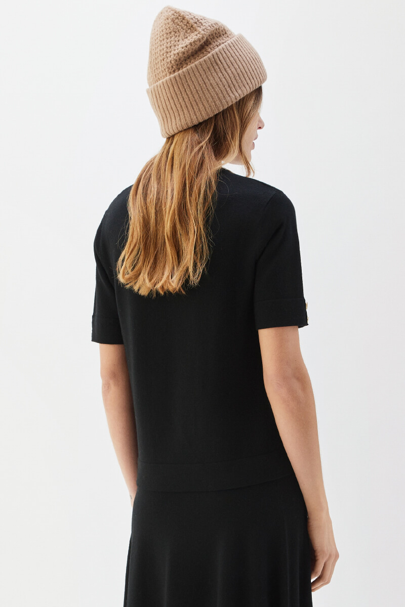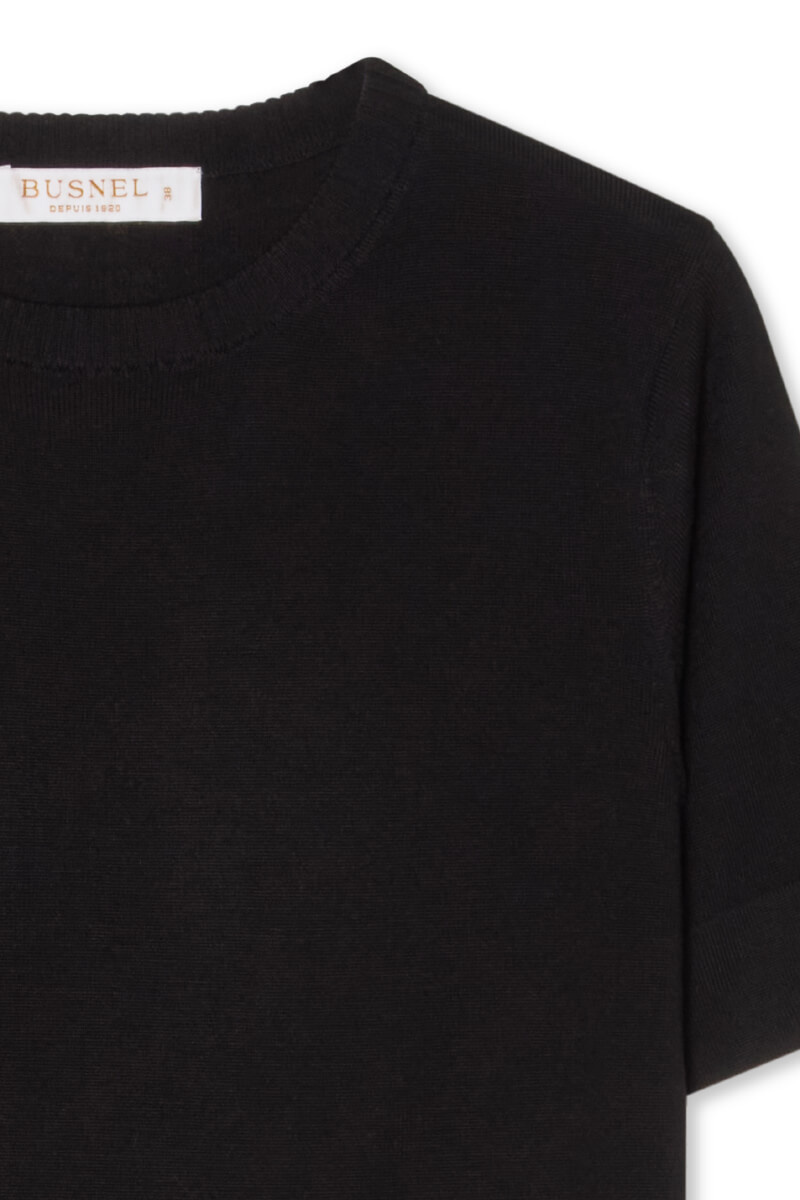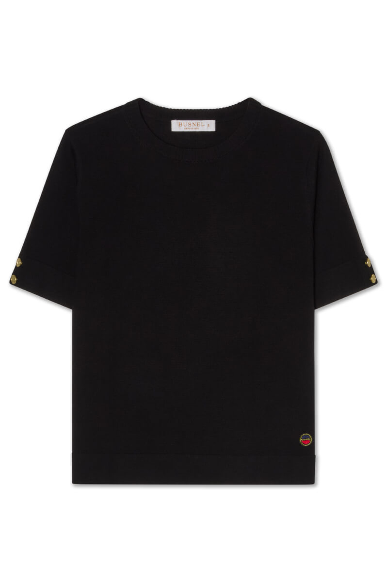 Svart stickad topp i normal passform med rund halsringning och korta ärmar. Kombinera med höga kostymbyxor och klackar för en sofistikerad silhuett, eller med denim och loafers för en avskalad men genomtänkt look som fungerar året runt.Stickad topp i mjuk ull med rund halsringning, dekorativa knappar på ärmarna, ribbade kanter och normal passform från Busnel.