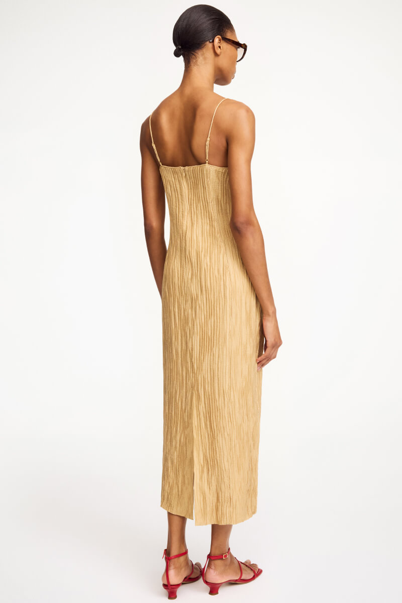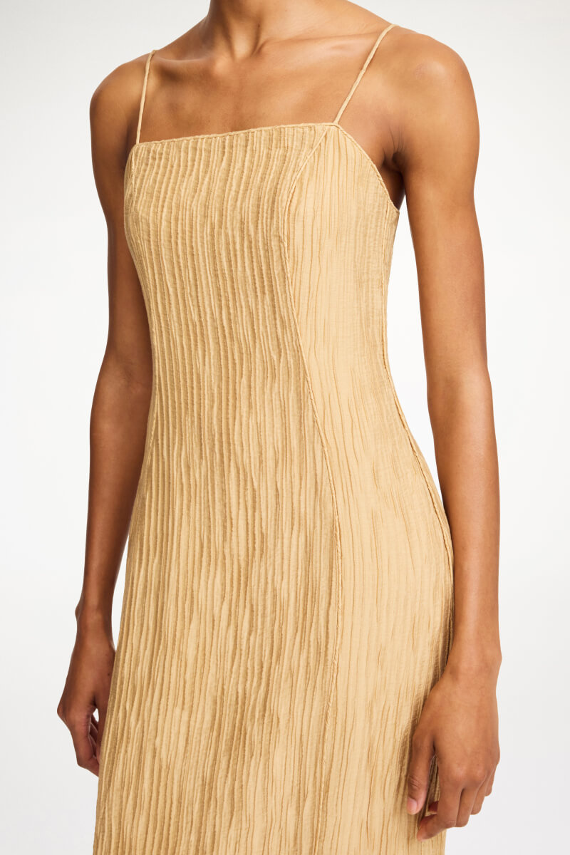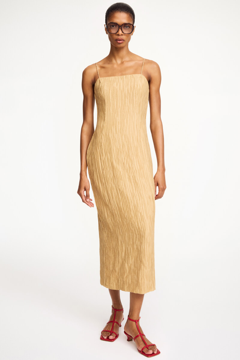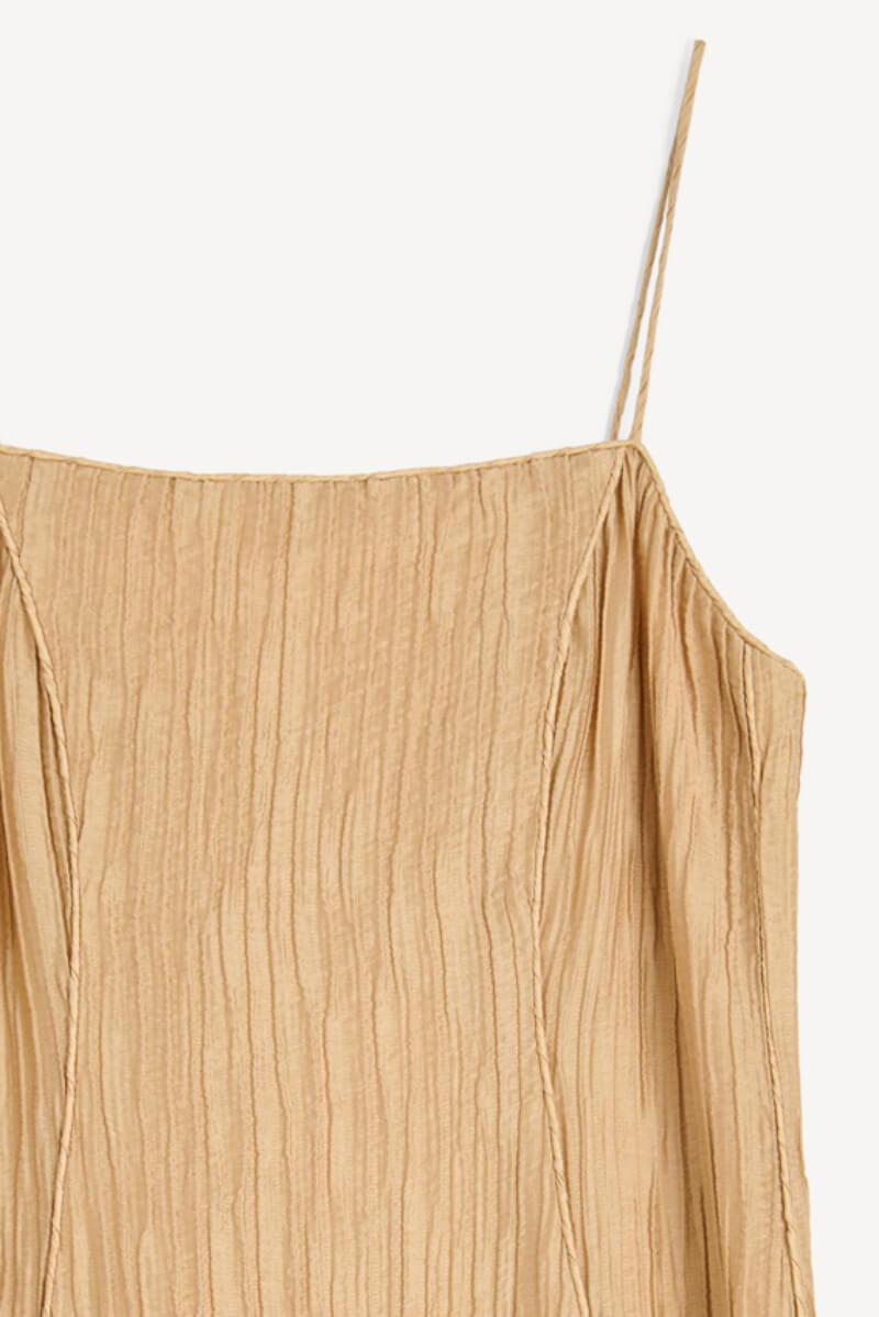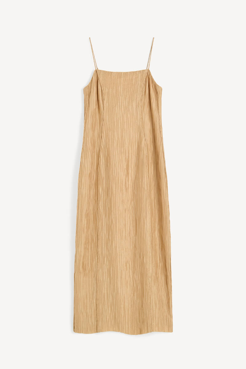 En plisserad midiklänning i varm beige ton, med tunna axelband och rak silhuett – enkelheten som alltid fungerar. Bär den med sandaler till sommarens alla tillfällen.Maxiklänning i en viskosblandning med rak halsringning, smal passform, justerbara axelband, slits bak och är fodrad från By Malene Birger.