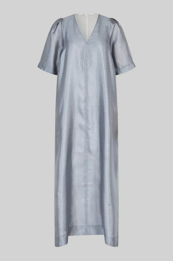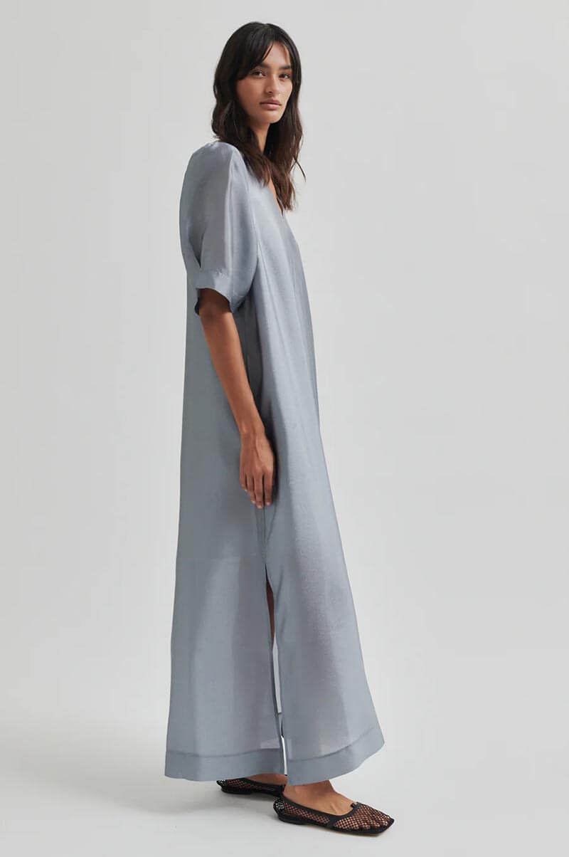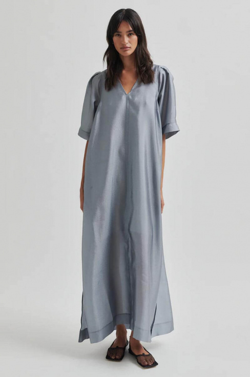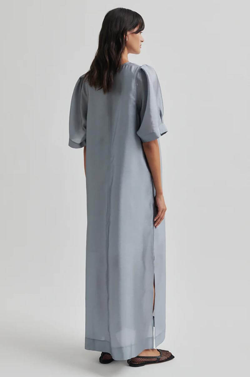 Sommaren blir ännu vackrare i denna ljusblå klänning – lätt, stilren och med ett skirt fall som rör sig elegant med varje steg. En perfekt klänning för sommarens finare tillfällen, från bröllop till kvällsevent.Maxiklänning i en glansig återvunnen blandning med lös passform, något puffiga ärmar, fodrad till knät, v-ringning, A-formad och fickor i sidan från Second Female.